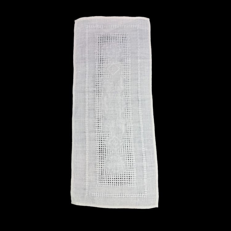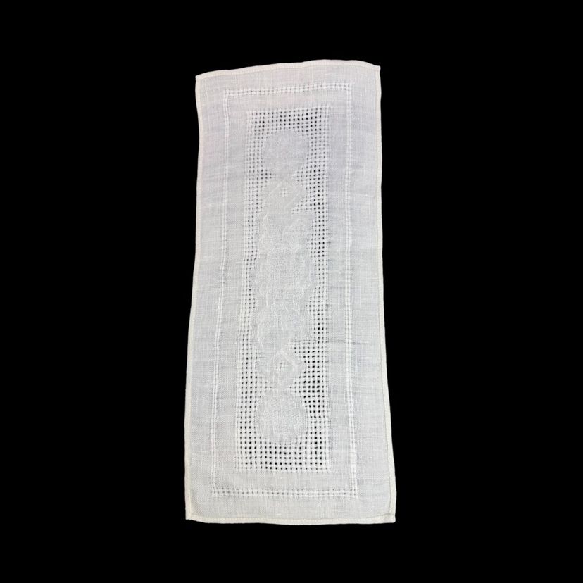 Fine quality linen doily. Slightly aged ivory. Features a center panel with openwork and damask in a floral and geometric design. Excellent condition. No marks or tears. 6”x14”