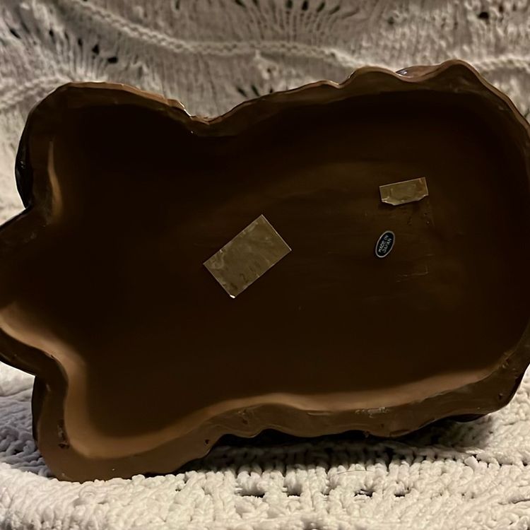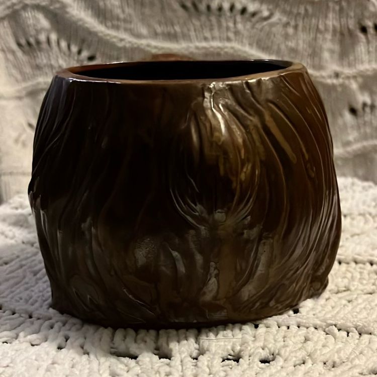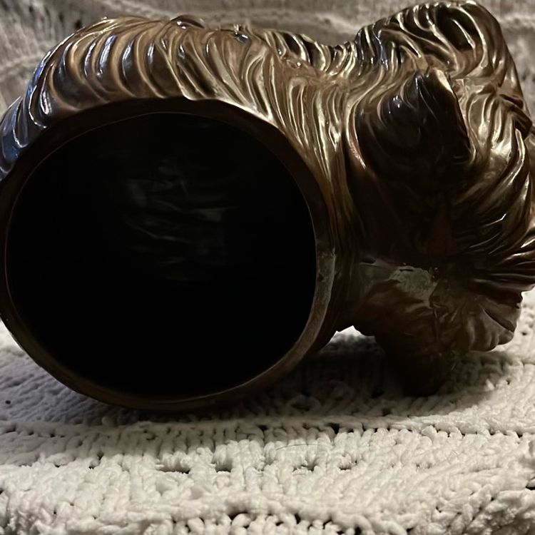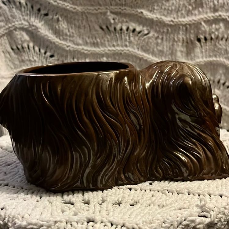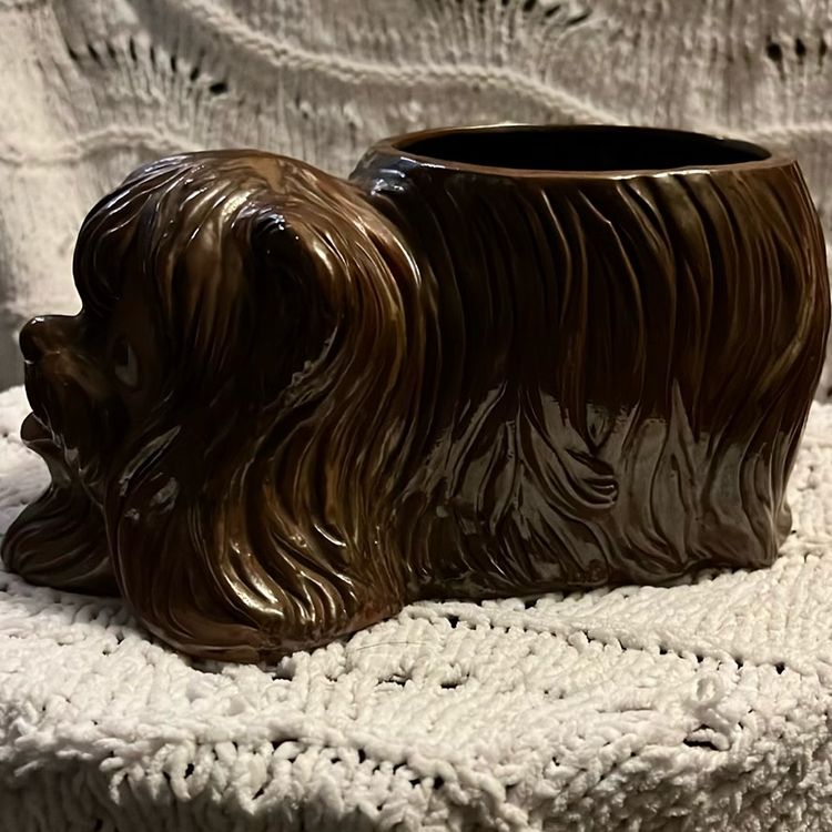 This vintage long-haired brown dog planter is made in Japan. It weighs 1 lbs. 15 oz. is 4 1/2 inches tall and 10 inches long and about 5 1/2 inches in diameter.