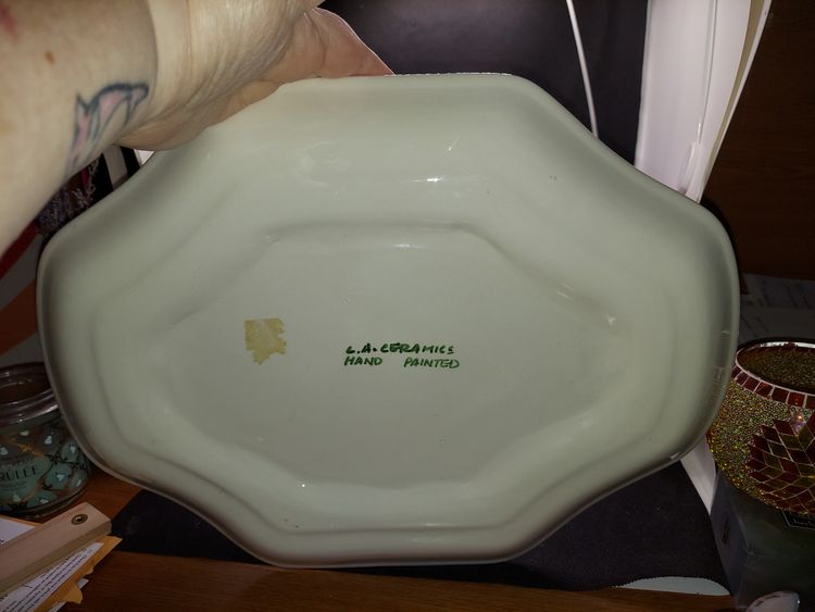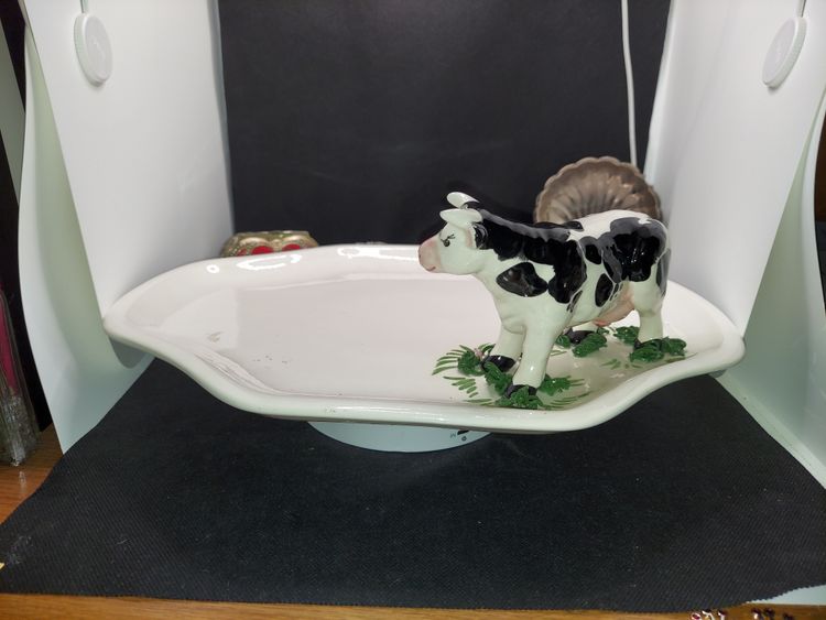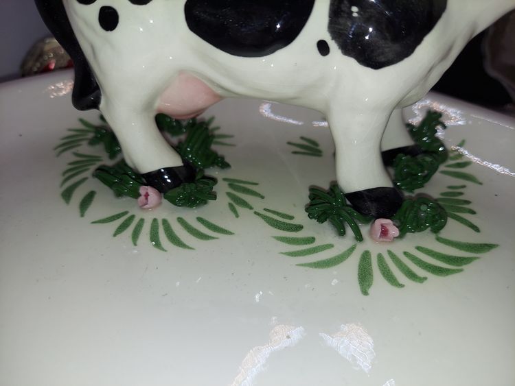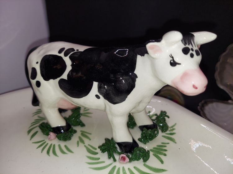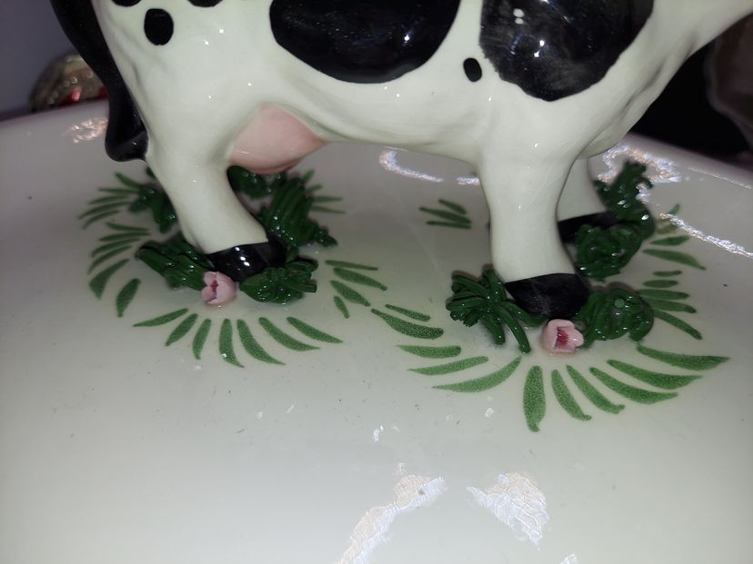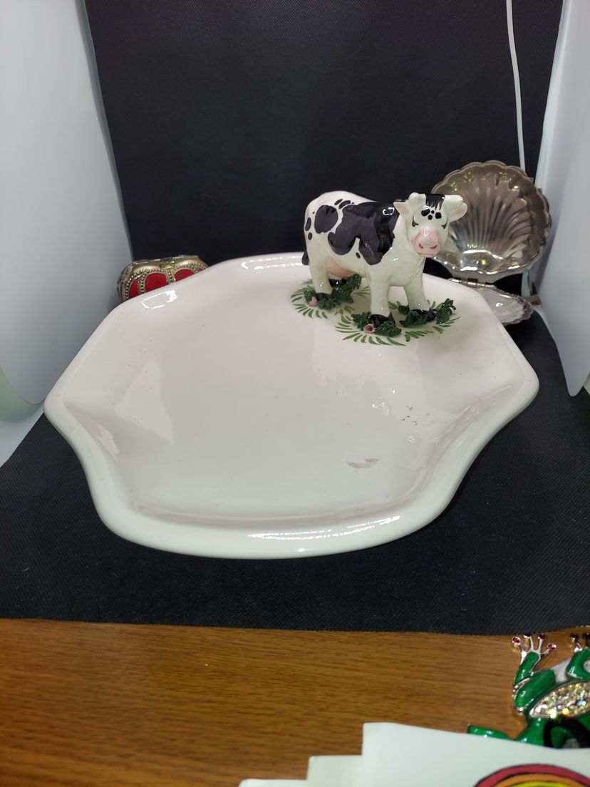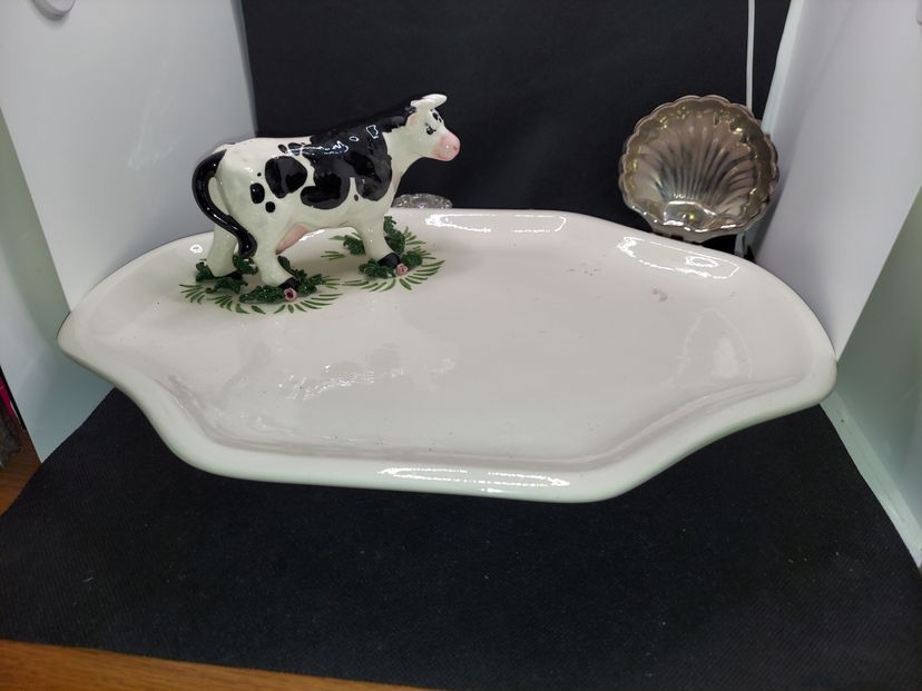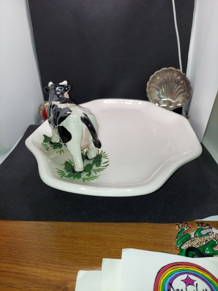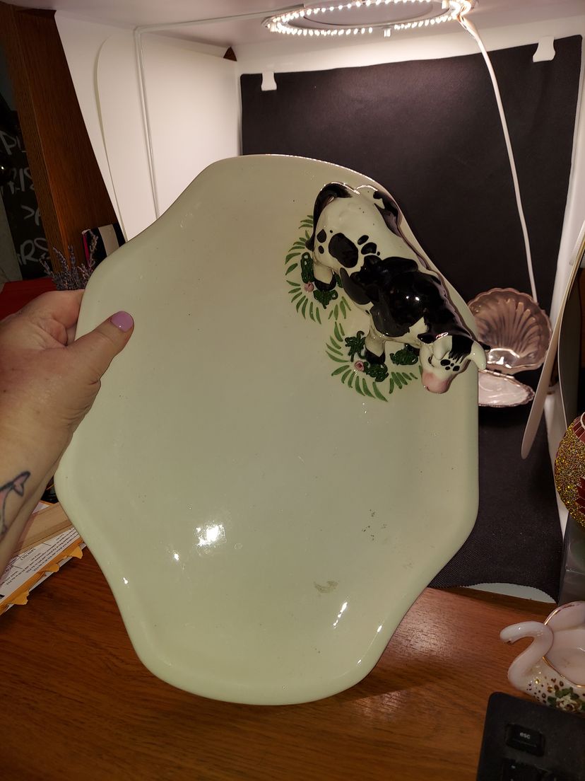 This Vintage L. A. Ceramics Cow Appetizer Plate Platter from the 1960s is a unique find for anyone looking to add a touch of farmhouse charm to their kitchen. The 3D cow is on a white base and makes it a stand-out piece for serving appetizers at any occasion OR for a Charcuterie Board! The large size and easy-to-fill compartment make it both practical and eye-catching for your dining table. Made in the United States by L.A. Ceramics, this glossy finish tray is a one-of-a-kind addition to your dinnerware collection. Seriously, trying and find another 1 like this! And the condition is Great!! It measures 15 inches long and 11 inches wide. In a super unique shape and VERY heavy and solid. This item will be the talk of your dinner party! This item is cross-posted on other apps so if you love it grab it now! Also please see our other items for sale as we love to bundle to save on shipping! All of our packages are packed with love and care so rest assured it will arrive safely.
