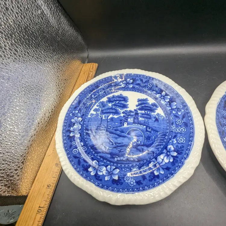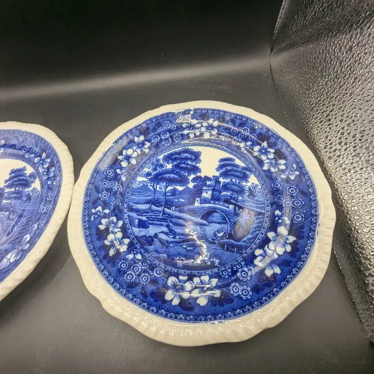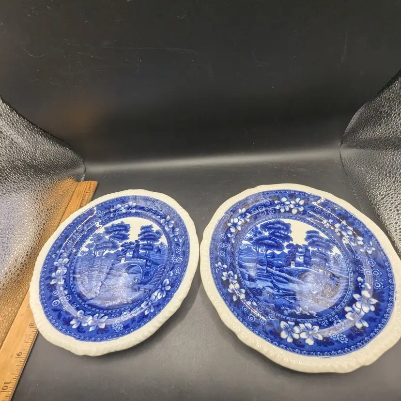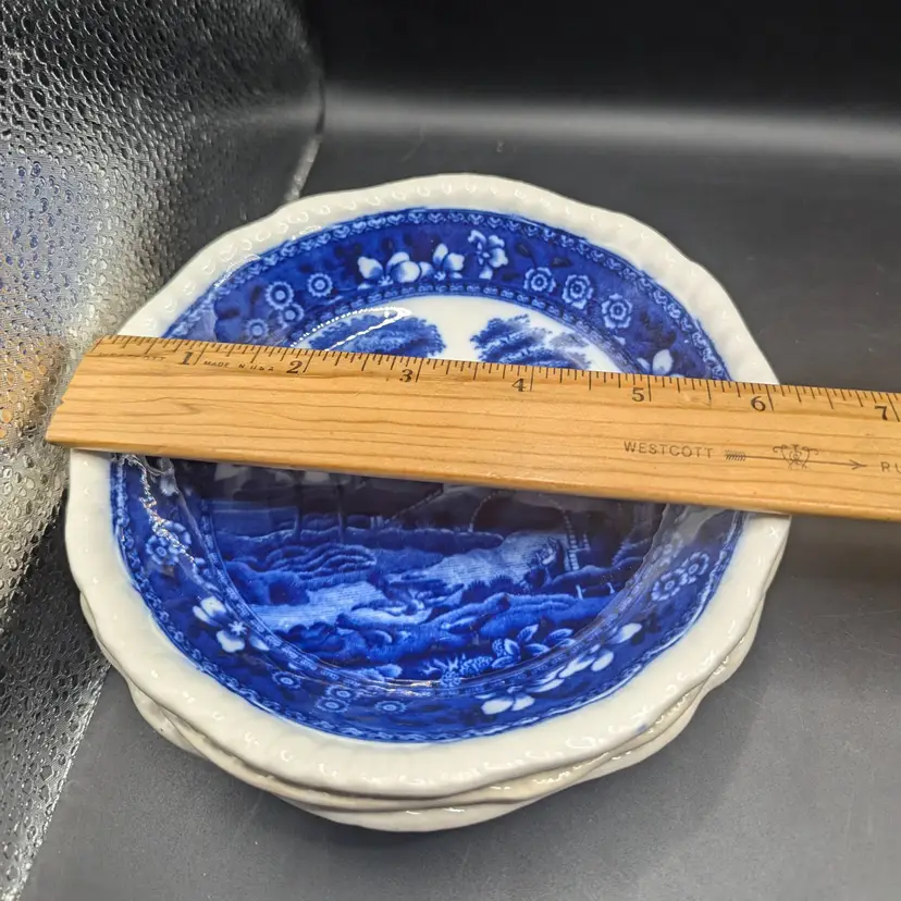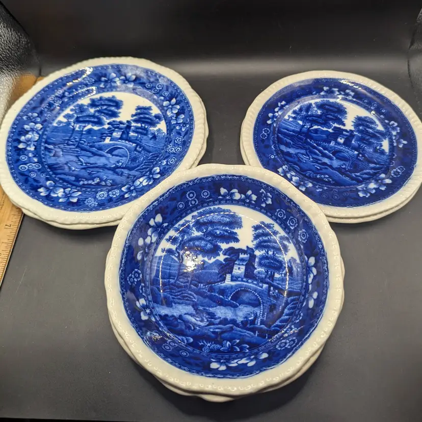 This is a lovely Vintage Lot of 7 Pieces of Copeland Spode's Tower Blue Gadroon 3 Soup Bowls 2 Salad Dessert Plates 2 Bread Plates Old Mark. One salad plate has a repair on the back as seen in last picture and not visible from the front. Please see all pictures for condition and measurements.
