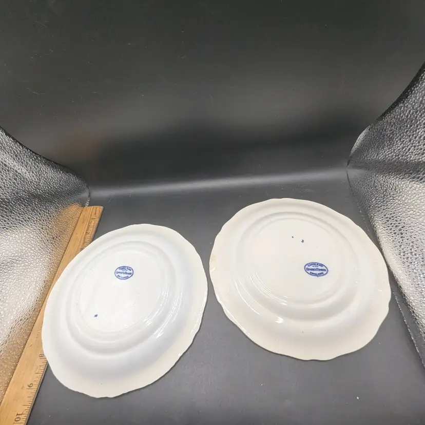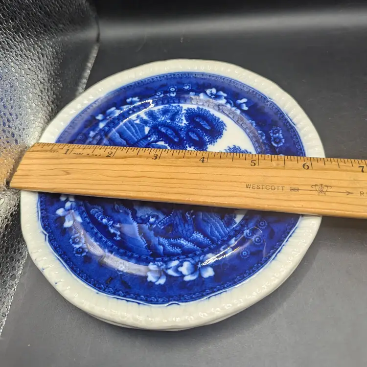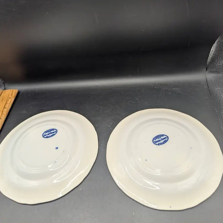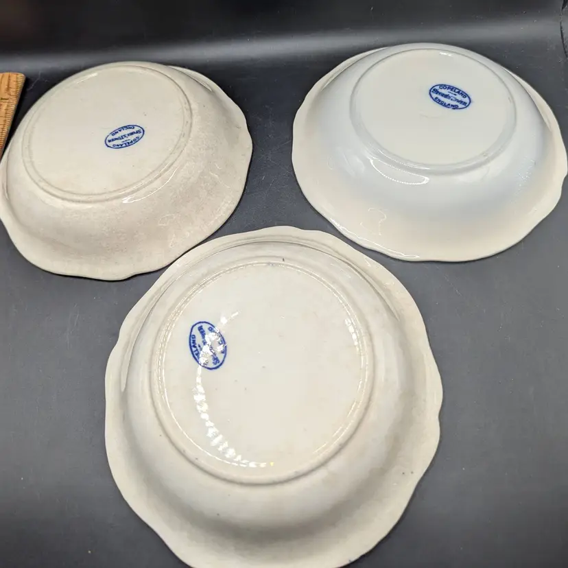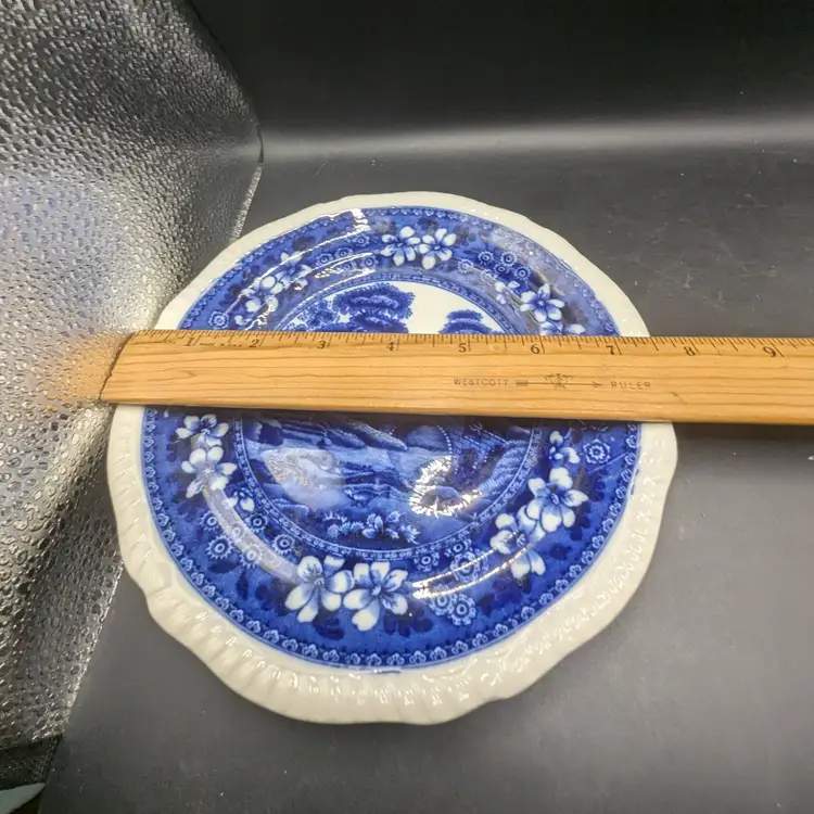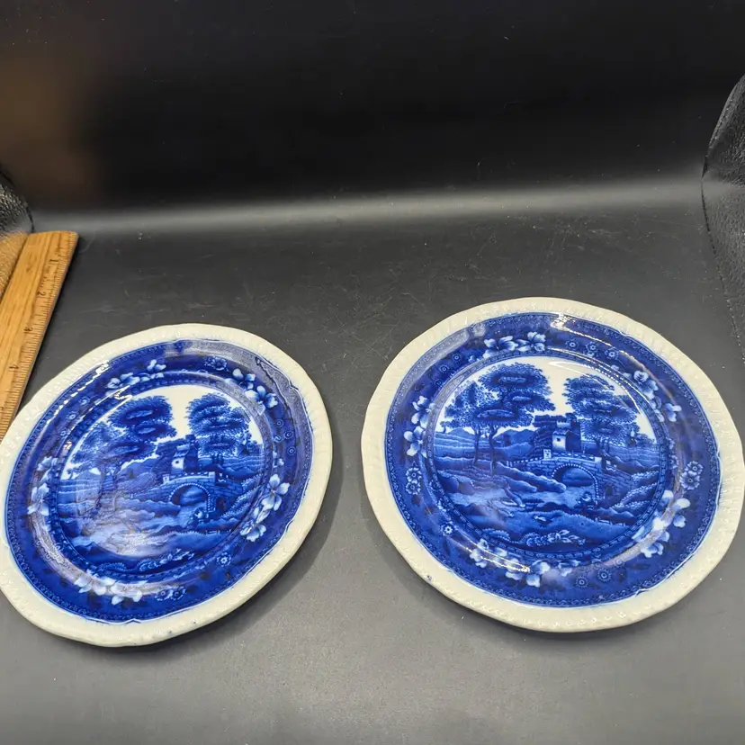 This is a lovely Vintage Lot of 7 Pieces of Copeland Spode's Tower Blue Gadroon 3 Soup Bowls 2 Salad Dessert Plates 2 Bread Plates Old Mark. One salad plate has a repair on the back as seen in last picture and not visible from the front. Please see all pictures for condition and measurements.