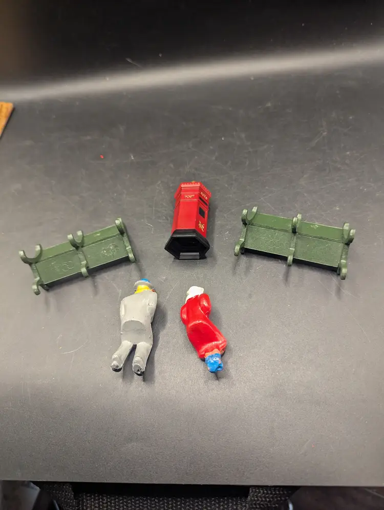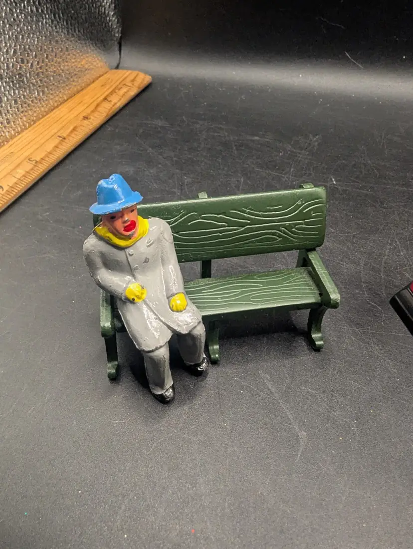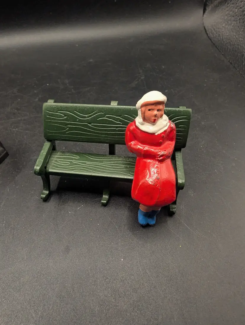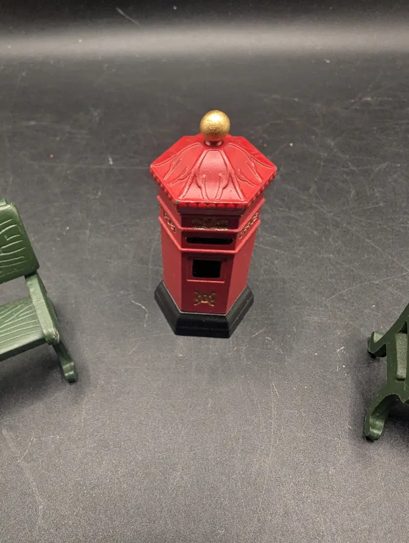 This is a fantastic Vintage Lot of Lead Metal Christmas Village Pieces Some Marked Dept 56. Includes two benches, English mailbox and a man and woman. Please see all pictures for condition and details.