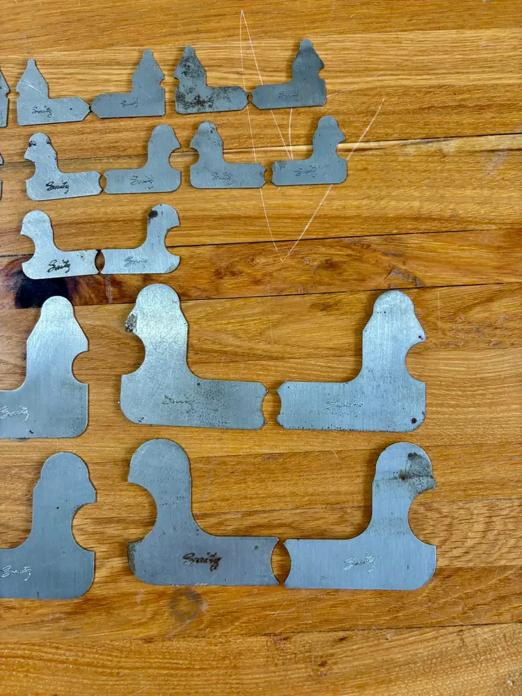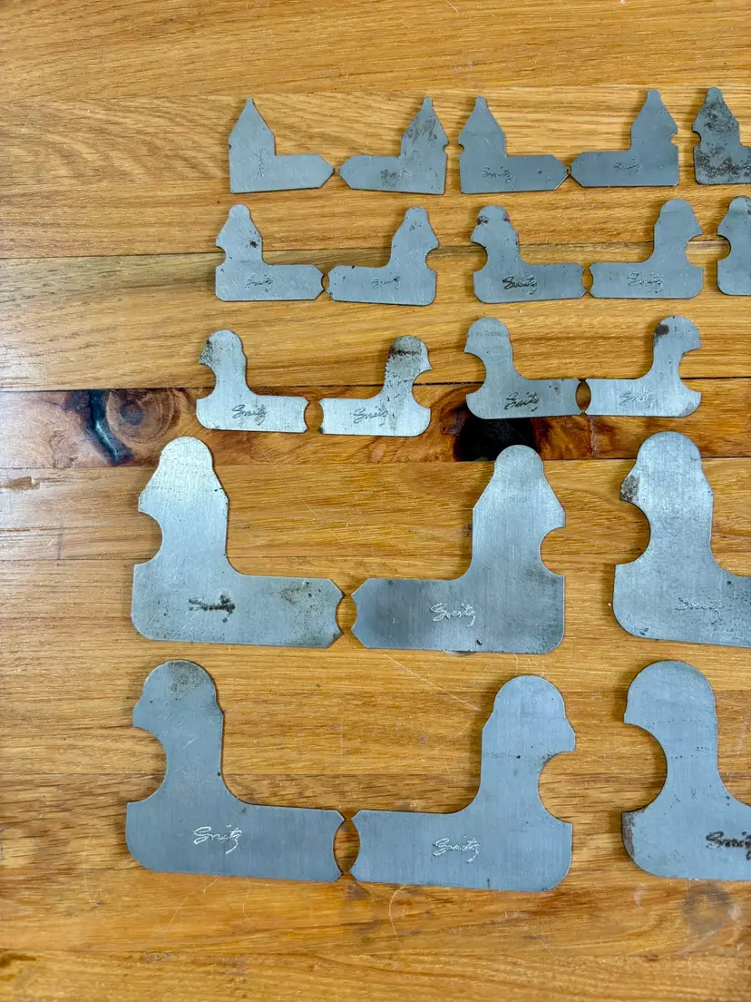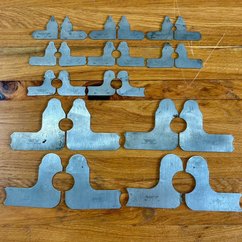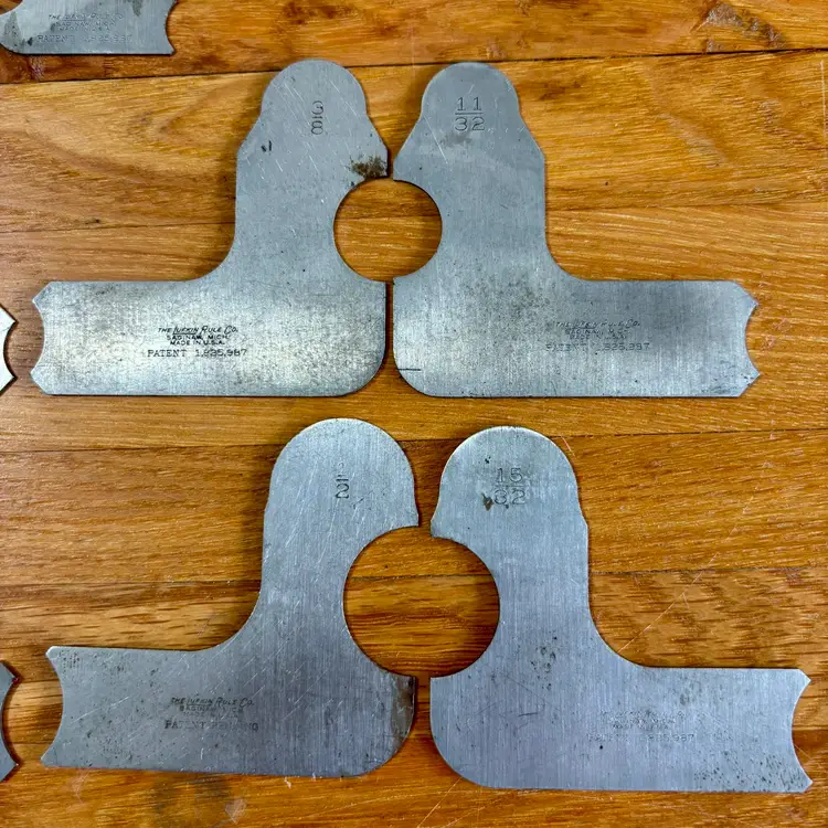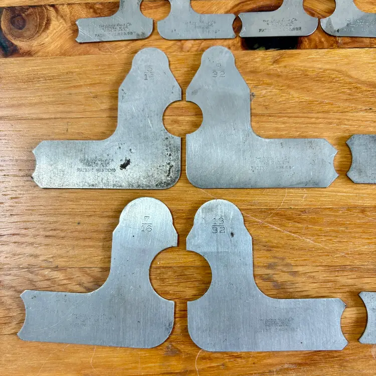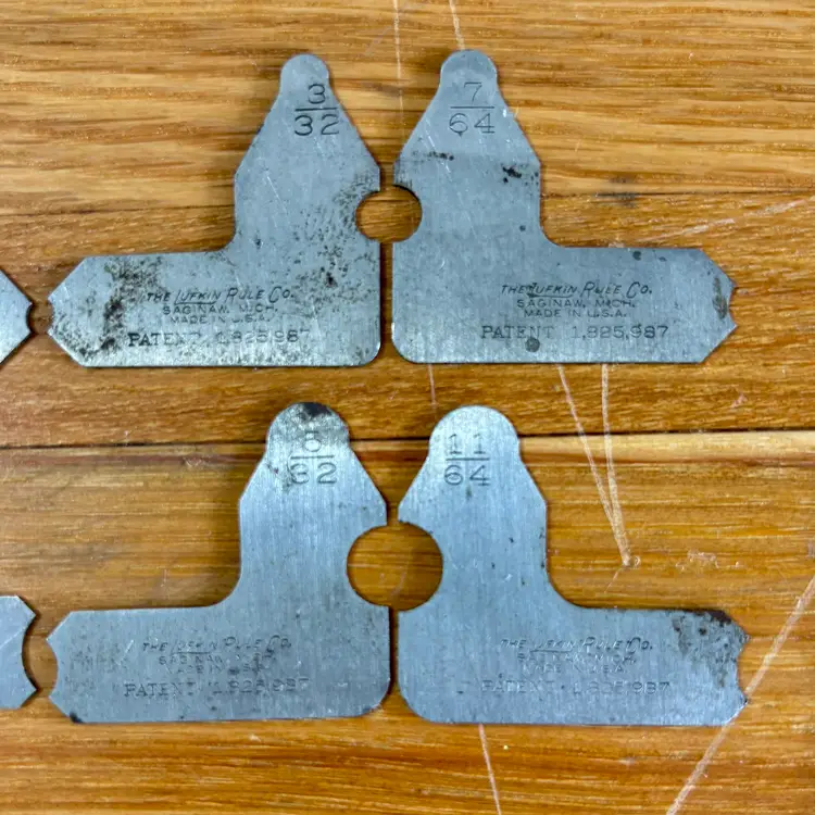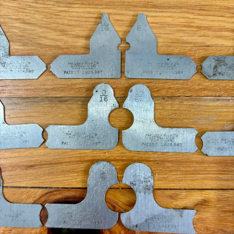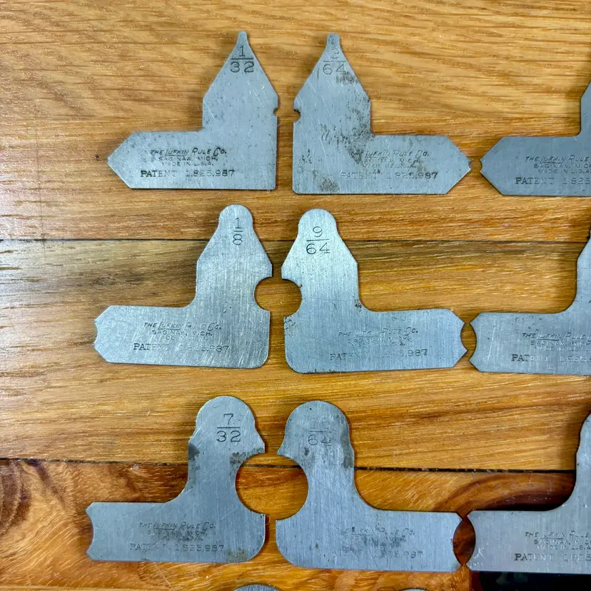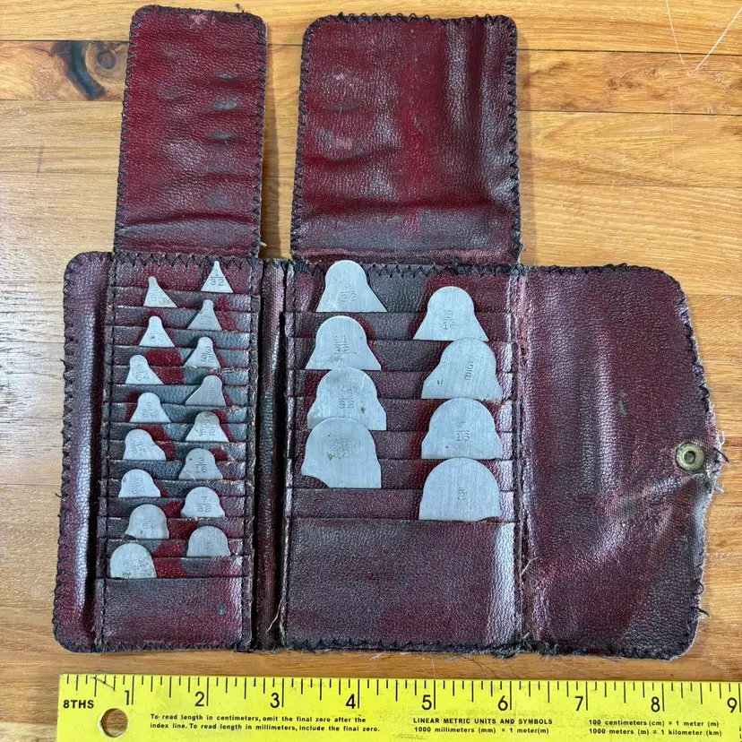 Good condition 24 piece Lufkin radius gauge set with original leather carrying case. All gauges are easy to read and use. Each gauge has the previous owners mark etched into the back. See his last name, “Snitz”, in the last picture.