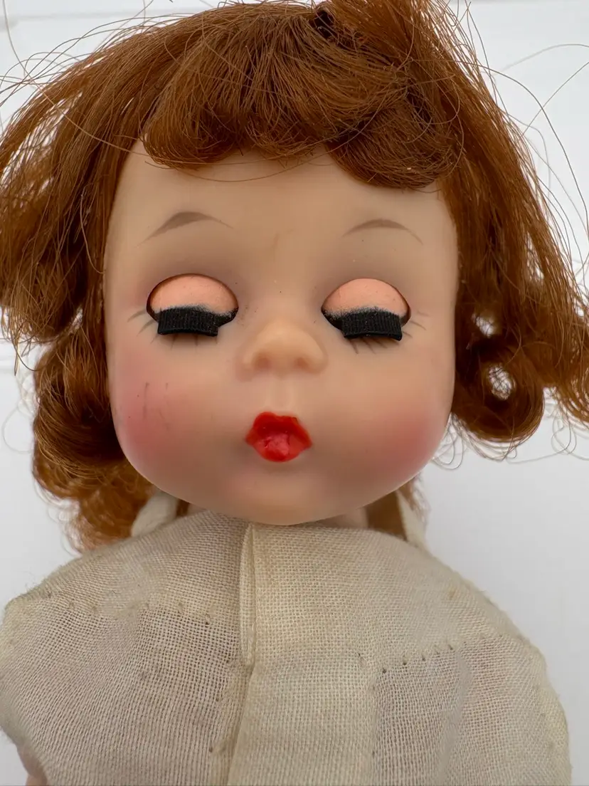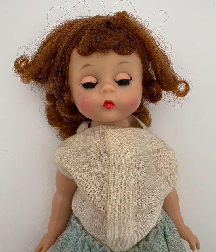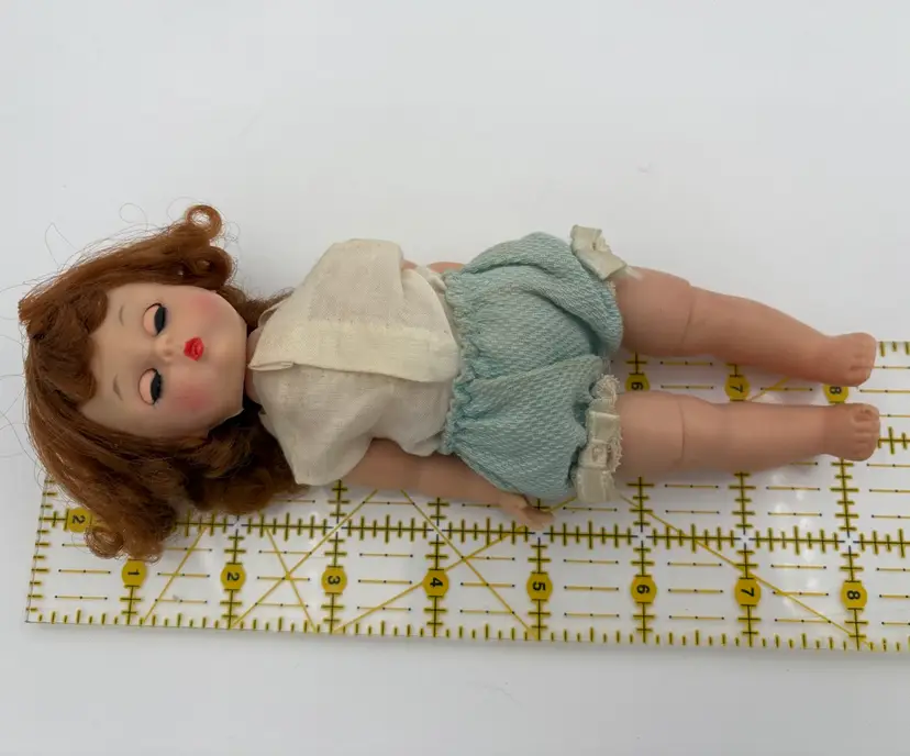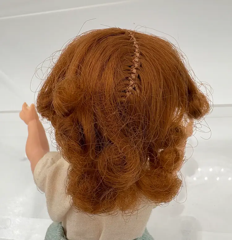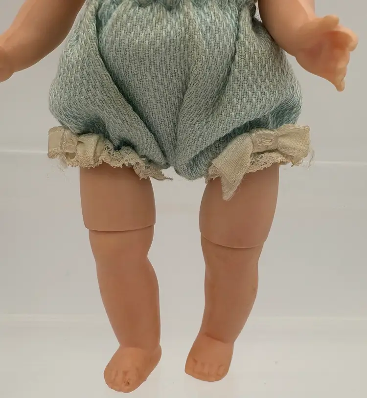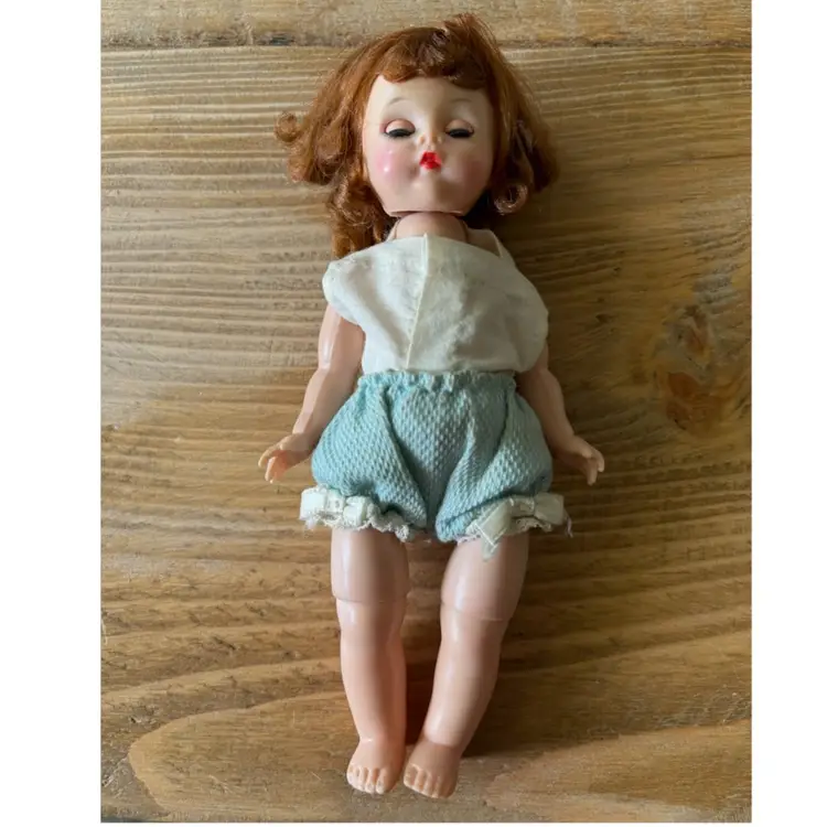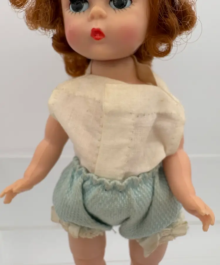 Wearing a cotton top with snaps and blue bubble shorts with bows and lace trim. Not sure if clothing is original to doll but it is vintage. Shorts could use washing. Bendy jointed knees. Red hair is a little fuzzy on the curls. Legs, arms, and head are intact.