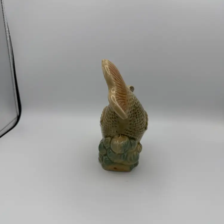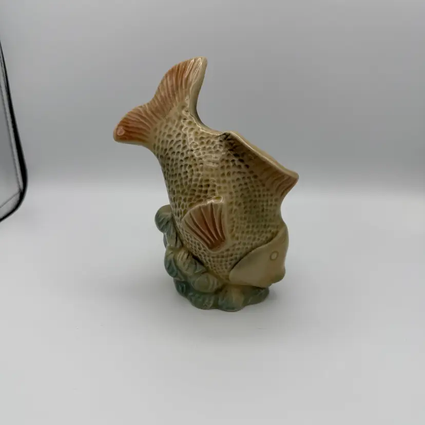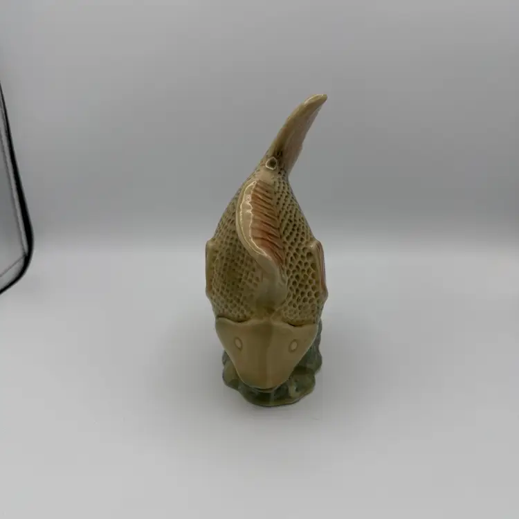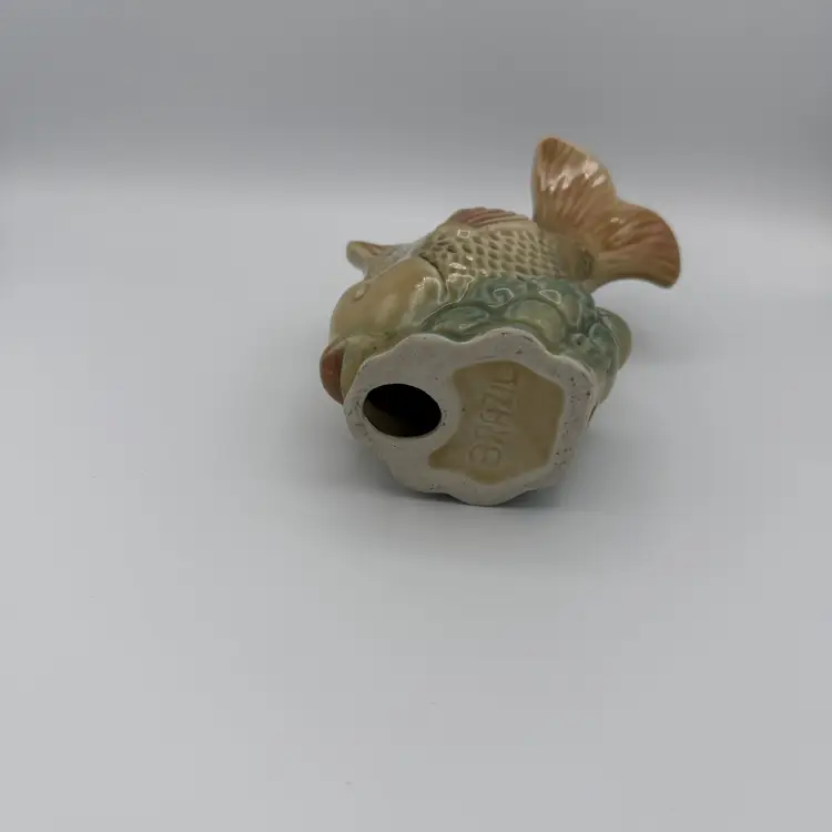 Vintage Majolica Style Ceramic Fish Figurine. Beige/Tan and Sage Green Finish. No Chips/Cracks. Made in Brazil.