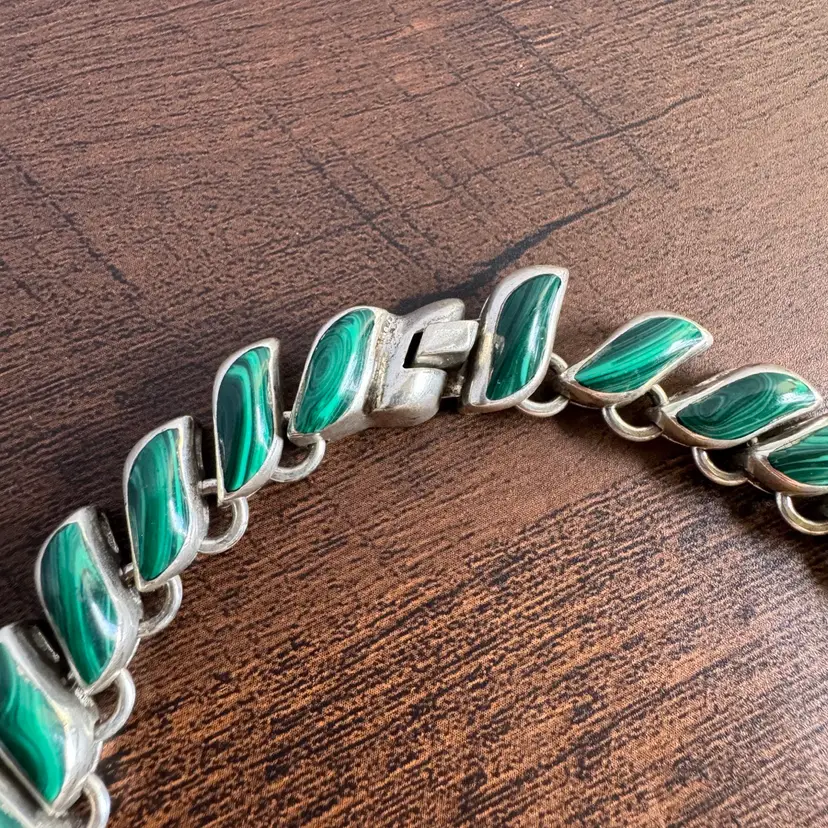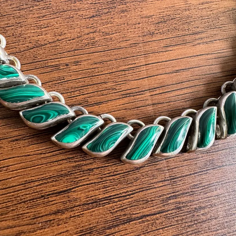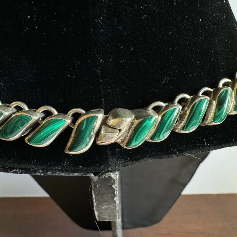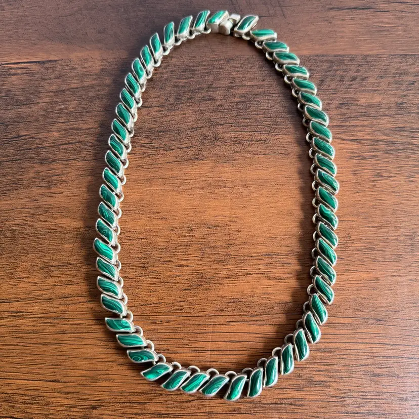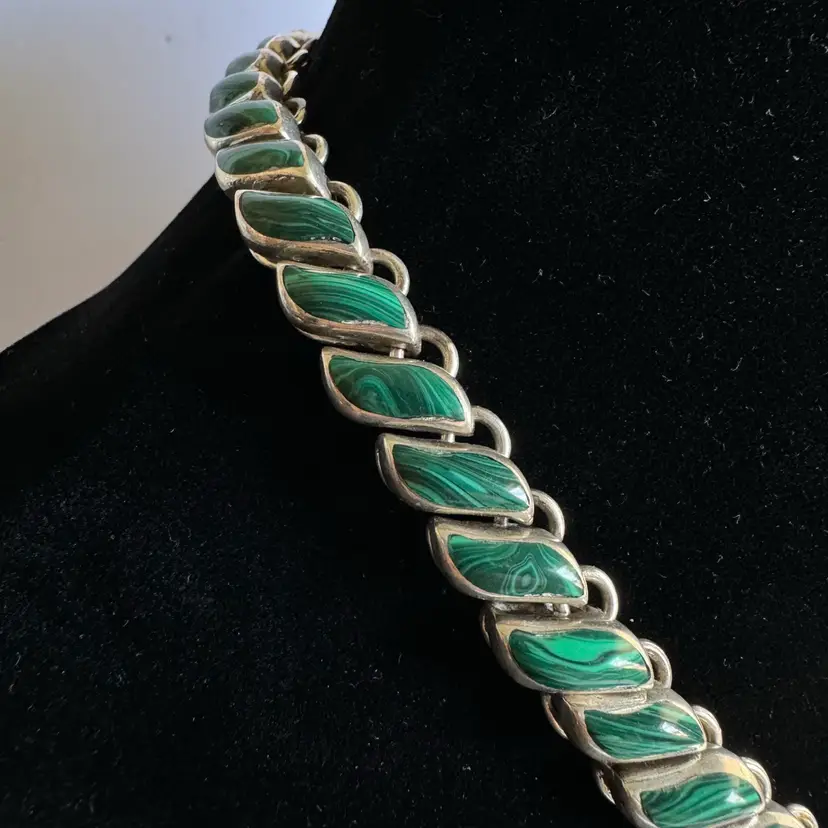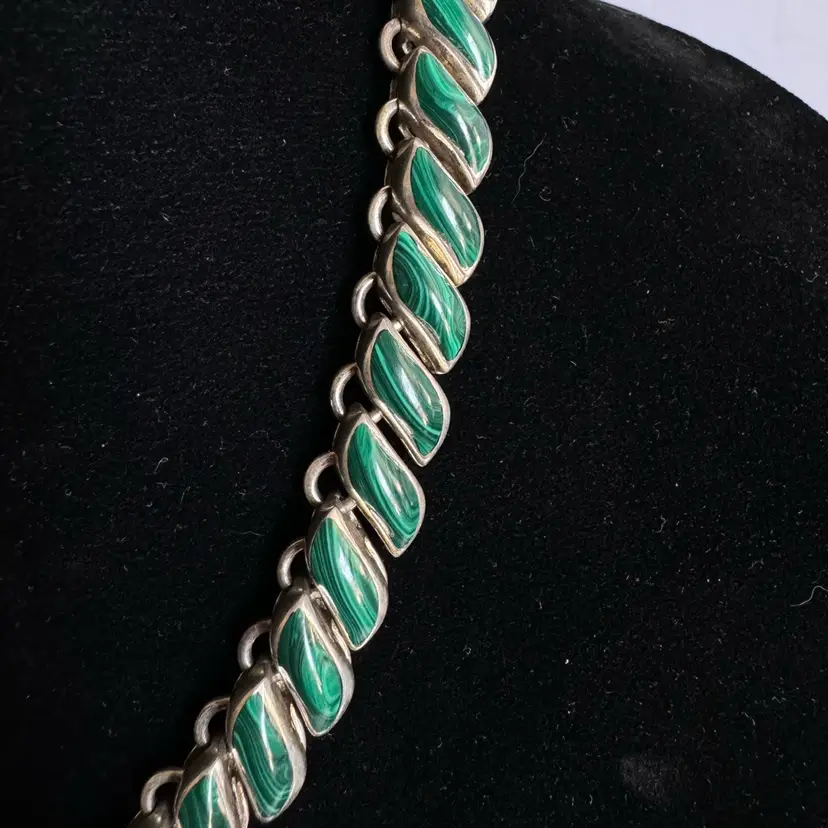 Free Priority Mail shipping in the US. Vintage handmade piece from Mexico, green malachite stones, fine sterling silver (950), 18 inches long, with herringbone style links, artisan signed VBV, marked VBV Mexico 950, excellent condition.