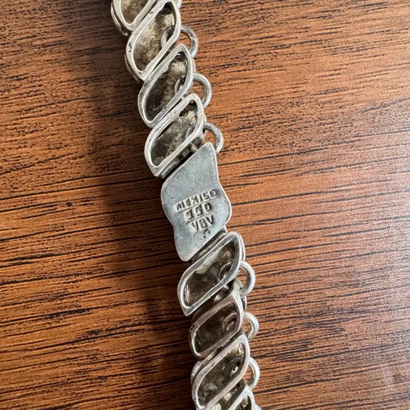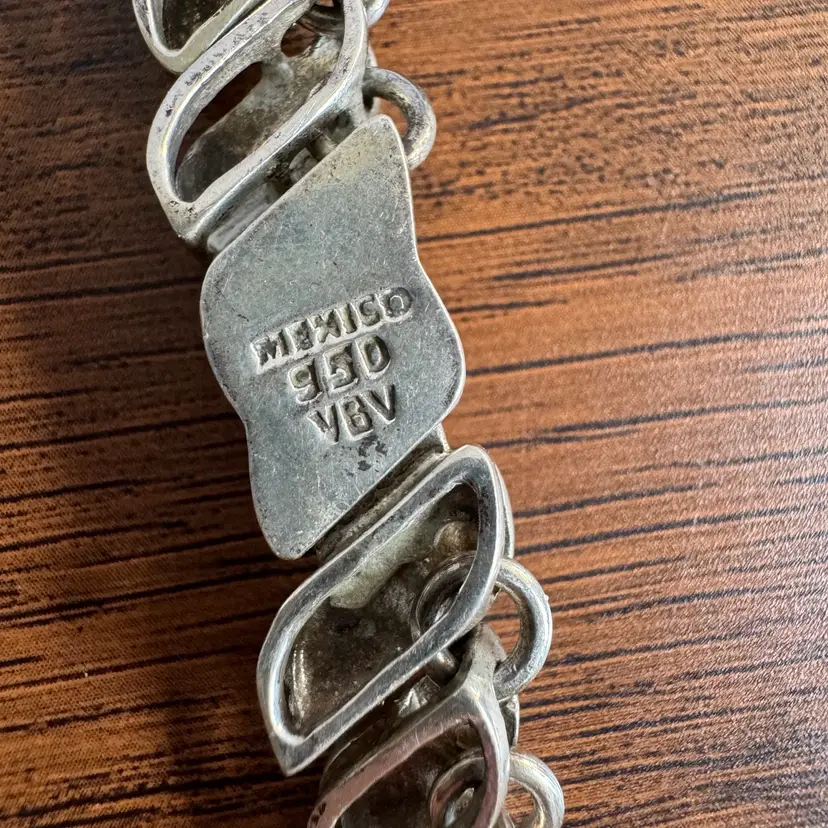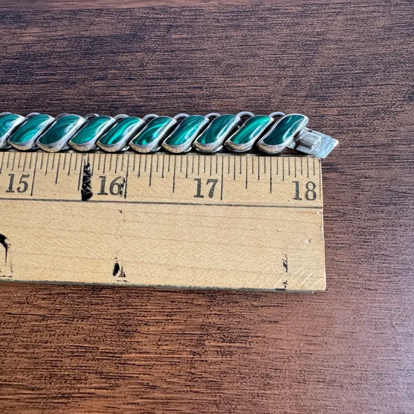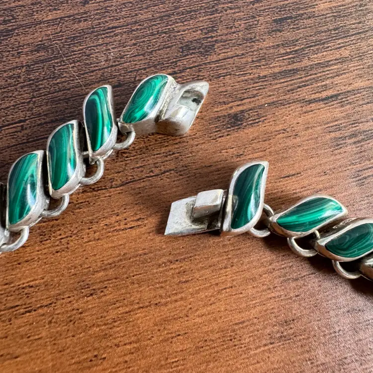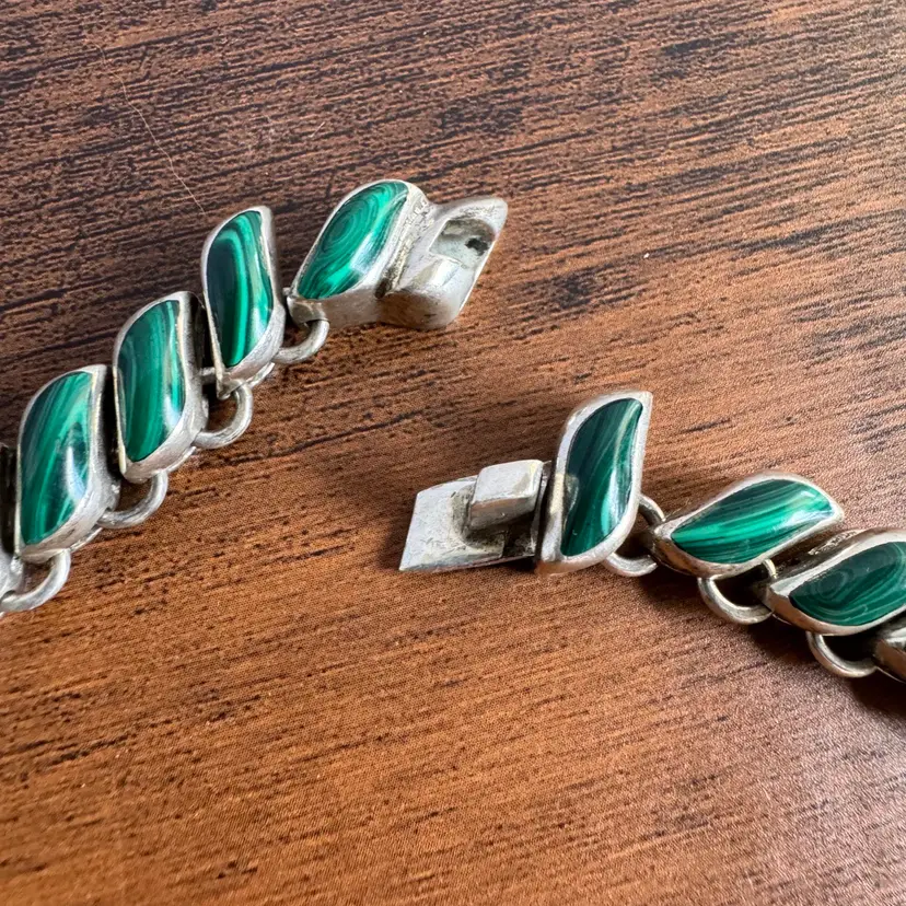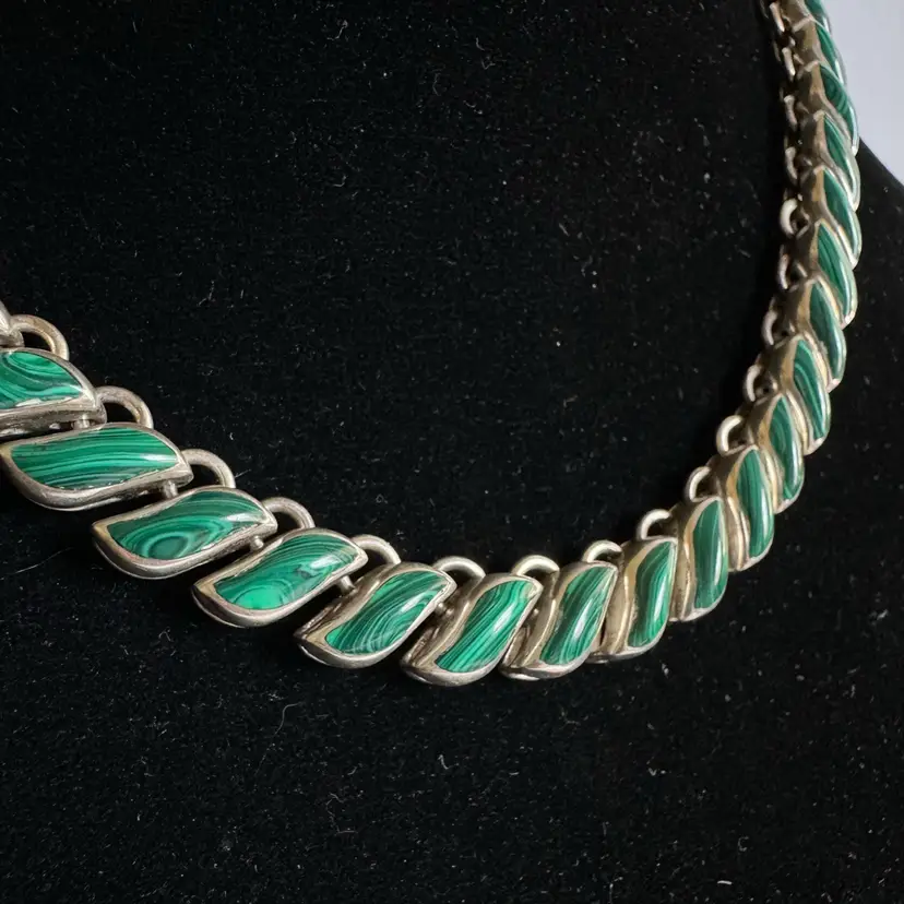 Free Priority Mail shipping in the US. Vintage handmade piece from Mexico, green malachite stones, fine sterling silver (950), 18 inches long, with herringbone style links, artisan signed VBV, marked VBV Mexico 950, excellent condition.