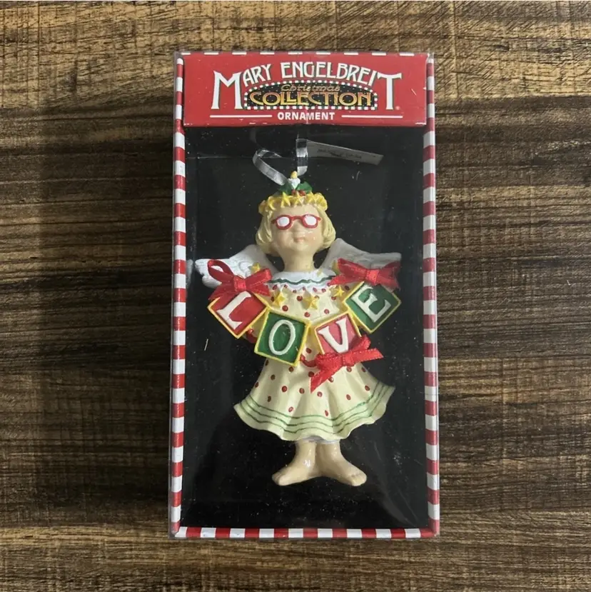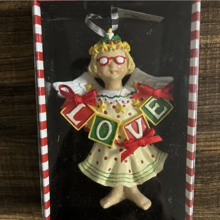 Vintage Mary Engelbreit “LOVE” Angel Ornament from the Kurt S. Adler Christmas Collection. Features a whimsical angel wearing red glasses and holding a LOVE banner — classic Engelbreit charm with bright colors and playful details.