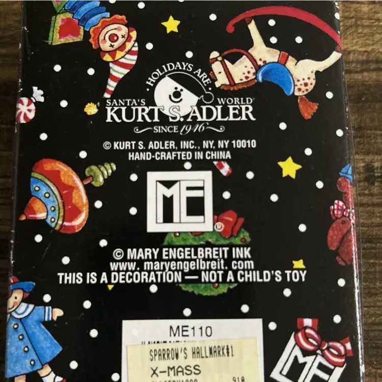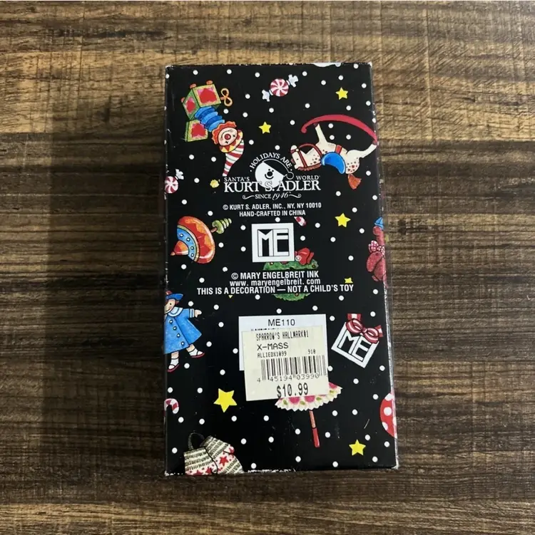 Handcrafted and comes in its original box marked ME110. A delightful collectible or holiday gift for fans of Mary Engelbreit and Kurt Adler ornaments.