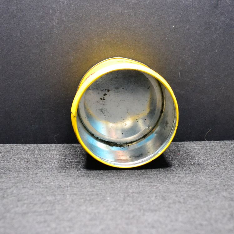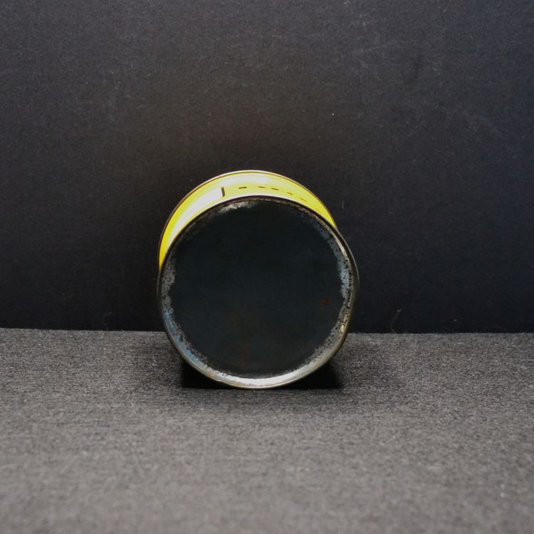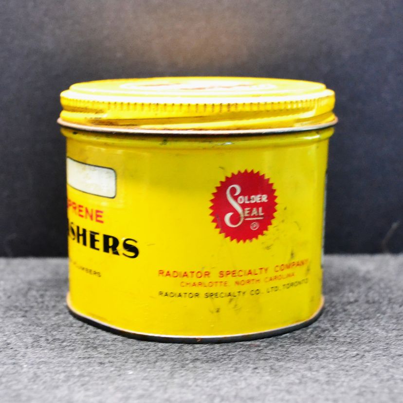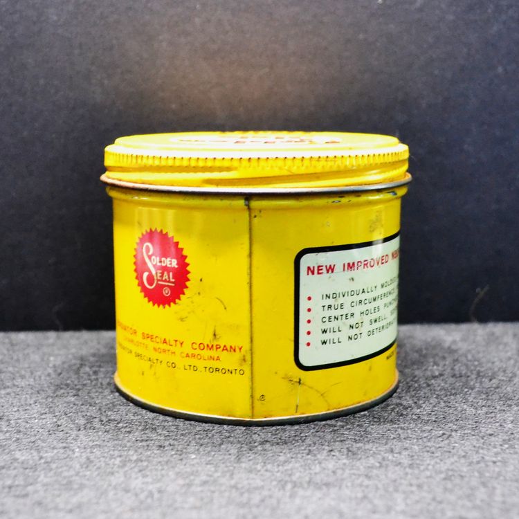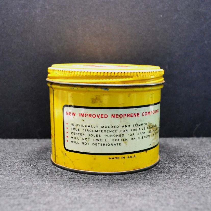 This bold yellow metal tin once held molded neoprene faucet washers, sold exclusively through Master Plumbers. Though the contents are long gone, the tin itself remains a striking relic of mid-century hardware branding. With its screw-top lid, classic typography, and “10¢ EACH” pricing, it’s a perfect piece for collectors of vintage advertising, plumbing memorabilia, or industrial décor.