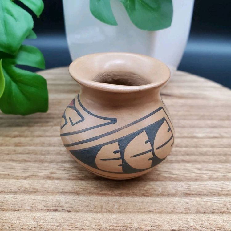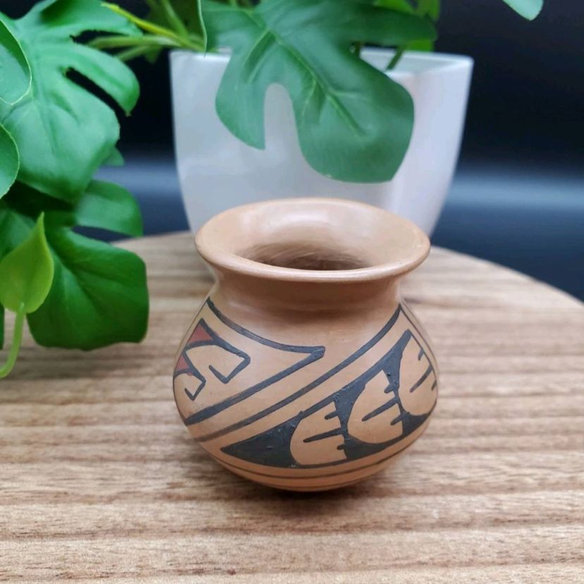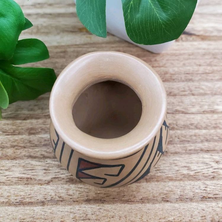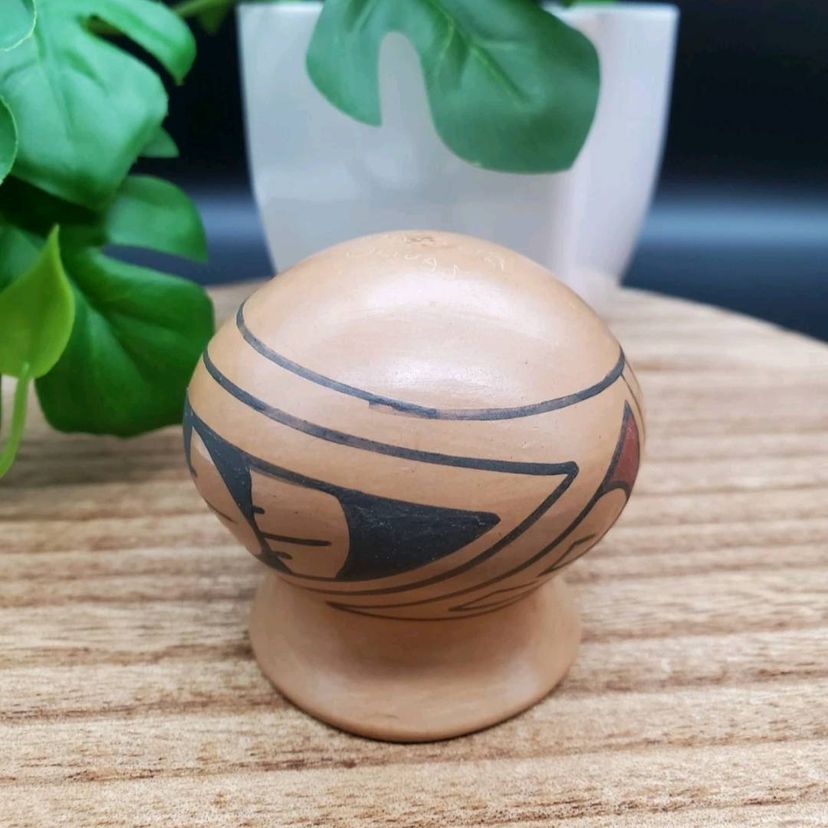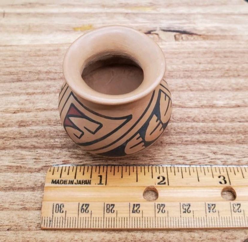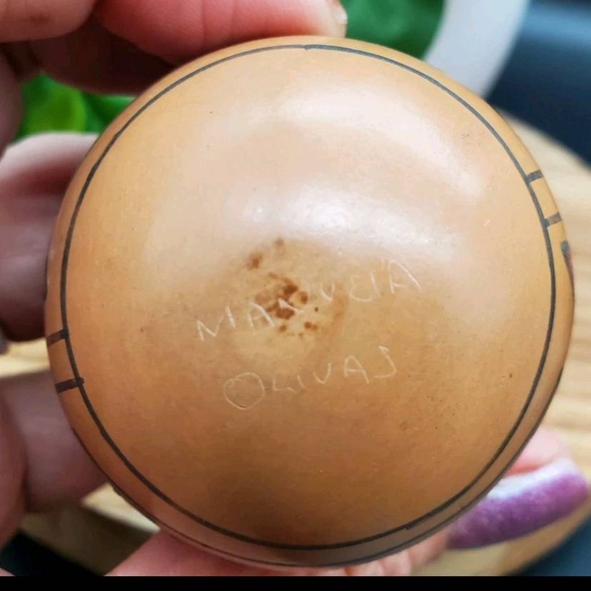 Very good pre-owned condition with no chips or cracks. Signed Manuela Olivas Measures 2" x 2" and has a rounded bottom.