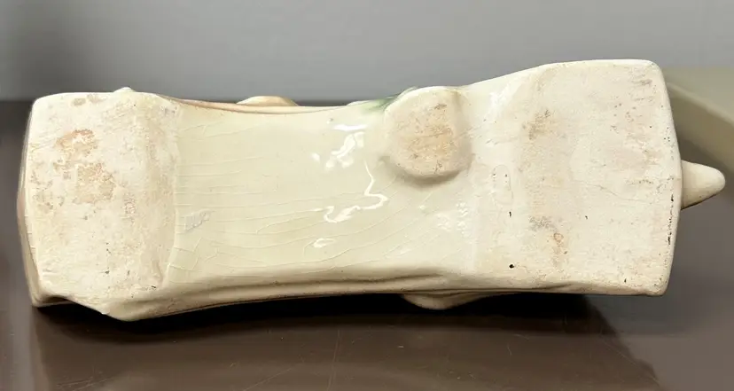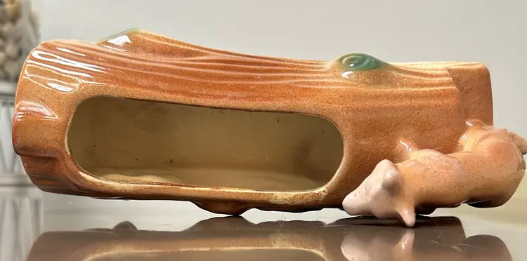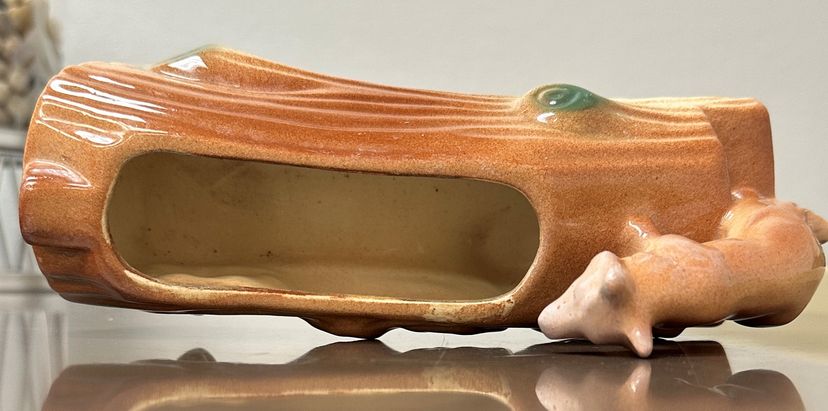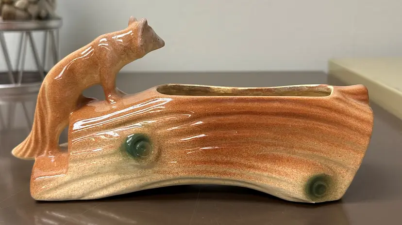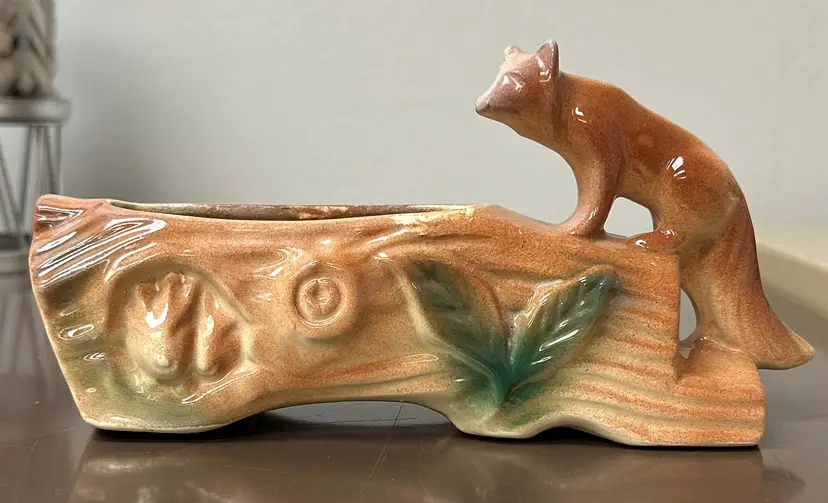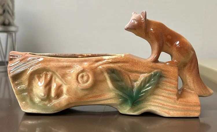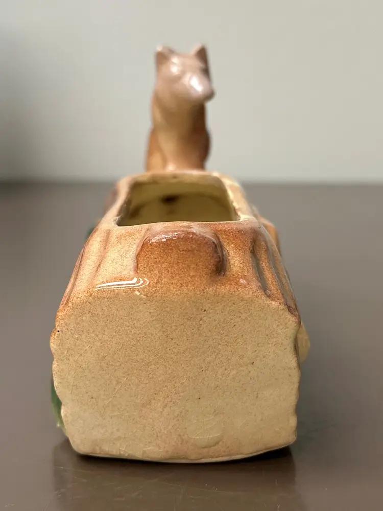 Rare vintage McCoy planter featuring a unique design of a fox sitting on a log, with hiding bunnies. The planter is approximately 8" long, making it perfect for decorative pottery and glassware collection. McCoy is a well-known brand known for producing quality pottery items, adding to the appeal and value of this particular planter.