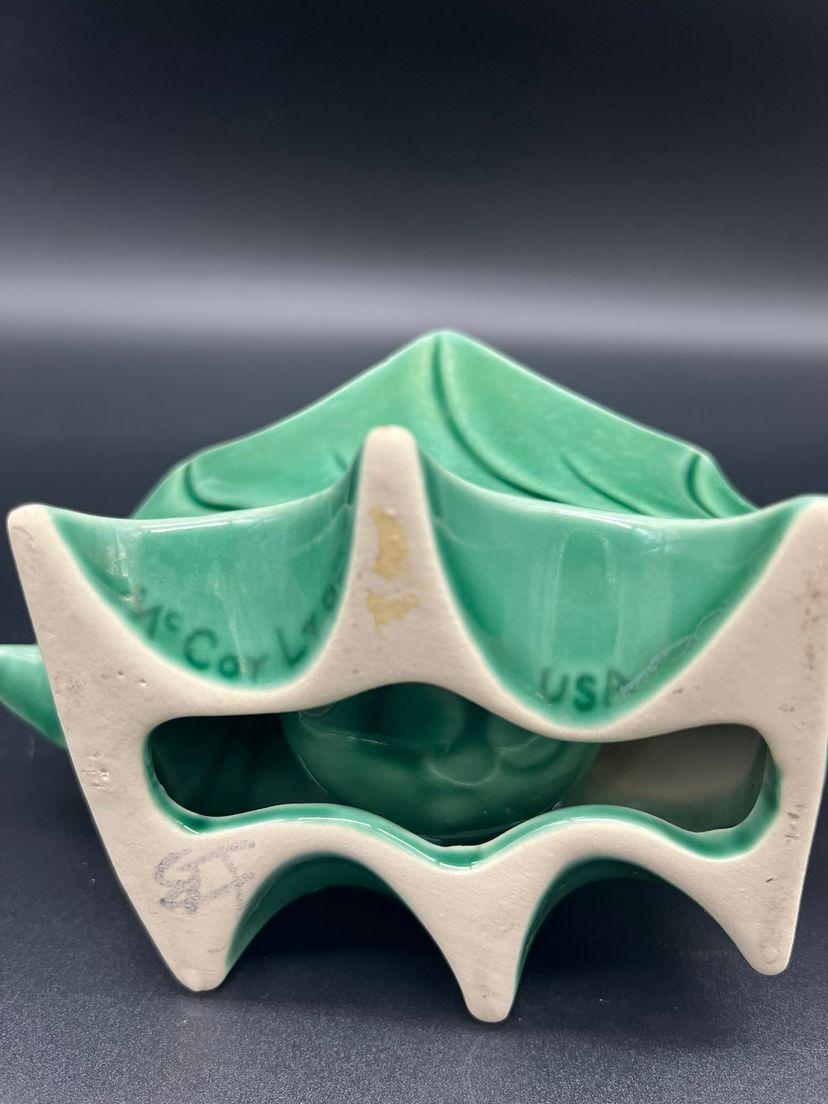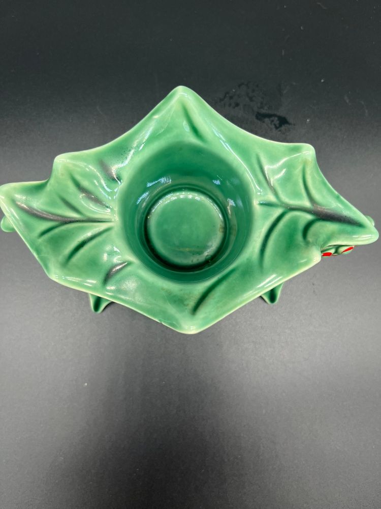 Mid-Century McCoy holiday-themed glazed ceramic votive candle holder. McCoy mark on bottom. Bring some mid-century decor to your table as you celebrate the spirit of the season. Includes shipping. Glazed ceramic. 3" tall, 5.5" wide. Great condition, no chips or cracks. Red berries have faded a bit on one side as seen in photo.