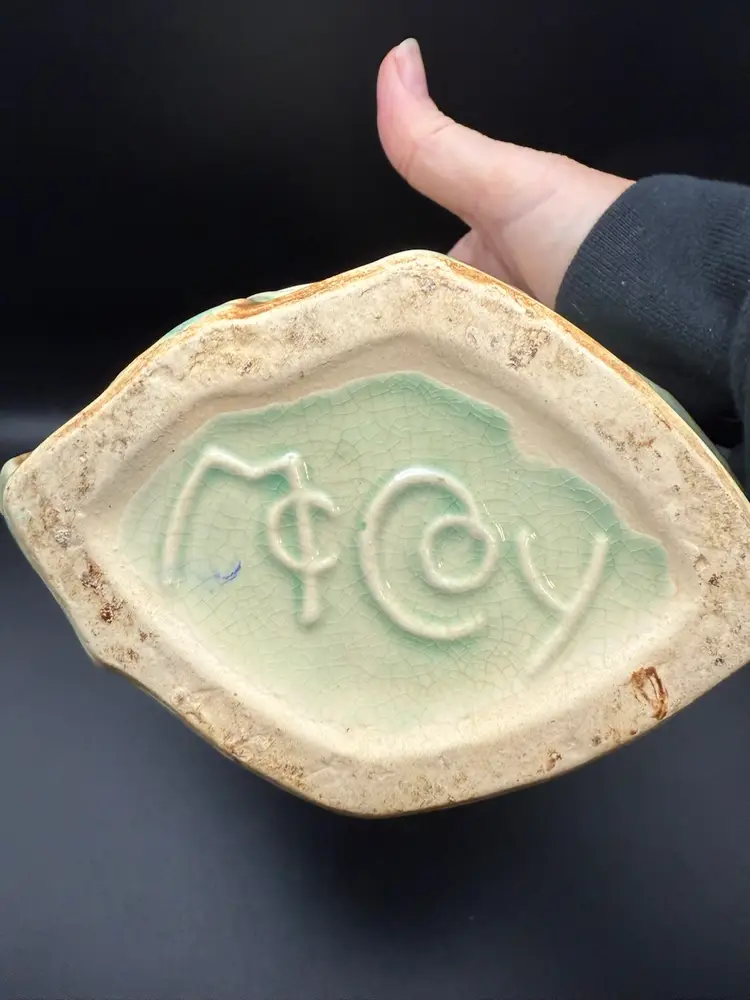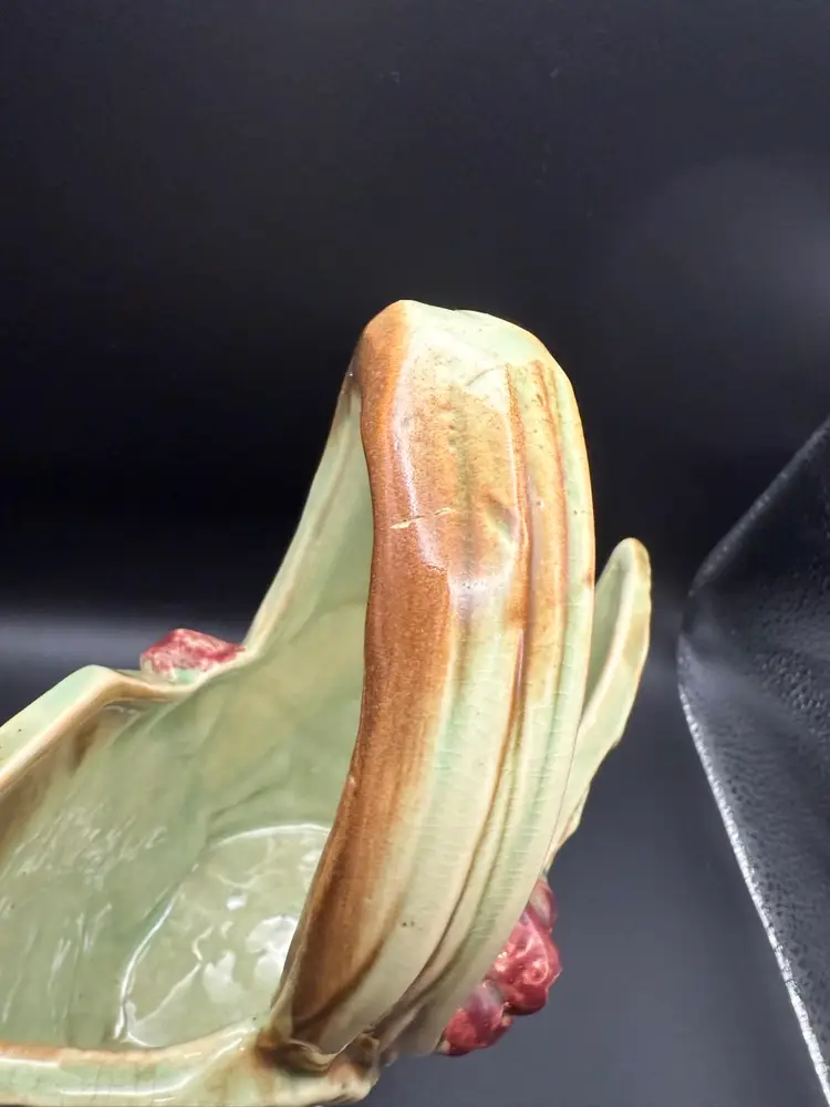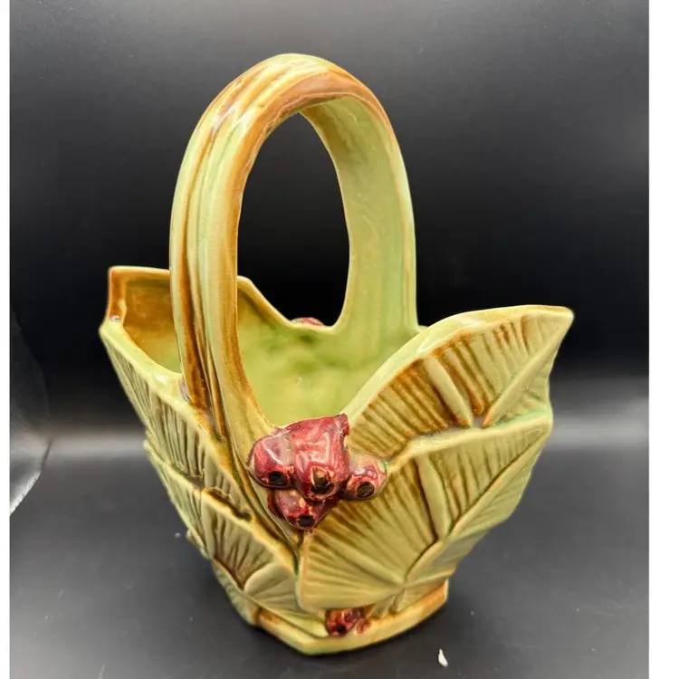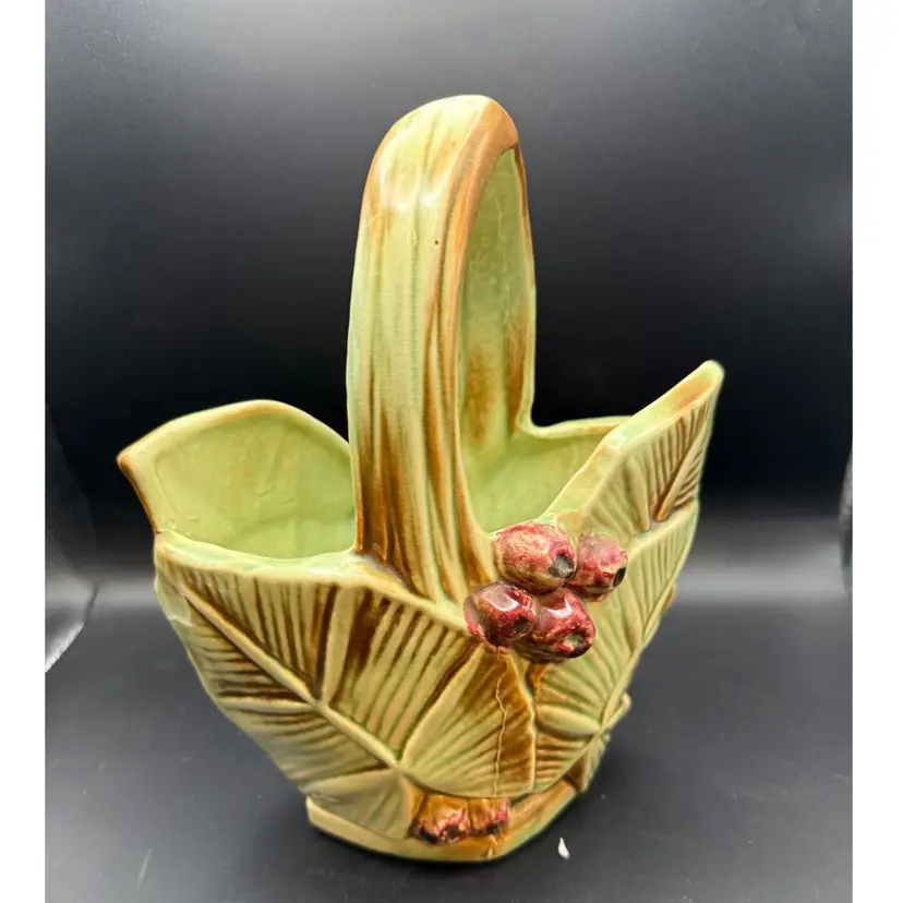 This particular basket, with its stylized leaves and berry embellishments, fits within the Mid-Century Modern aesthetic popular in the 1950s and 1960s. Such pieces were often used as planters or decorative centerpieces, reflecting a growing interest in bringing nature indoors. The crazing visible in the glaze is a common characteristic of older ceramic pieces, adding to their vintage appeal. NOTE - small chip on handle see pics.