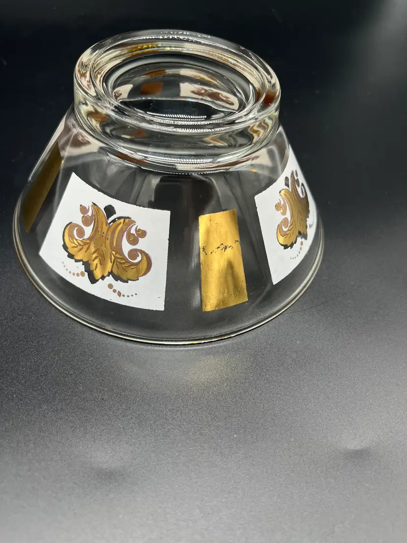 Add a touch of mid-century charm to your space with this vintage 5" glass dish featuring flared silhouette and richly detailed gold banding in warm amber and bronze tones. The design wraps the bowl in classic MCM style, perfect for collectors or lovers of retro glassware. Trinket dish, bar cart accent or part of a curated vintage shelf.