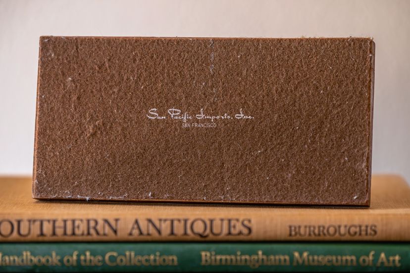 It’s stamped on the bottom “San Pacific Imports Inc. San Francisco”, and the base is lined with felt to protect surfaces.