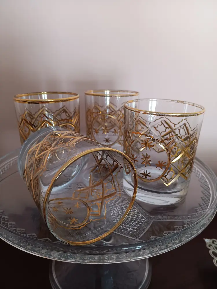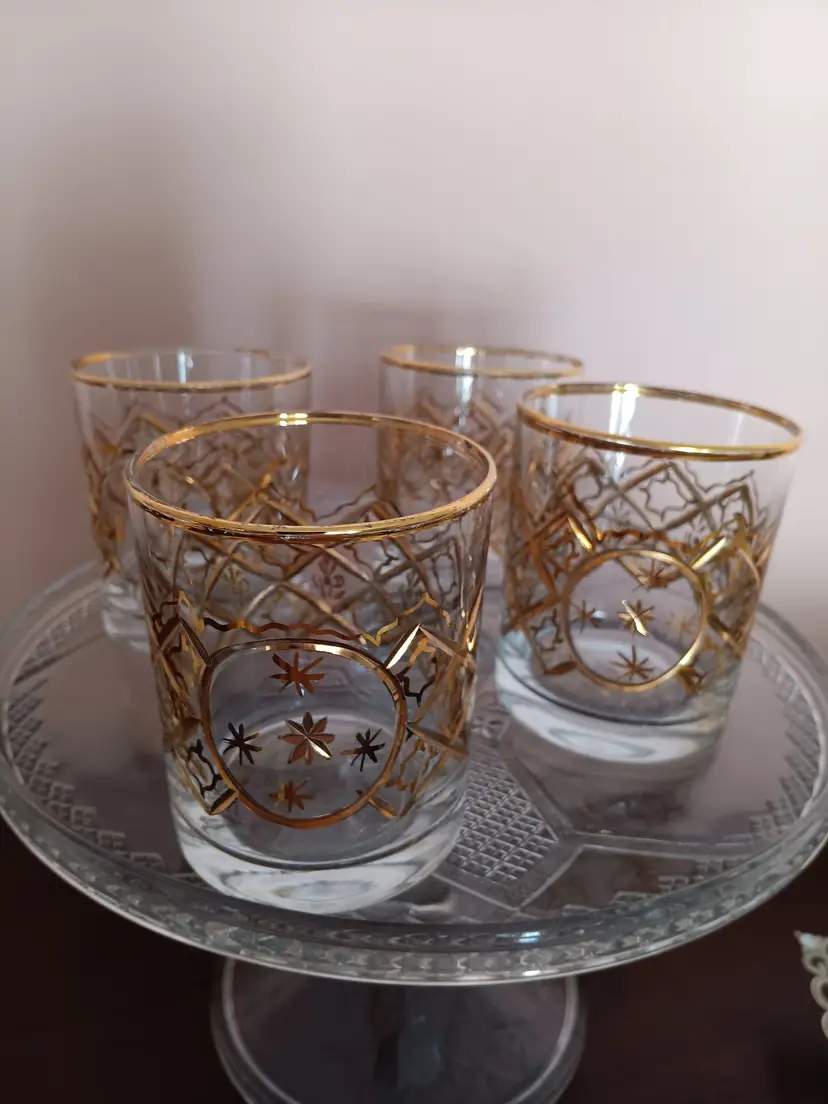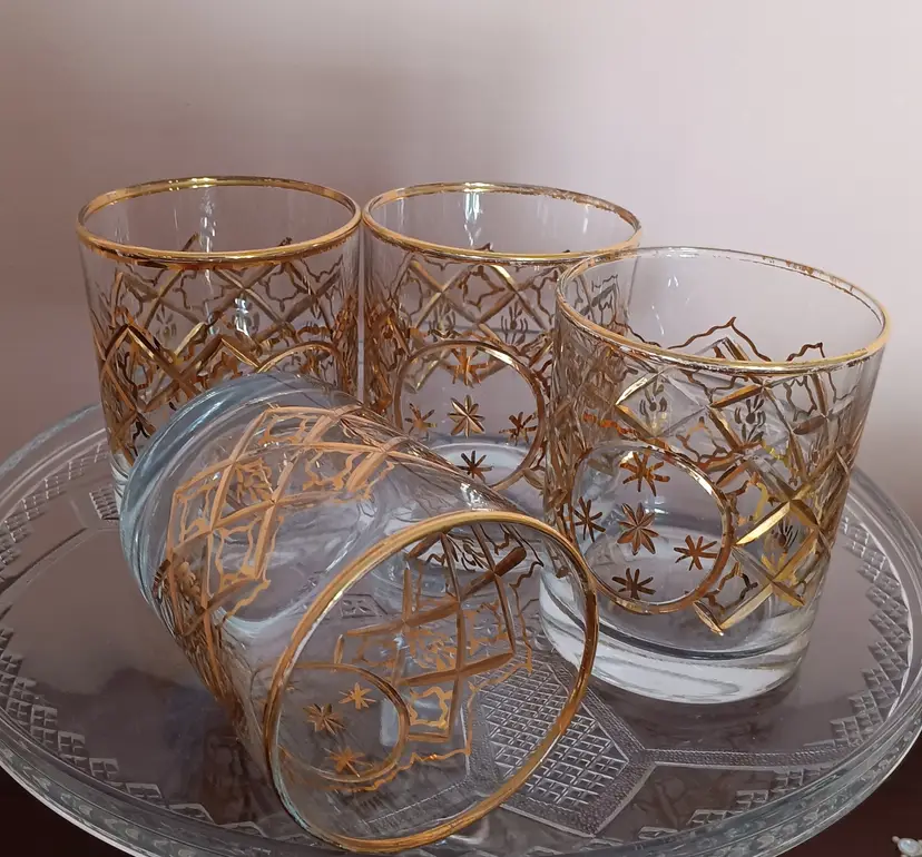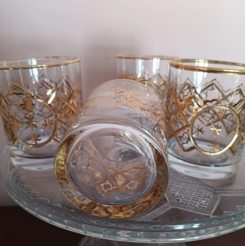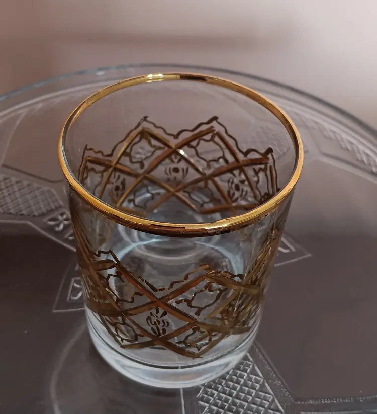 Elevate your home bar collection with this set of four vintage Mid-Century Modern rocks glasses. Each piece showcases an elegant round shape and is adorned with unique gold trim, ensuring that these glasses stand out. Though unmarked, these glasses capture the essence of the MCM style, making them a perfect addition for enthusiasts and collectors alike.