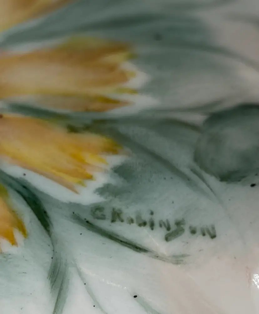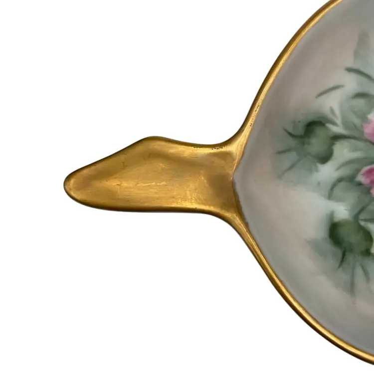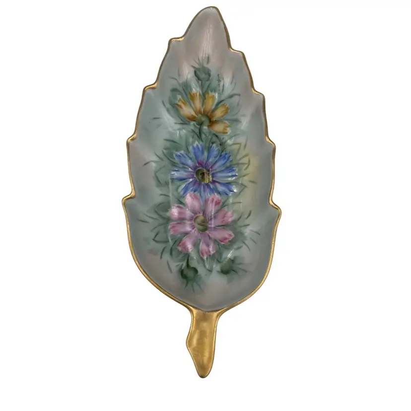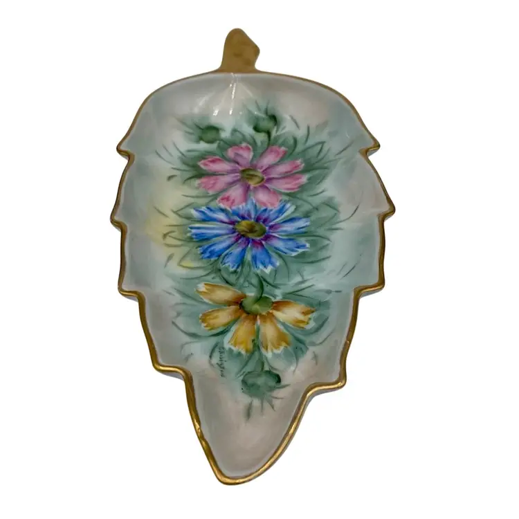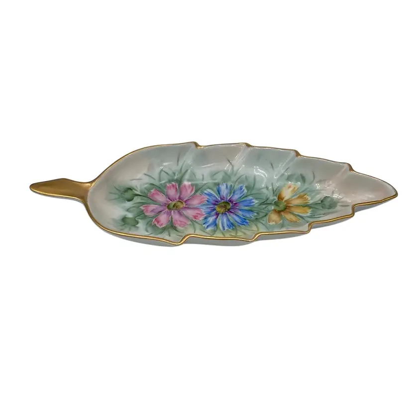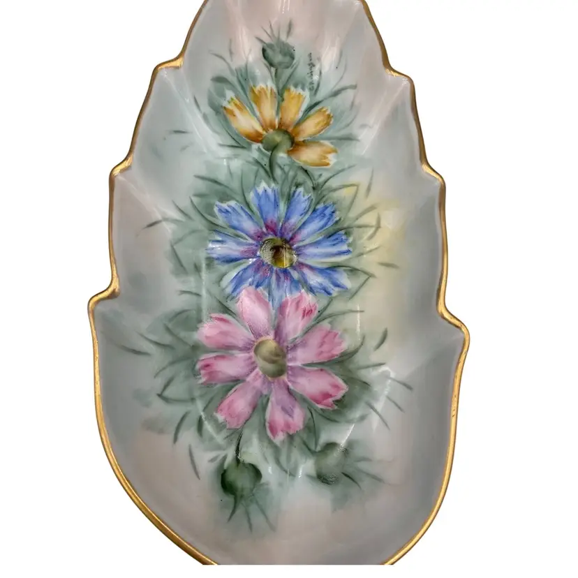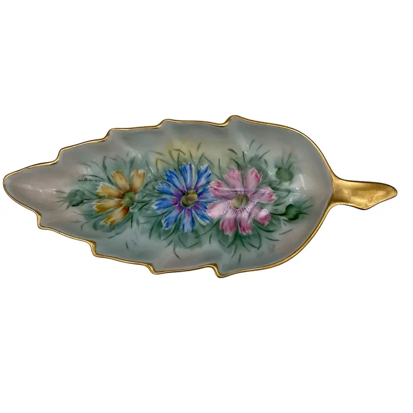 This beautiful porcelain leaf serving dish features a colorful floral pattern of hand-painted cosmos and greenery along with gold gilt accents. Measuring 9.75 inches in length and 4.1 inches at the widest point, this unique piece is perfect for serving snacks in style. Alternatively, the dish would make a lovely trinket dish for your vanity. Made in the United States in the 1950s, the dish is signed "G. Robinson", indicating the artist who created the lovely design. The number 229 in indented in the back of the porcelain.