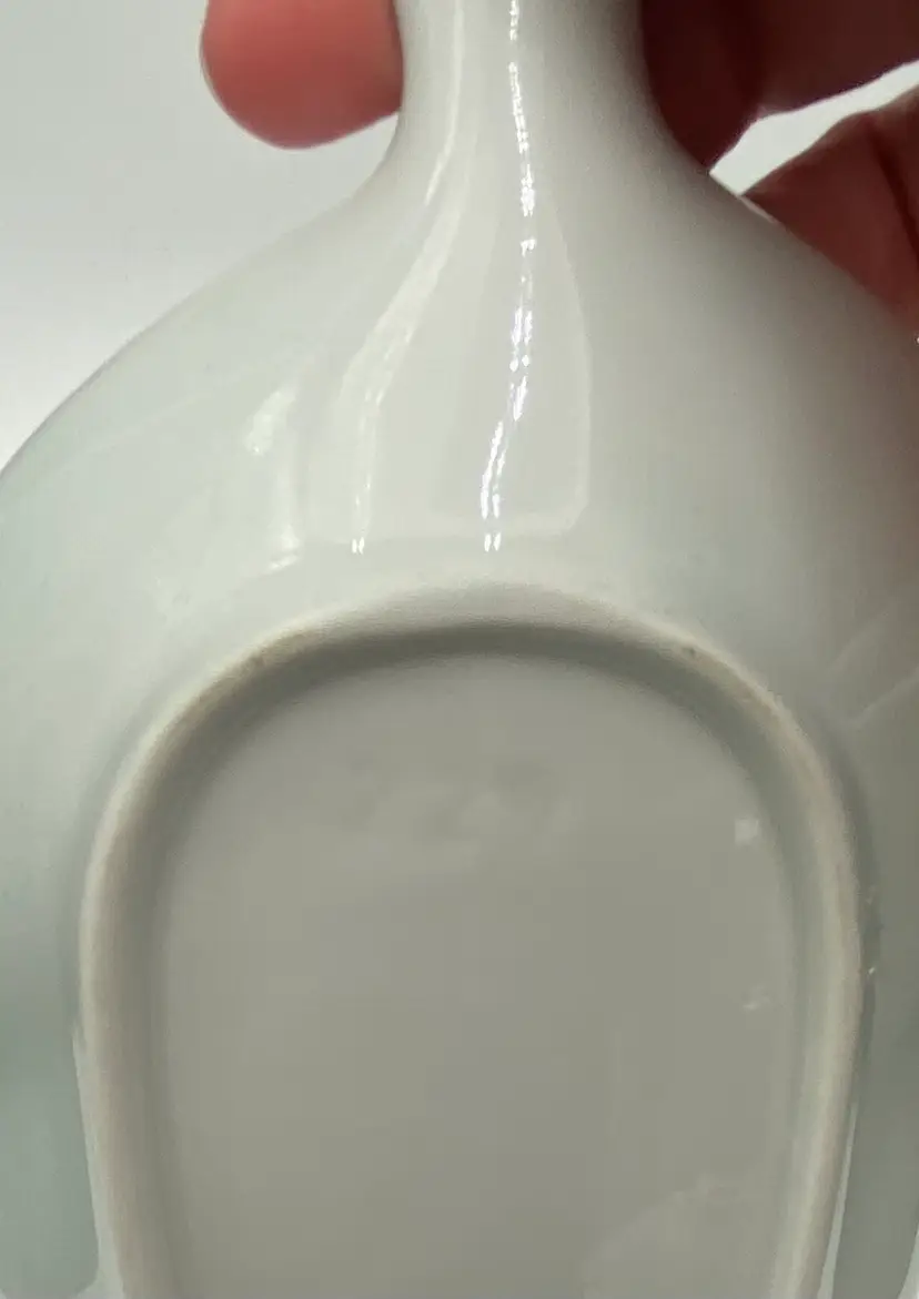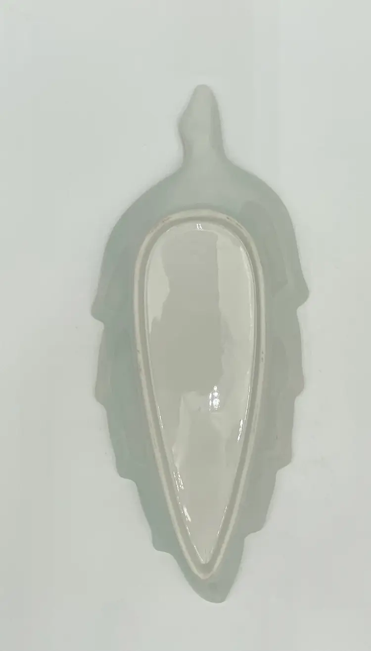 The serving dish is in excellent condition. There are no chips or cracks. The only wear I can see is some slight scuffing on the leaf handle (see final picture).