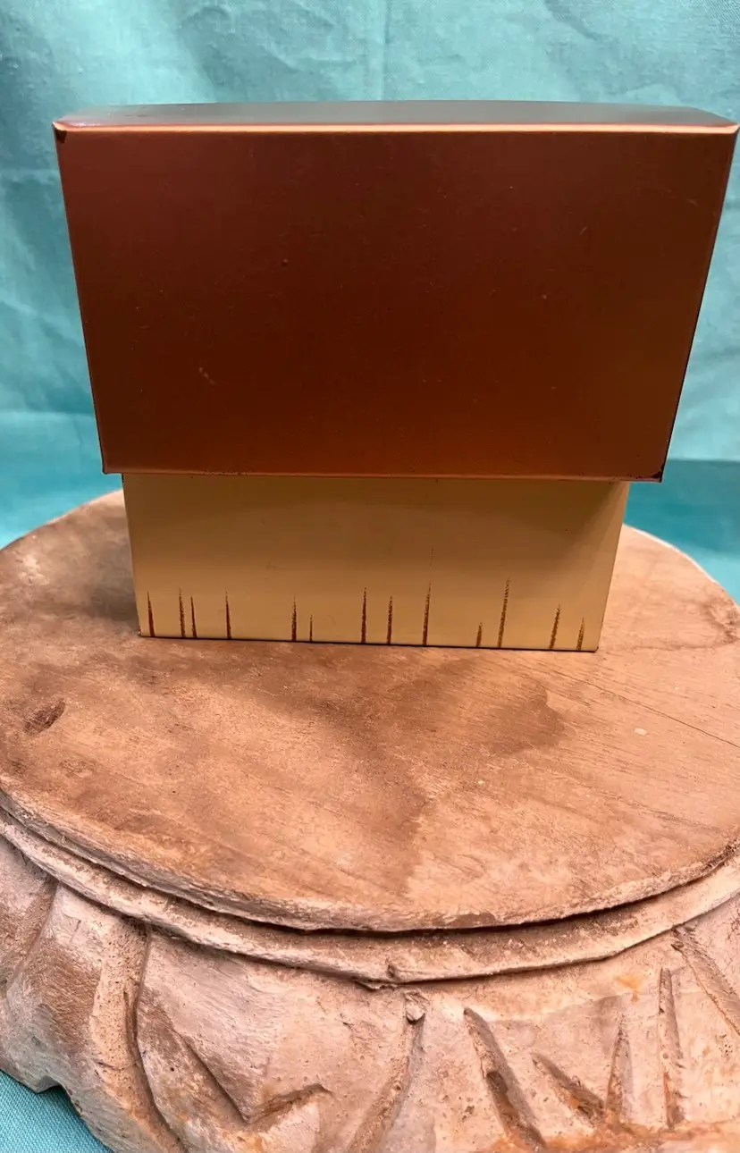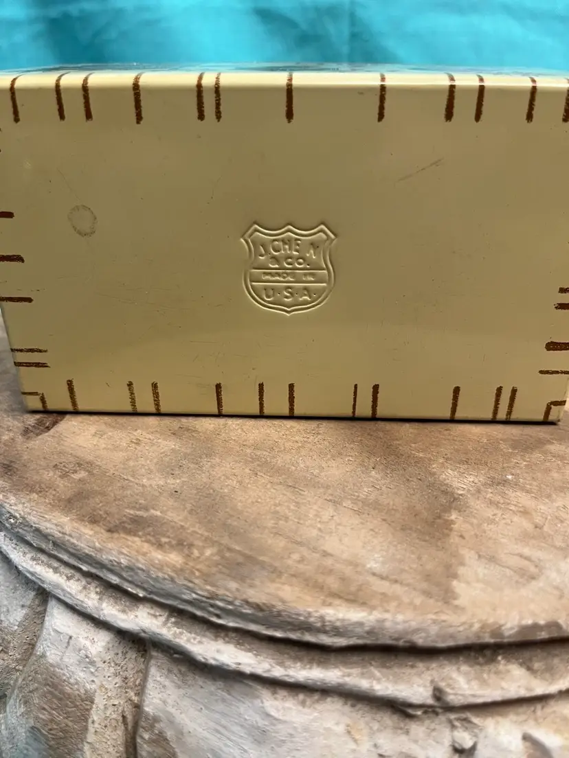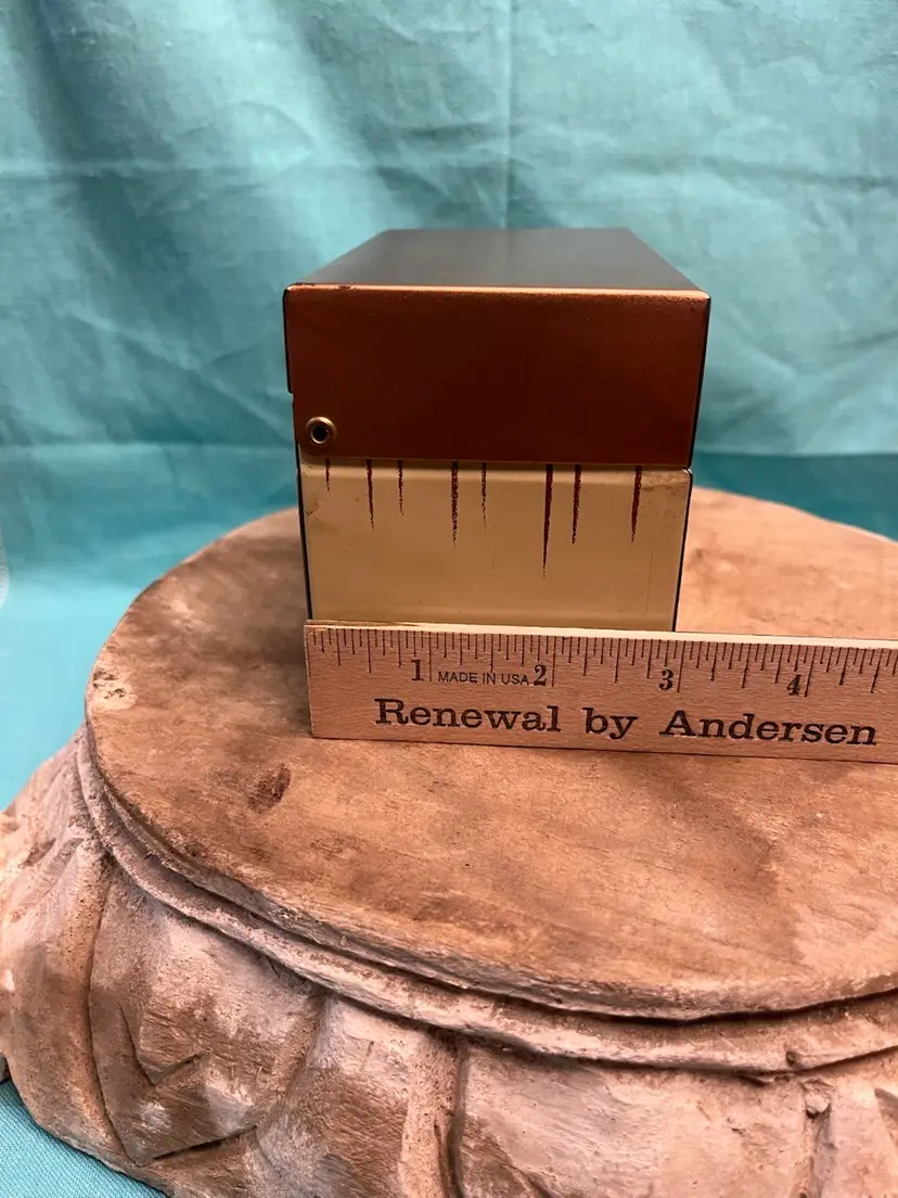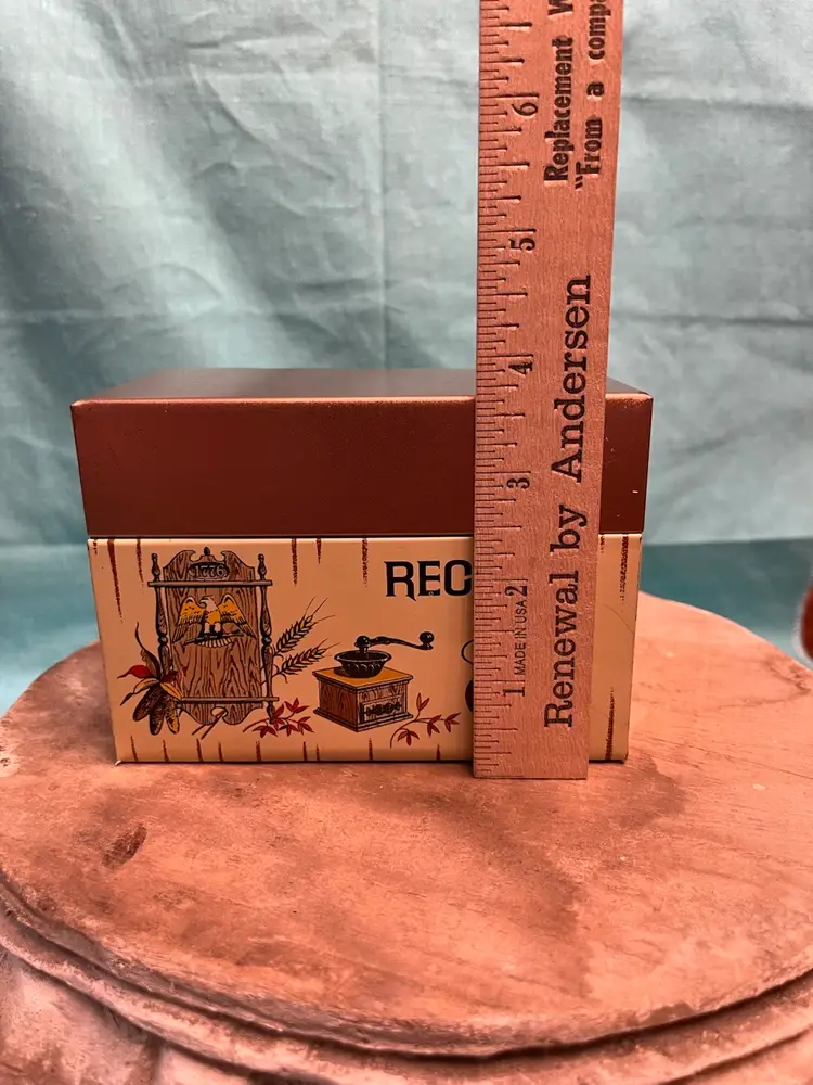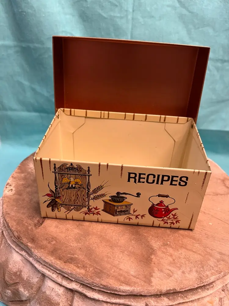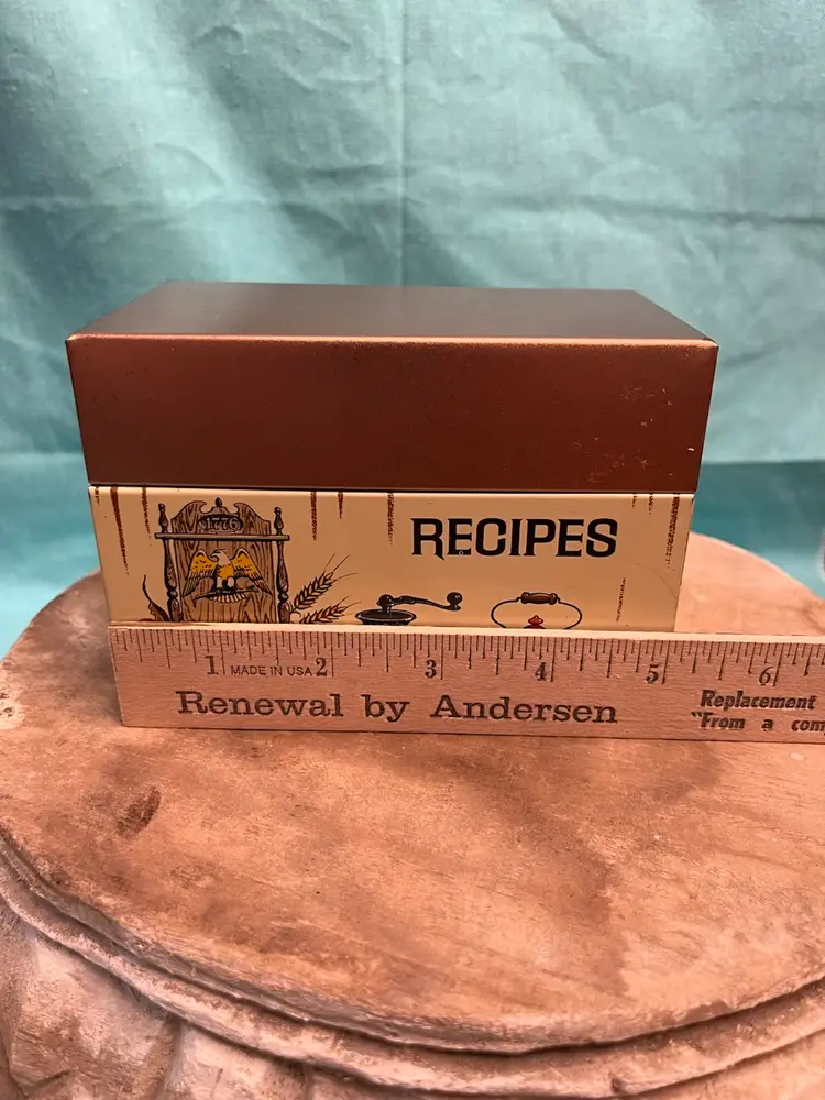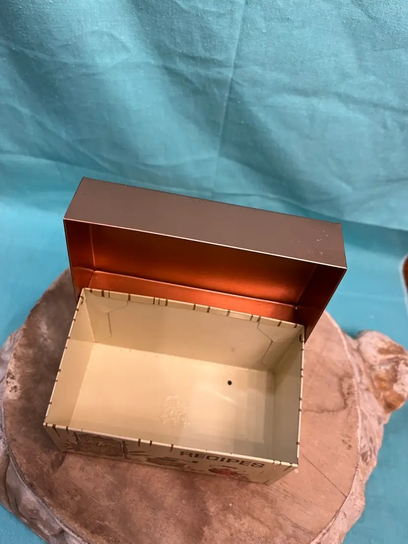 #828 Vintage MCM Tin Recipe Box. Copper lid with yellowish box. Measures 5” x 3.75” x 3”. In like knew condition! Made in USA by J. CHE N & Co