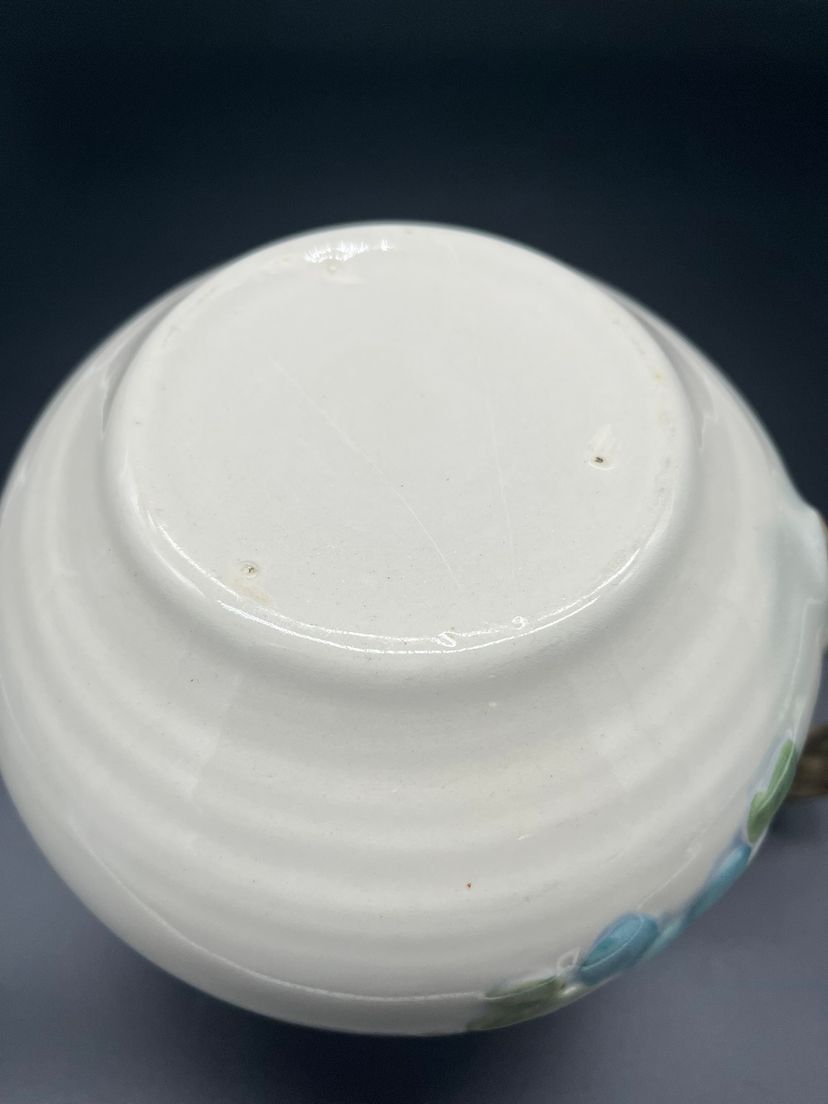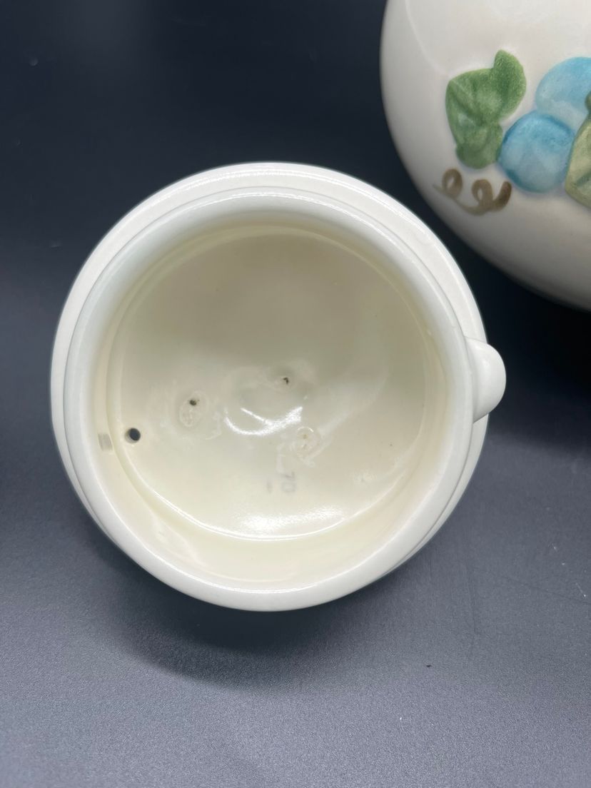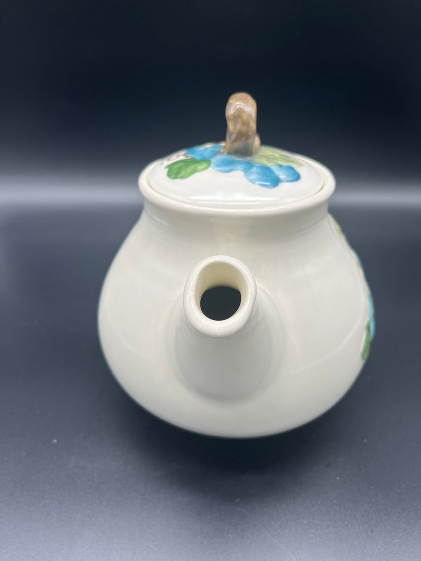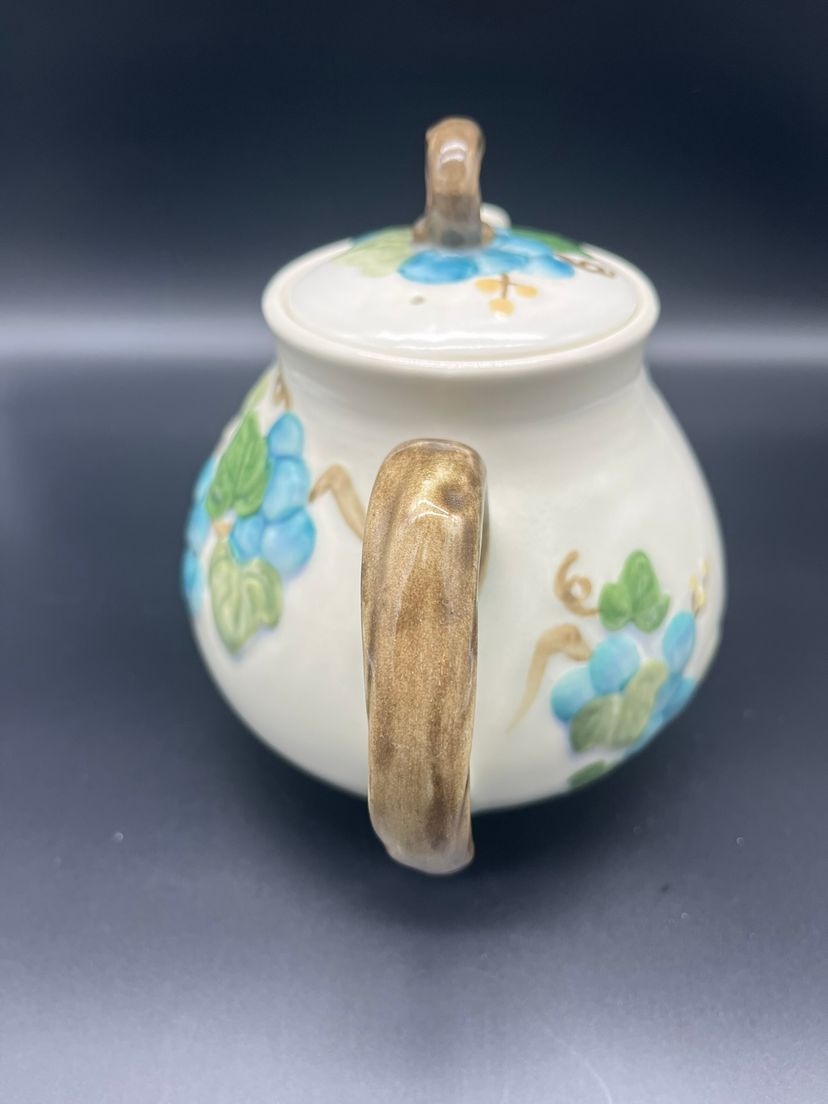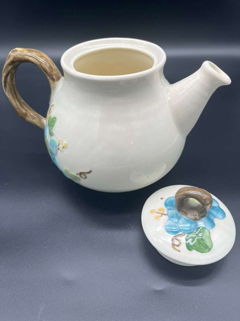 Add a touch of California charm to your kitchen with this vintage Metlox teapot, featuring a hand-painted grapevine motif in rich blues and greens. Crafted in iconic Poppytrail style, this ceramic piece showcases Metlox's signature blend of rustic elegance and mid-century craftsmanship. Likely from 1950s-60s. Perfect for collectors, stylists and anyone who loves a cozy vintage kitchen vibe. Metlox Pottery, California Shipping includes Excellent condition, no chips or cracks. Glossy finish intact. 7" tall, 9" wide (handle to spout), 6" deep