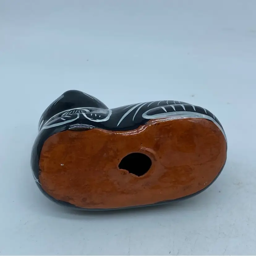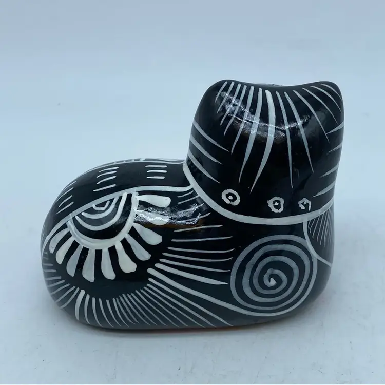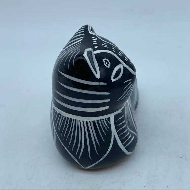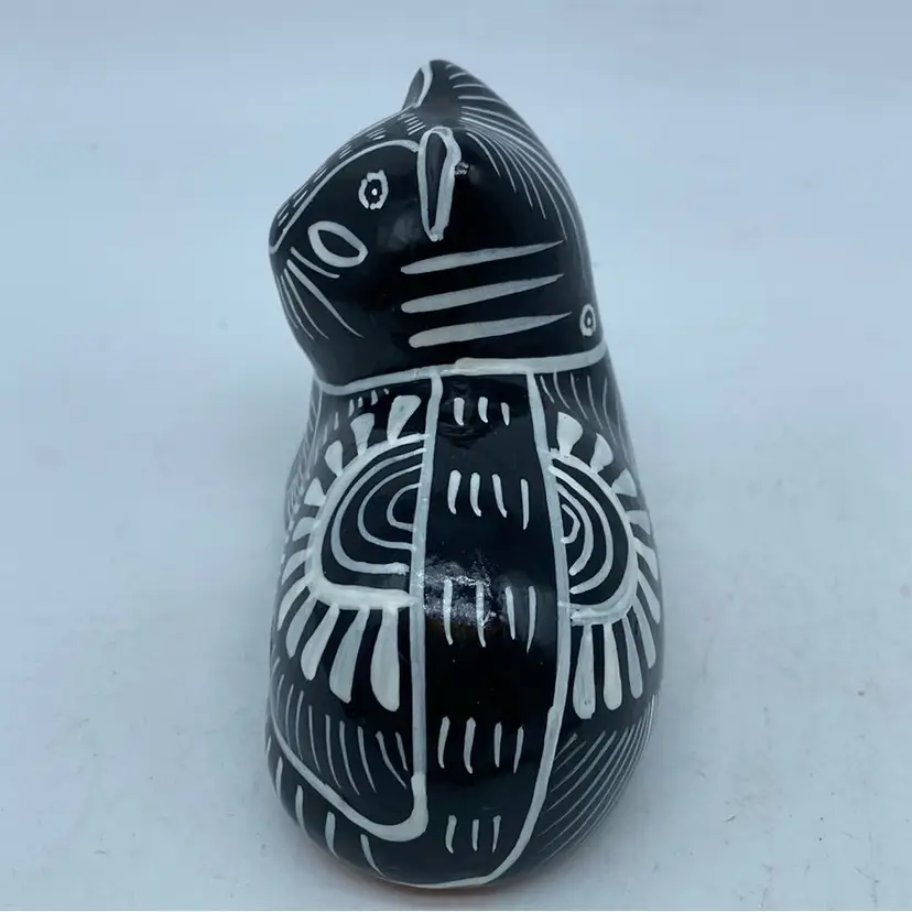 This particular style of black pottery with incised white designs is often associated with regions like Oaxaca or Morelia, Mexico. These pieces frequently depict animals, mythological figures, or scenes from daily life, characterized by bold patterns and a distinctive aesthetic. Such figurines are popular among collectors for their artisanal quality and cultural significance.