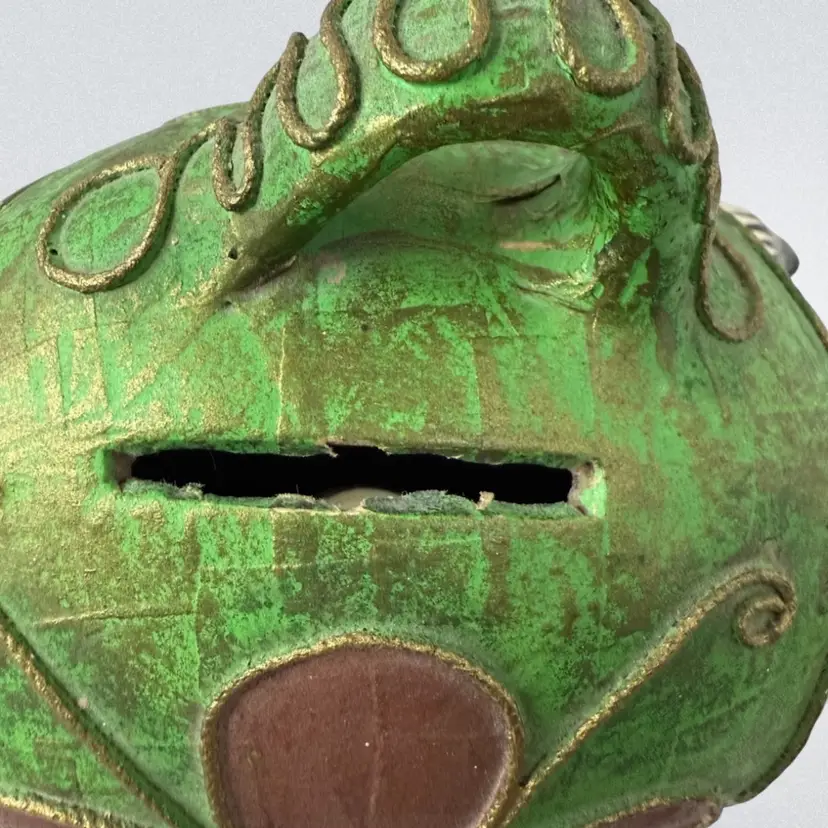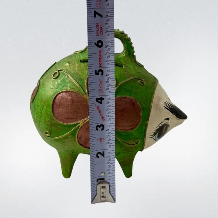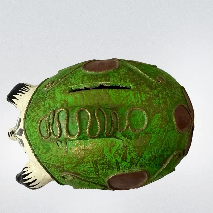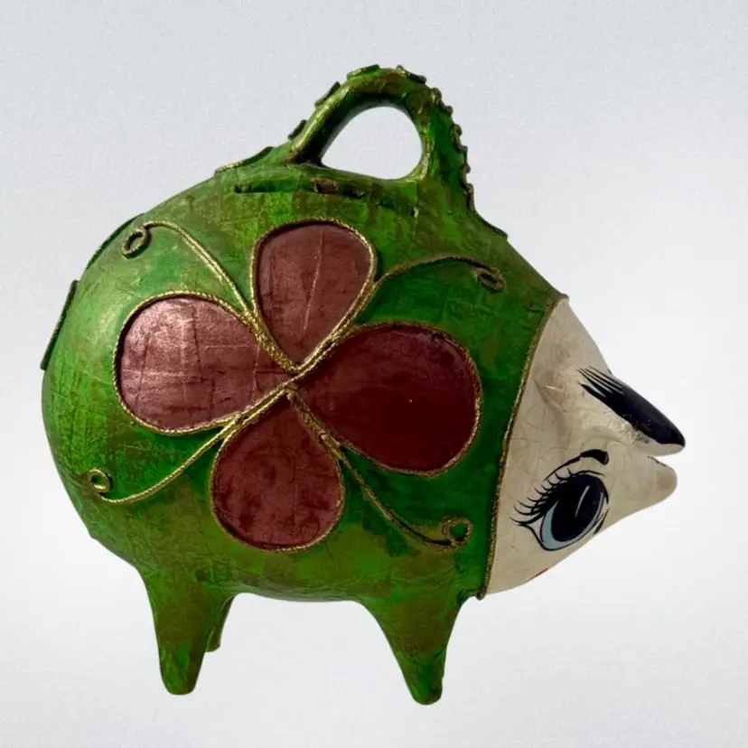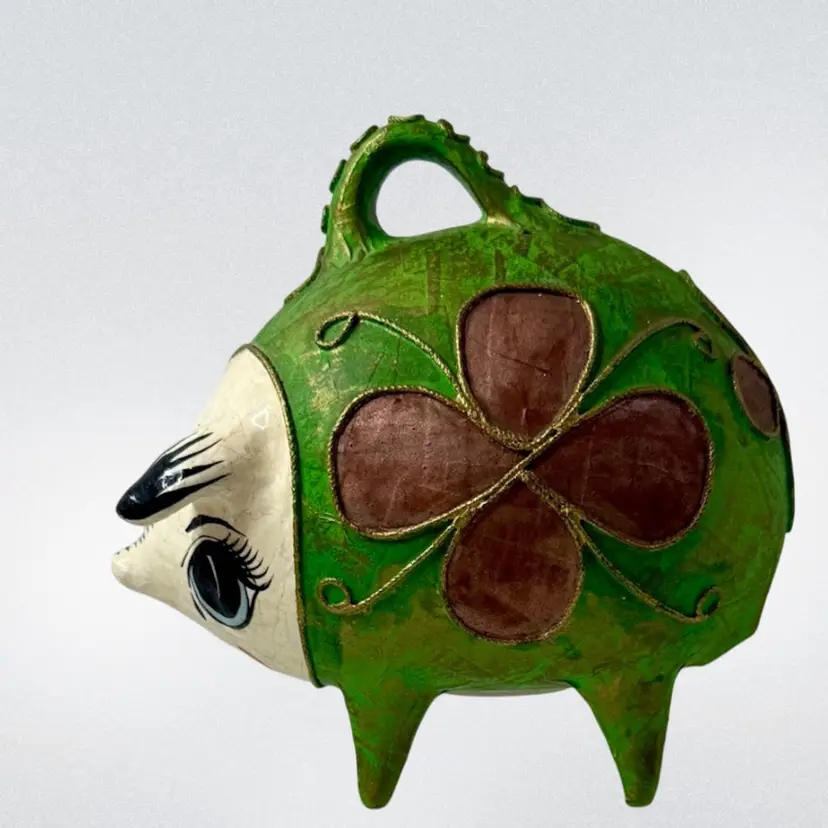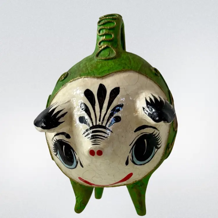 Vintage Mexican Ceramic Pottery Piggy Bank Hand Painted green paper•mache? Colorful and fun!