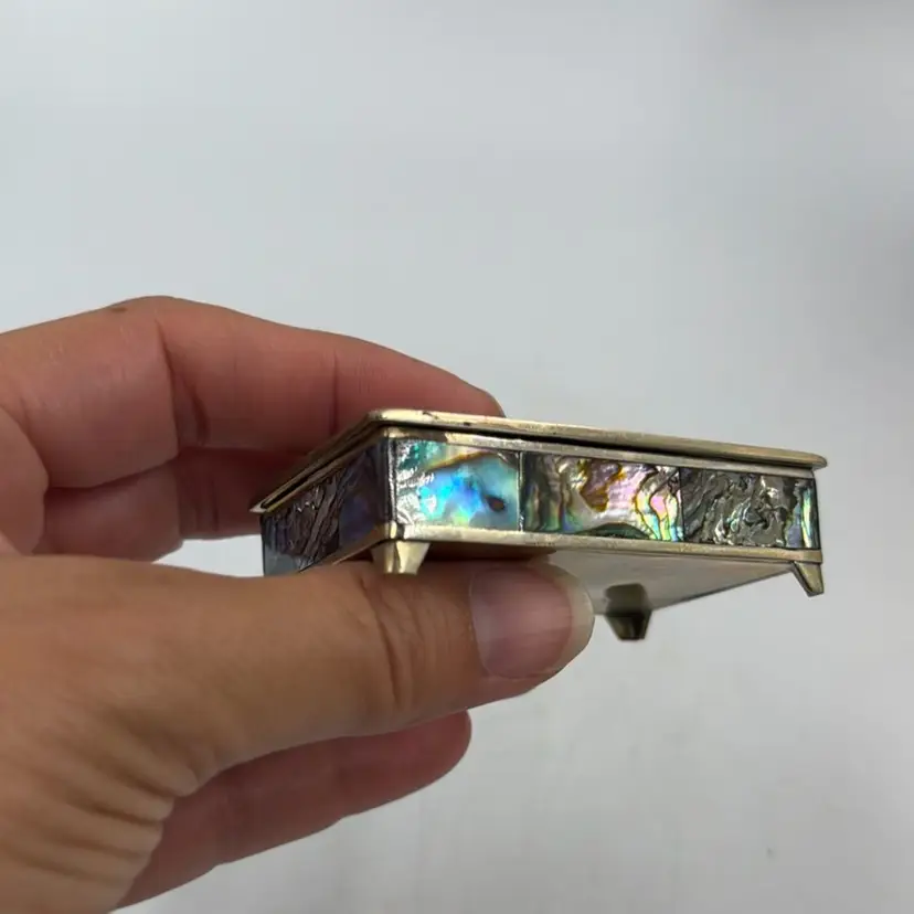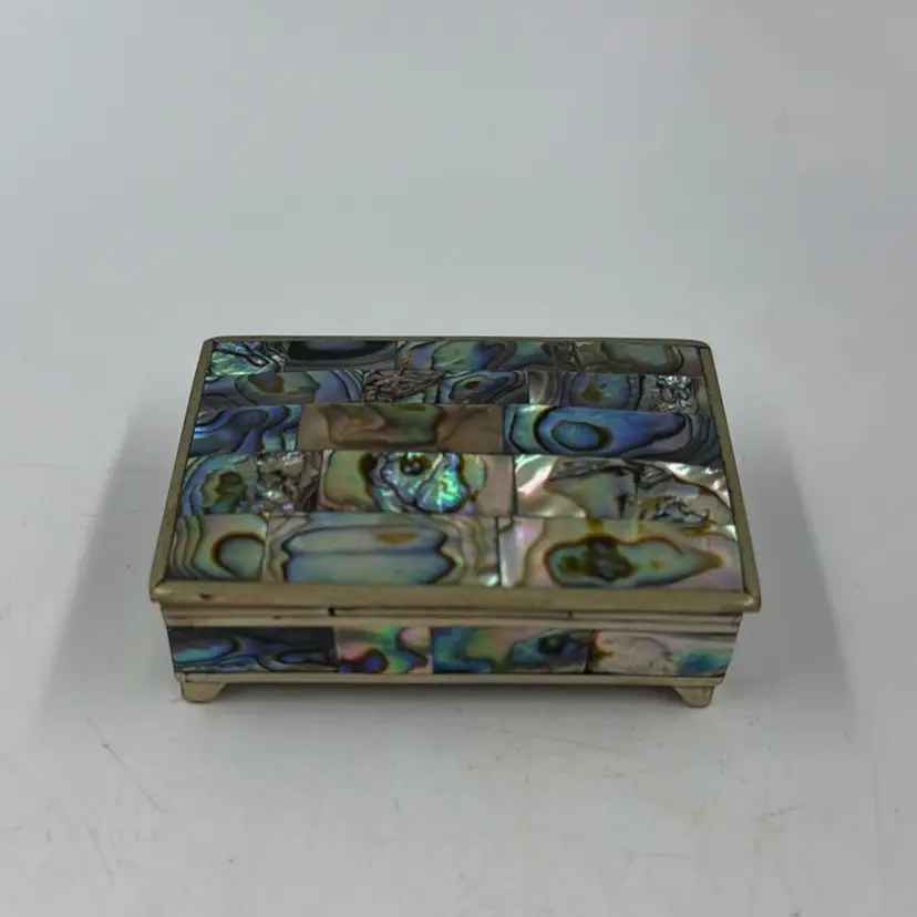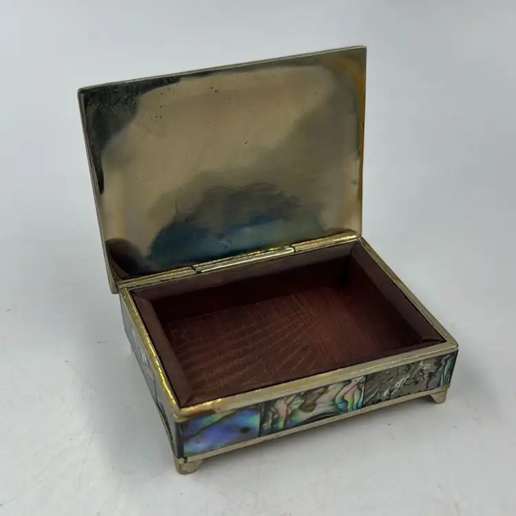 Vintage Mexico Alpaca Silver Abalone Trinket/Pill Box With A Hinge Closure And Wood Interior. 2” x 1.5” x .5” has some vintage wear on the rim. See photos