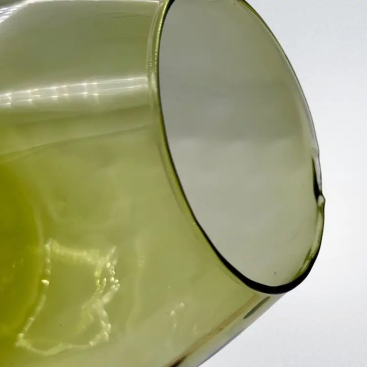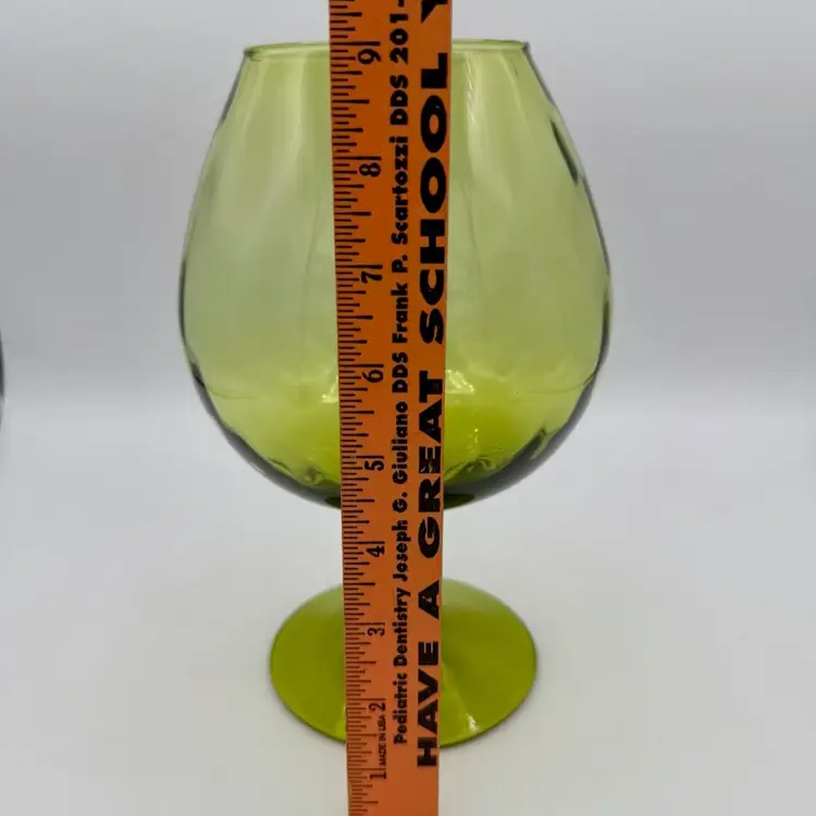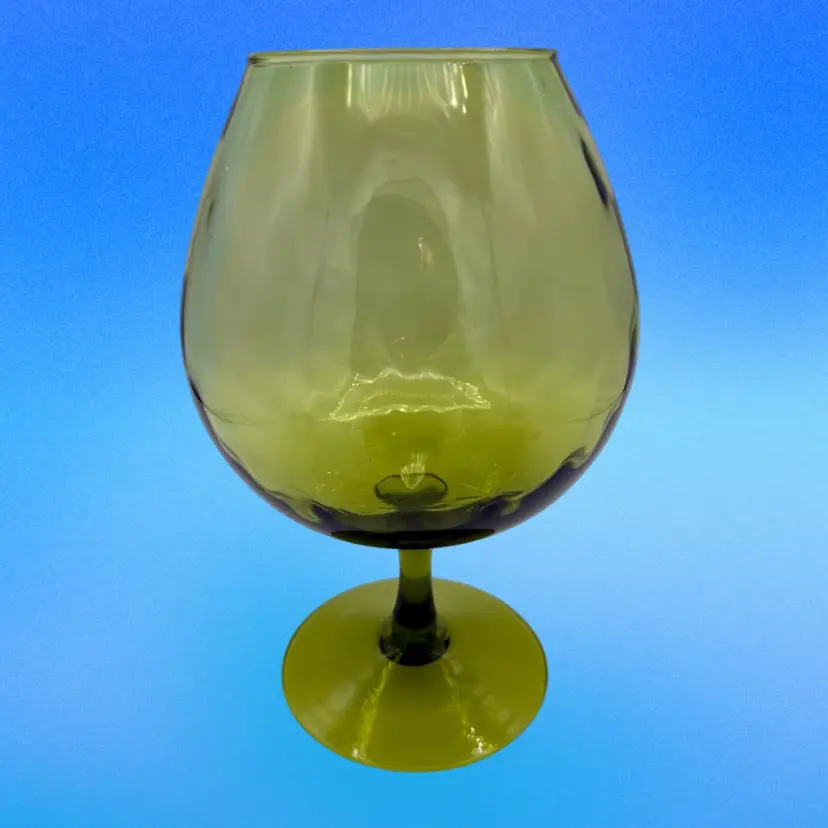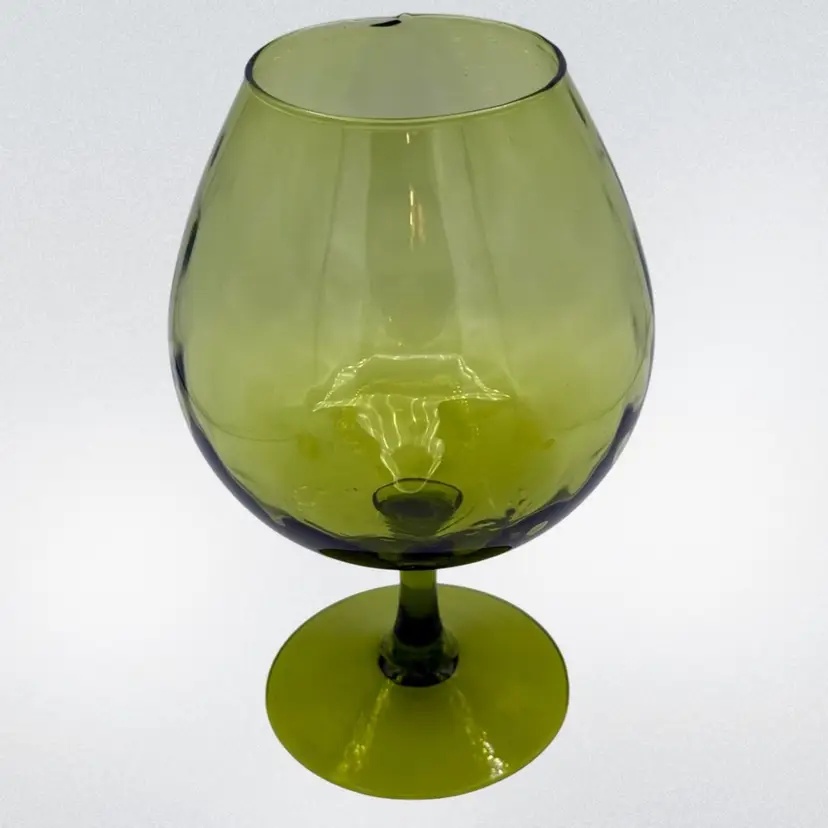 Midcentury vintage Italian blown glass large brandy snifter in olive green glass with a diamond optic twist pattern in the glass. The upper rim is smooth and it has an applied fluted pedestal foot. It measures approximately 9" tall, 6" in diameter at the widest point. In Very Good pre-owned vintage condition. No chips or cracks.