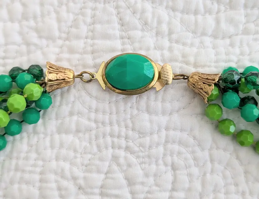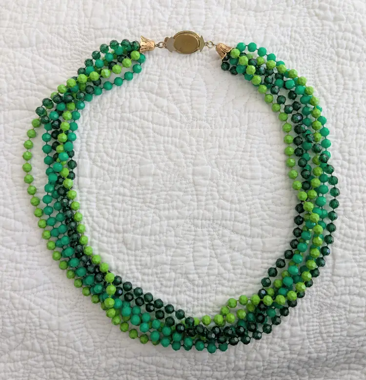 The strands of beads all hang at the same length which is 23". Push-in clasp. Unmarked