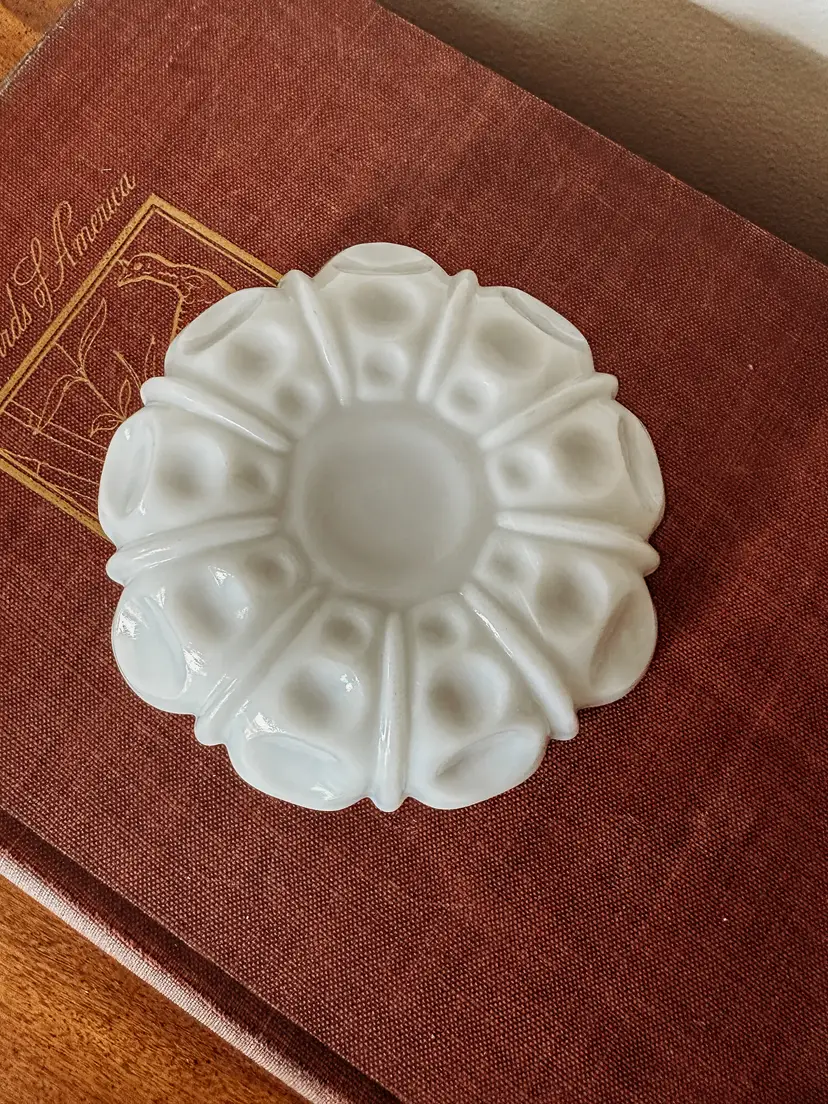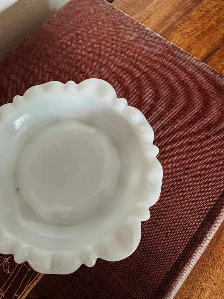 In pristine condition, this HEAVY beauty can be used as a little tray for a small planter pot, as a coaster, trinket dish or pillar candle holder. The detail is so lovely! A great addition to any cottage style home!