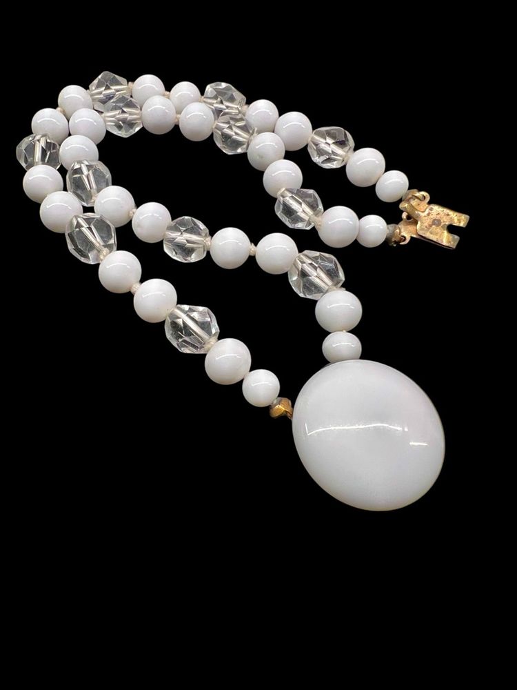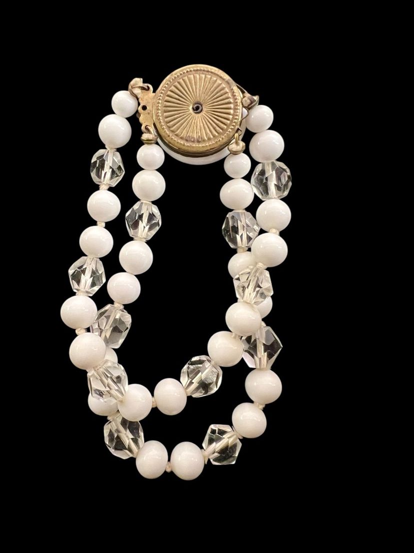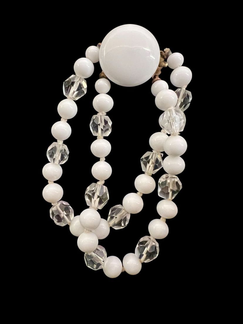 Vintage Milk Glass Hand Knotted Faceted Clear Glass Beads Bracelet #G-10