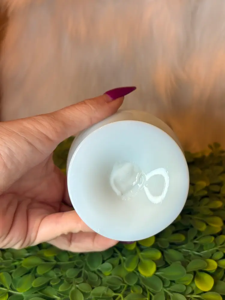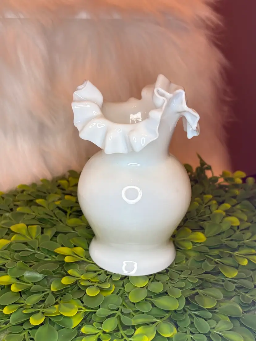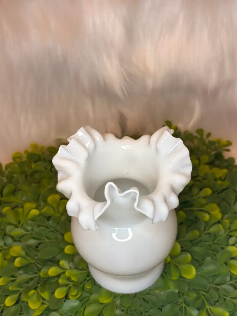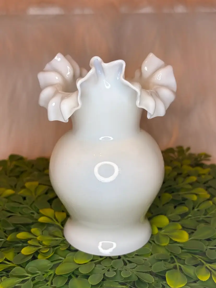 Vintage Milky Opal “Ring of Fire” Glass Vase with Ruffled Rim, hand-blown 5.5” tall. When held to light, there is a red coloring in milk glass also known as the “Ring of Fire”. Damage free.