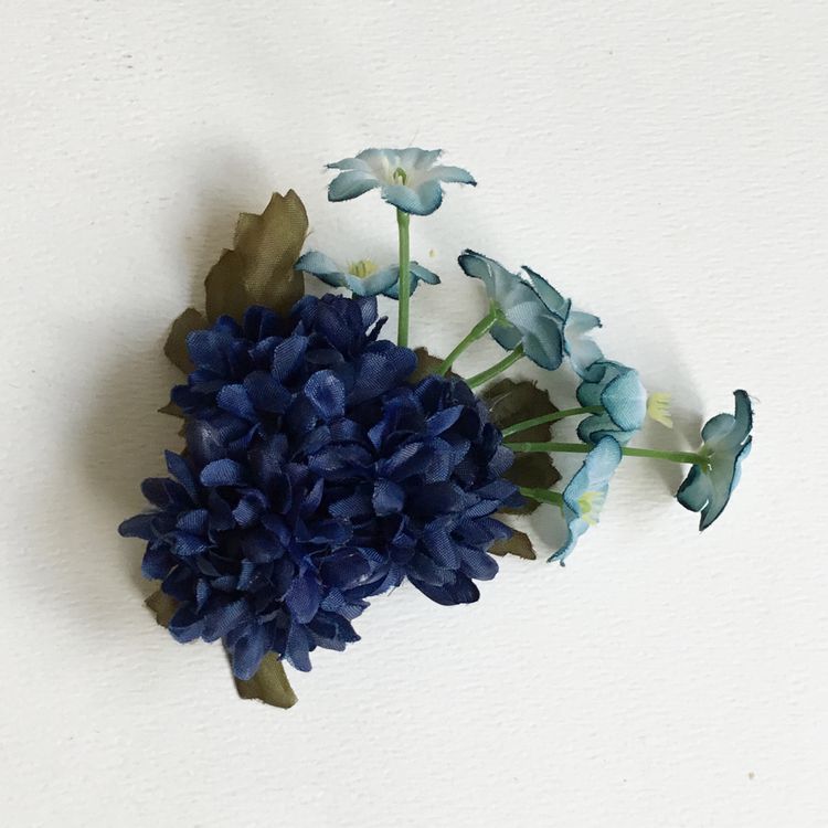 In good preowned condition. The hair clip with the cluster of blue flowers has a stem with a split in it.