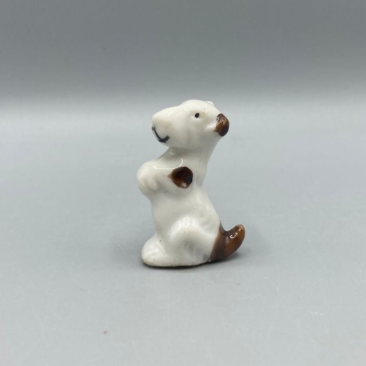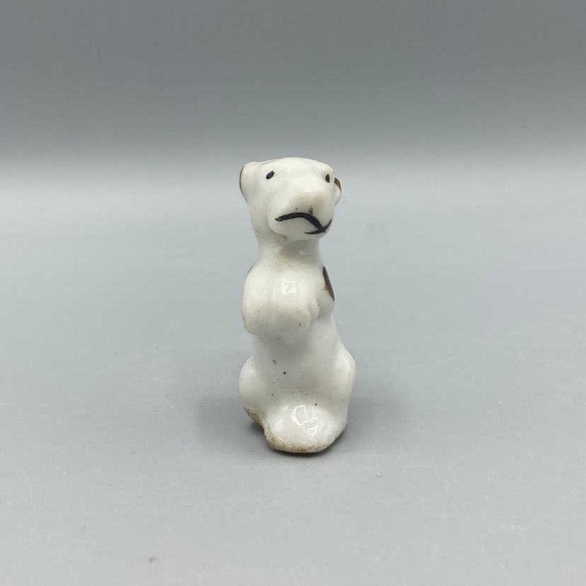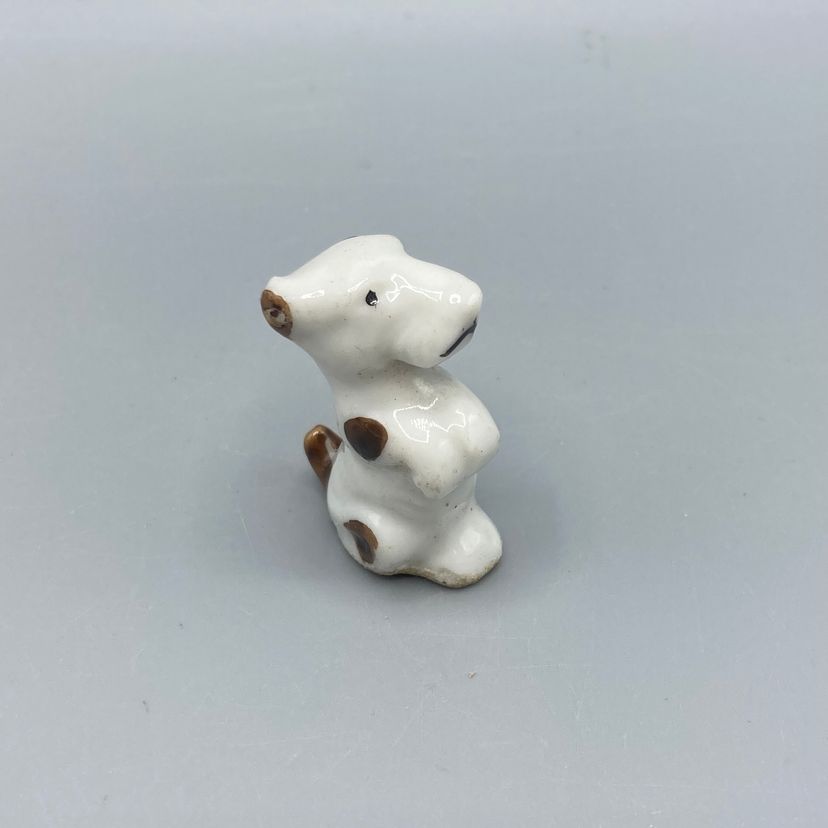 This dog is in good condition. There is a manufacturing issue at the base of the dog where the glaze didn't cover under the leg on the side with the spot. He measures approximately 1 1/2" tall x 1" x 3/4".