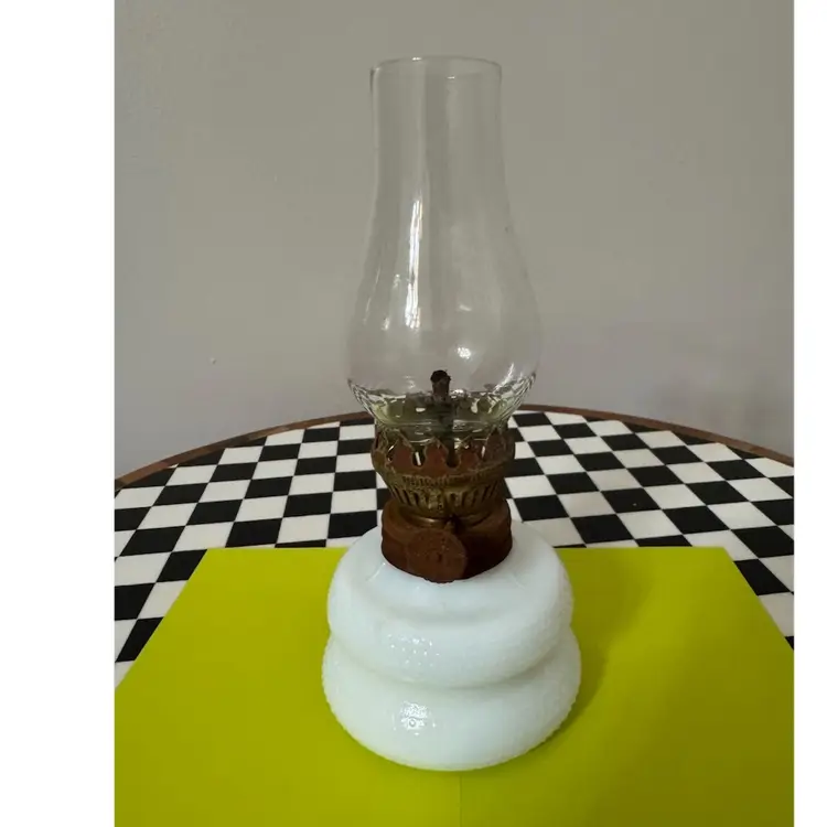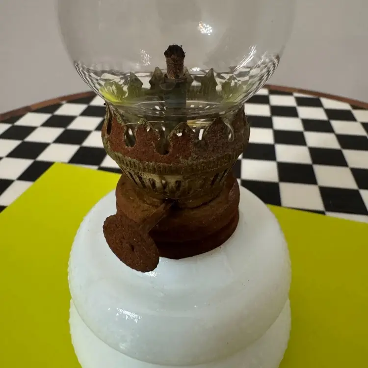 Adorable miniature milk glass oil lamp. Made in Hong Kong. Wick still moves! Rusty awesomeness! No chips or cracks measures about 6 1/2 inches tall.