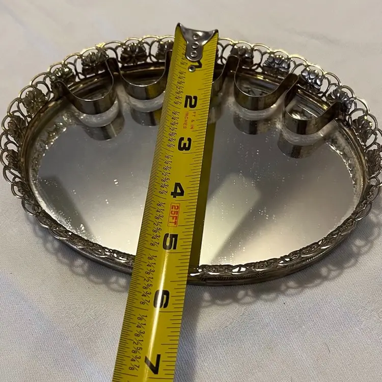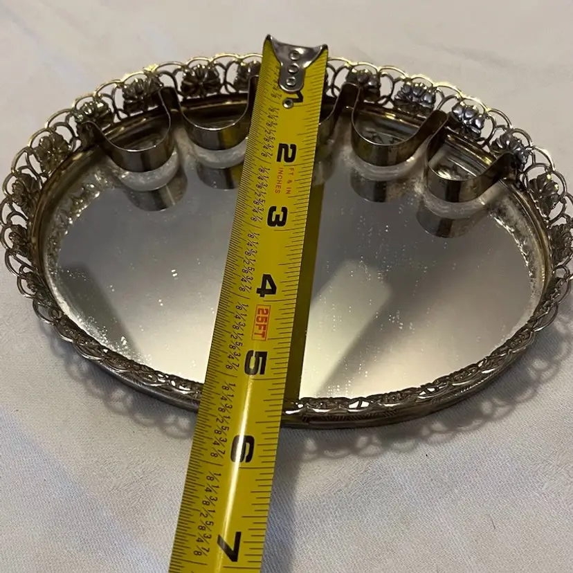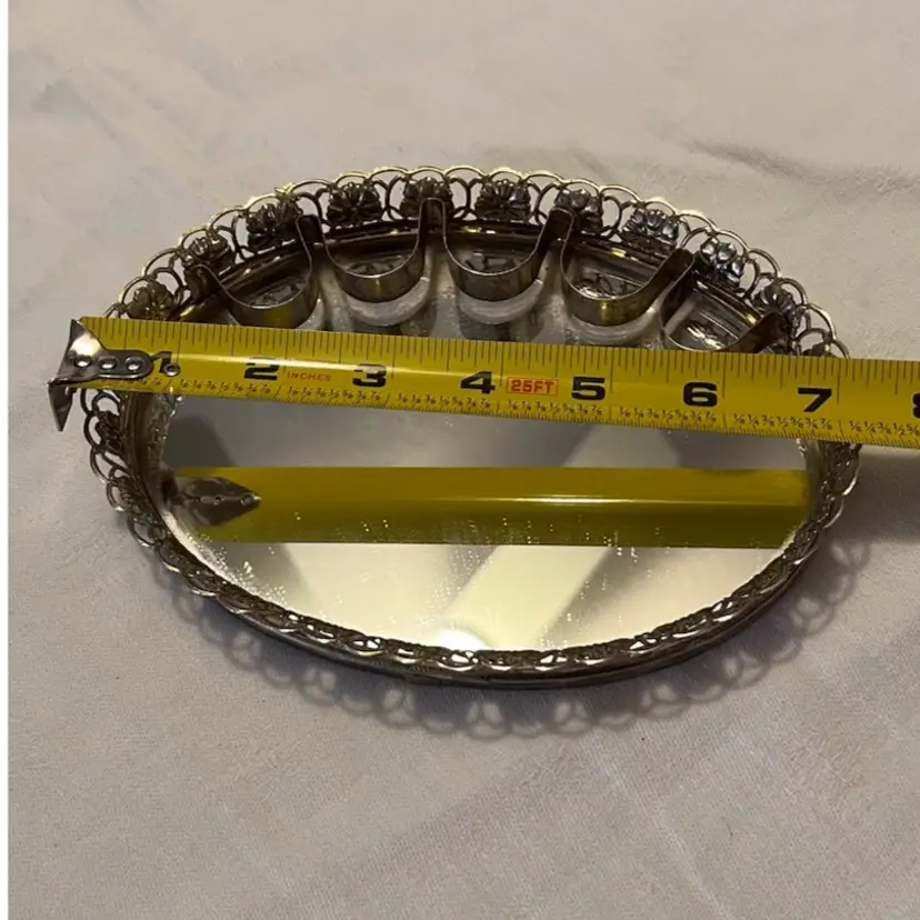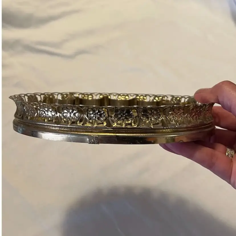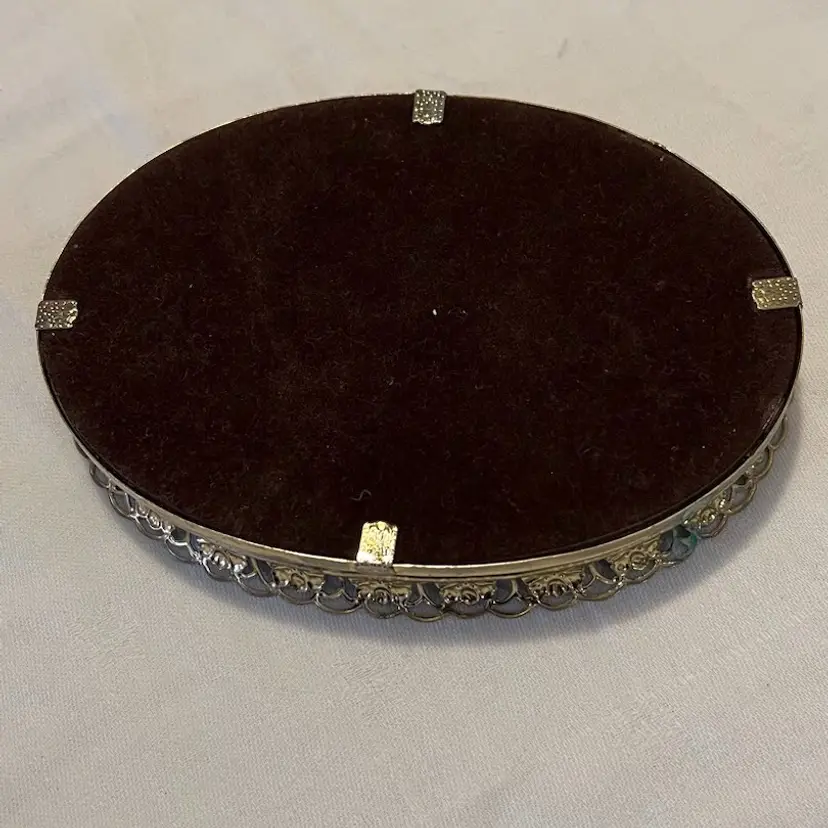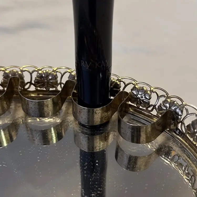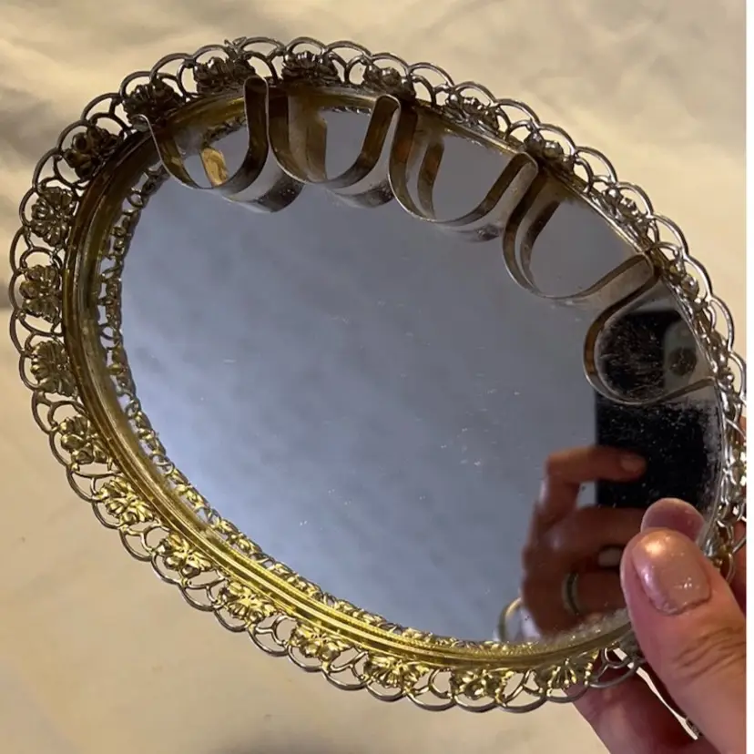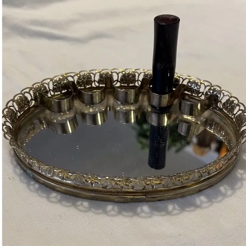 This goldtone vintage vanity tray has filigree detailing. Slots for five lipsticks. Felt bottom prevents scratching on furniture or stone countertops. Add makeup, jewelry, a small plant or photo for a wonderful vignette. Beautiful, boho piece! Measurements in photos.