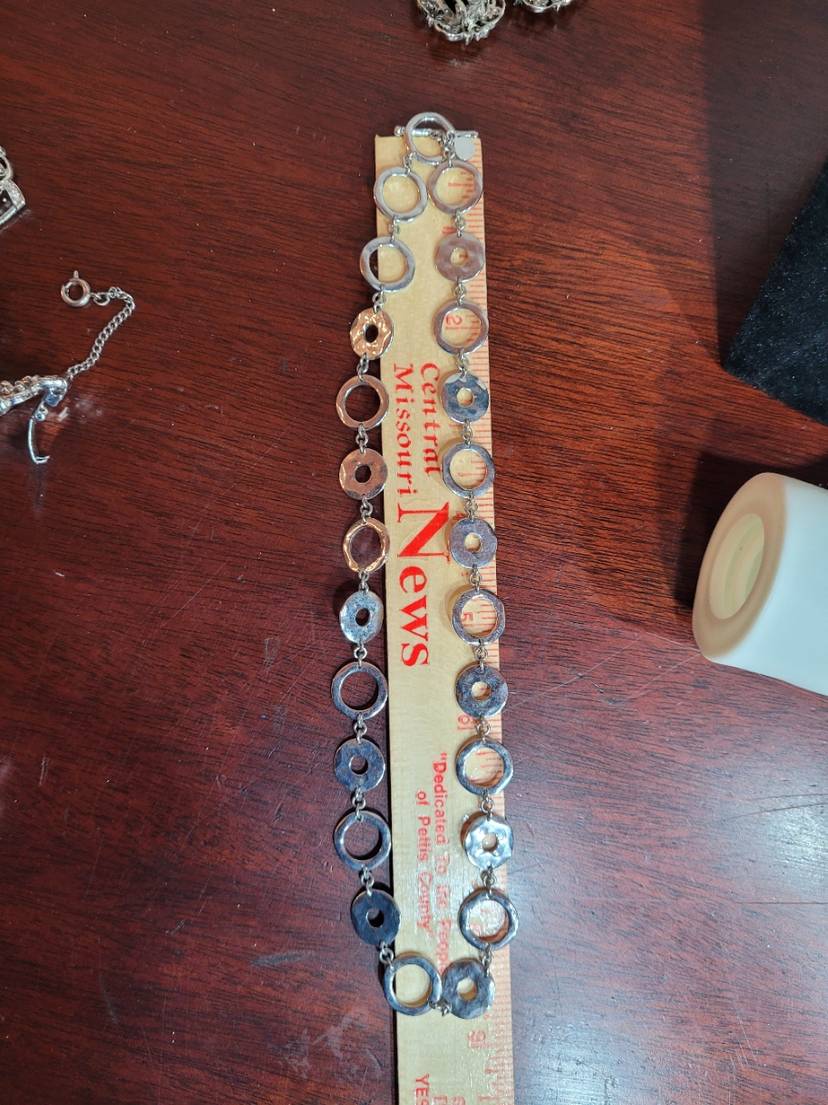 This lot includes 2 necklaces a bracelet and clip on earring set. The bracelet and earrings are not marked but do match with silver tone and mirror/glass pieces. The bracelet is heavy with a fold over clasp and safety chain. The earrings MATCH and are CLIP ON Earrings are about 1 inch in length. Bracelet is 7 inches in length. Also included is a lovely silver tone loop chain that has a mark on it I have no been able to identify. It is NOT flimsy. It is about 17 inches in length with a toggle clasp. The last necklace has no clasp, but had various metal beads as well as shell in black, silver and gold tones. It appears to be on a cord, but is very well made. All pieces are included in this LOT.