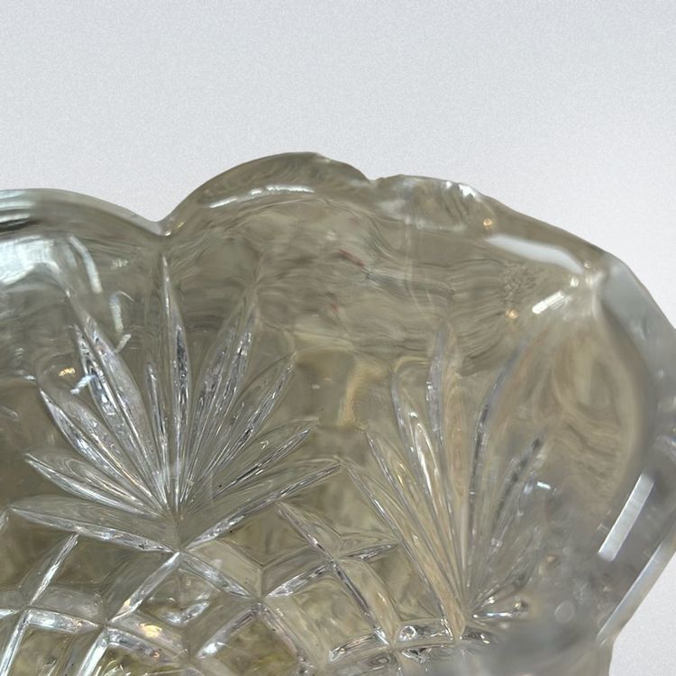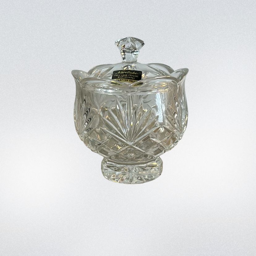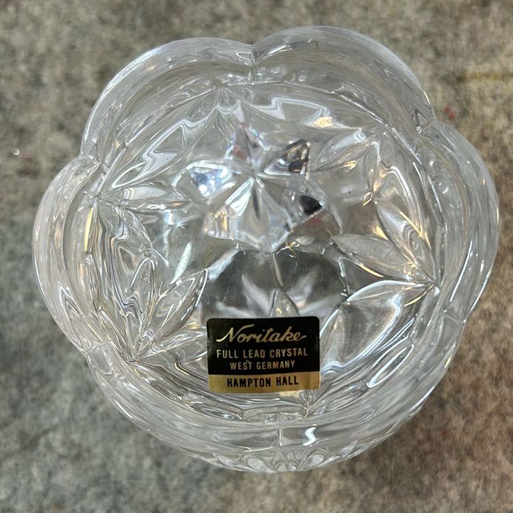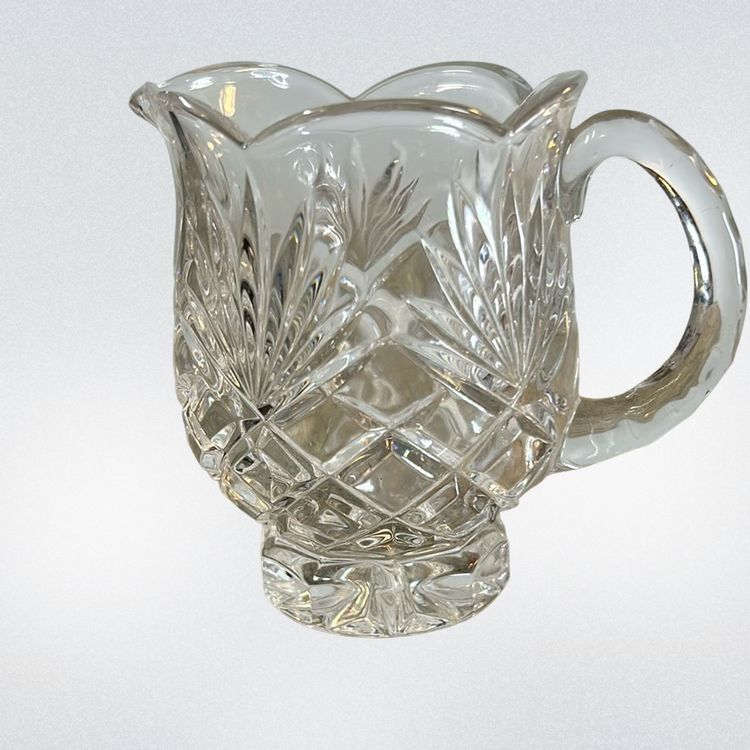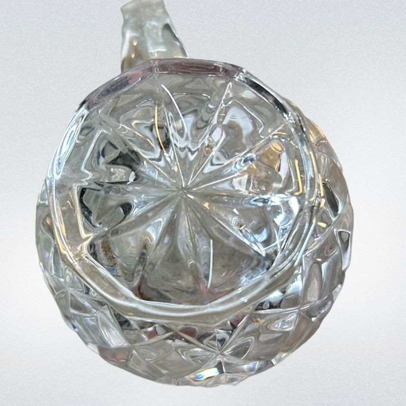 Noritake Crystal beautiful cream er and sugar set. There is a small chip on the creamer. I tried to get a picture but it was difficult. You can’t really tell it’s there unless you rub your finger on it. They both stand about 3 inches tall.
