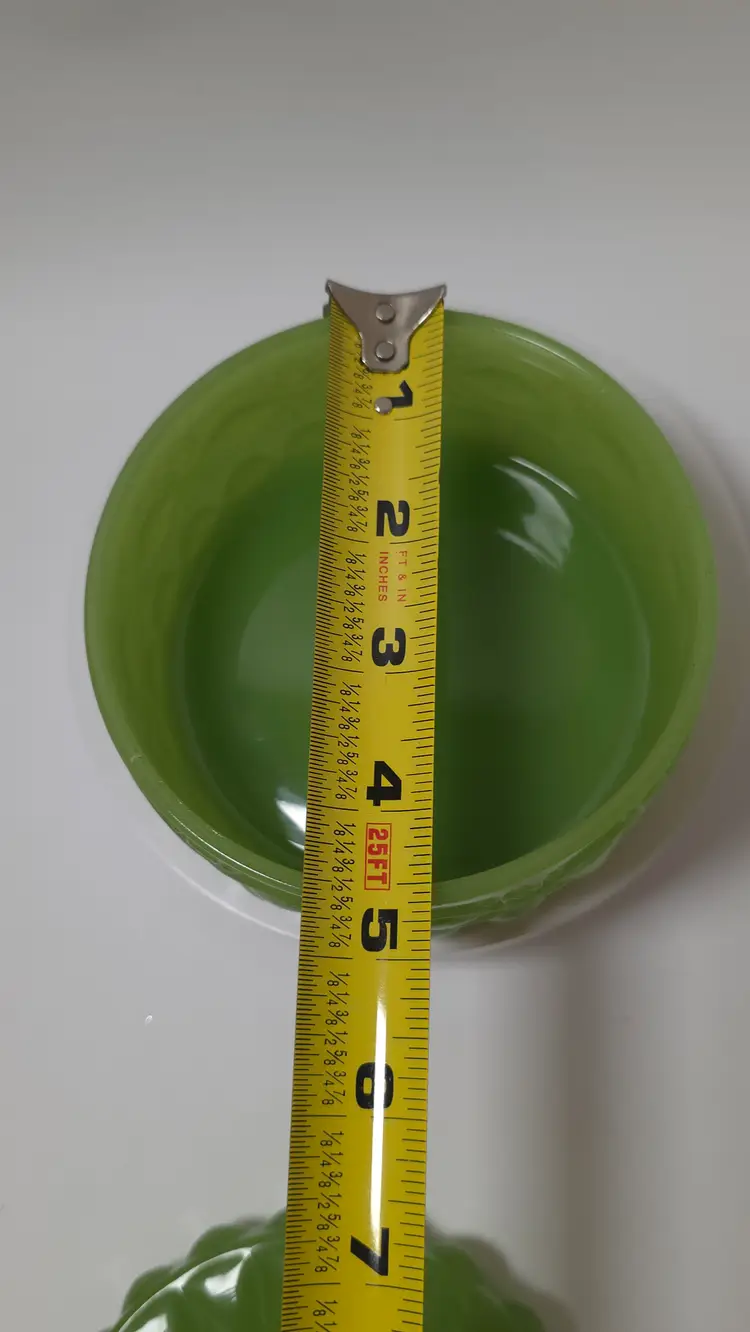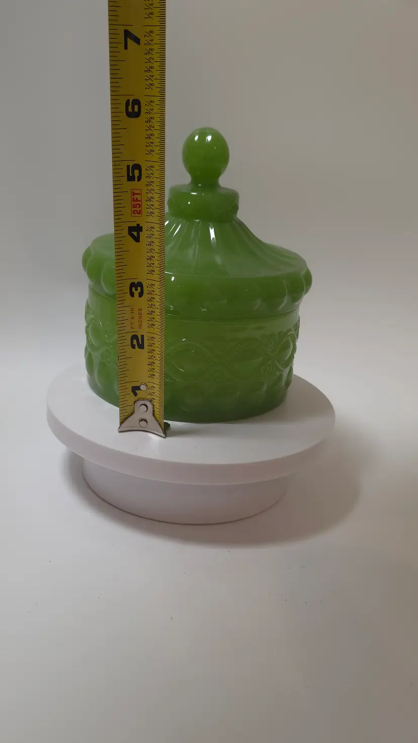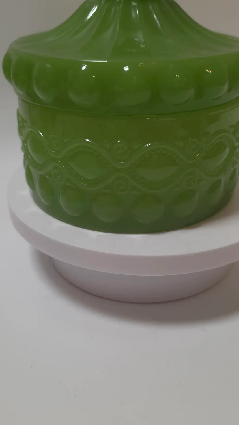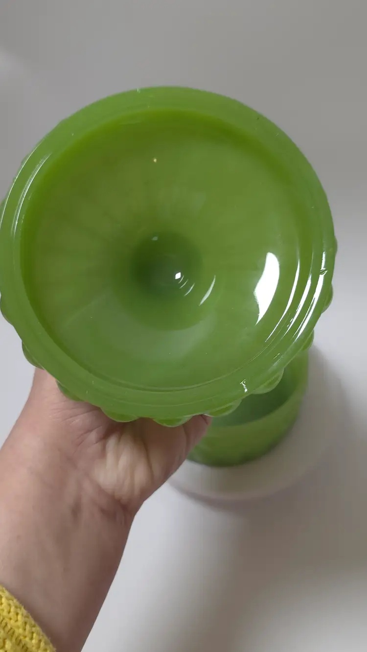 The Vintage Mosser Eye Winker Lidded Candy Dish is a charming piece of opalescent green glass made in the United States. This round candy dish features a glossy finish and a pressed glass production style. The lid included helps to preserve the freshness of your candies while adding a nostalgic touch to your decor. This unique and collectible item from Mosser is sure to be a standout piece in any glassware collection.