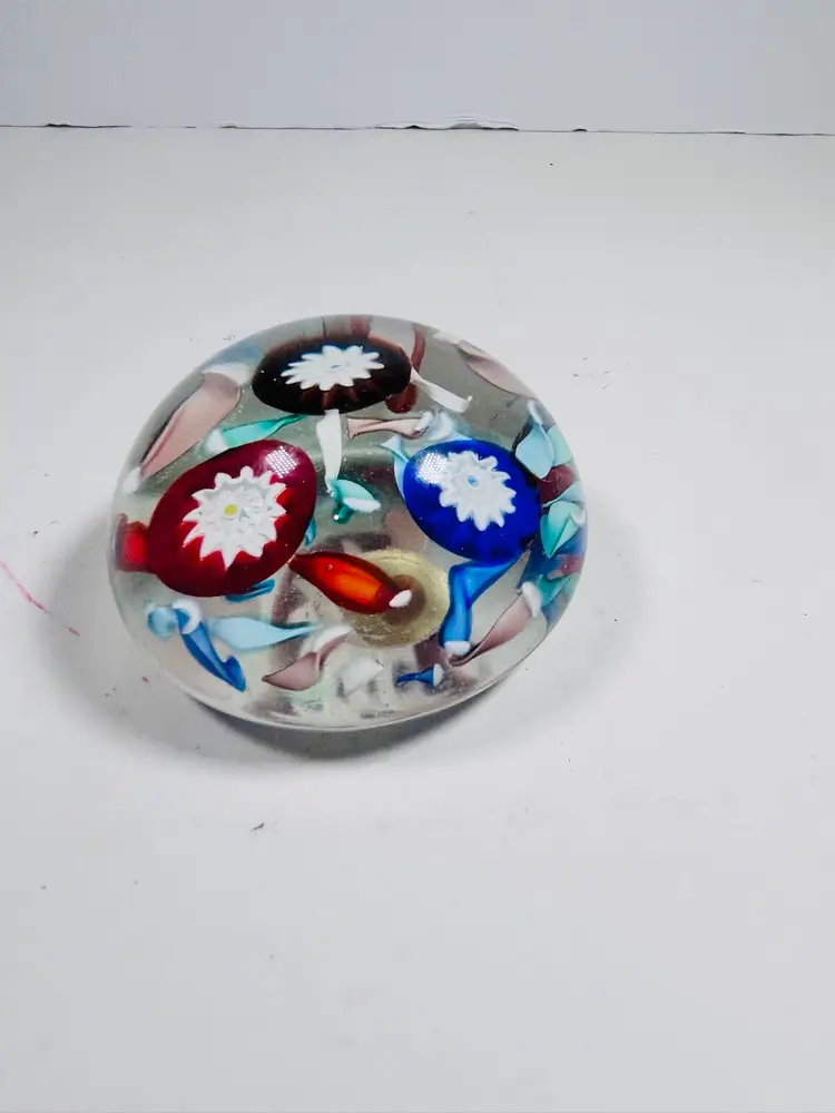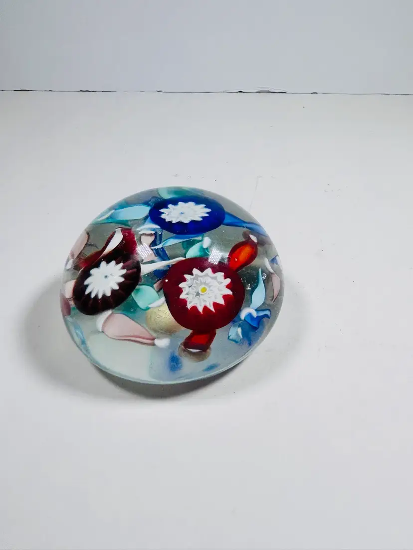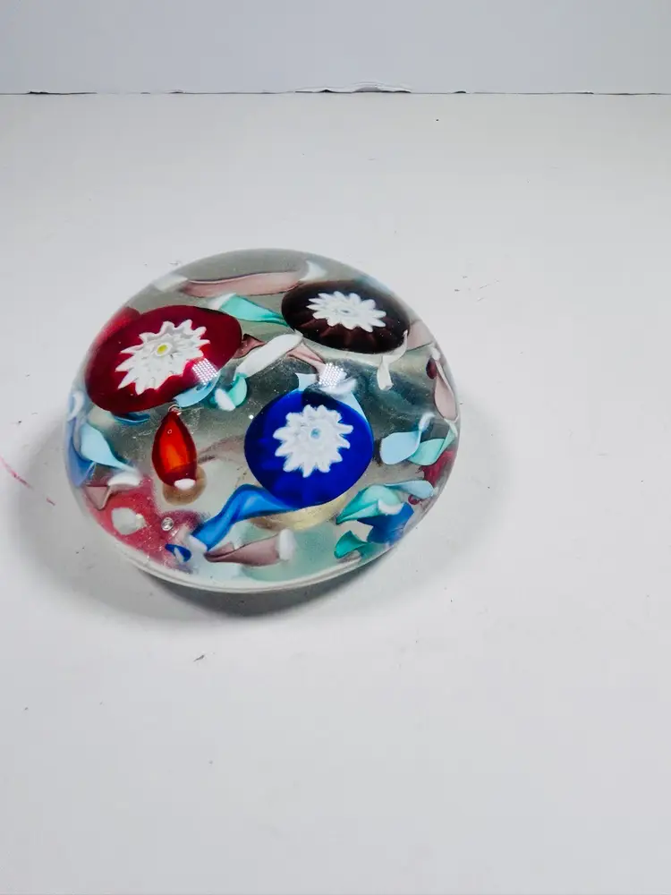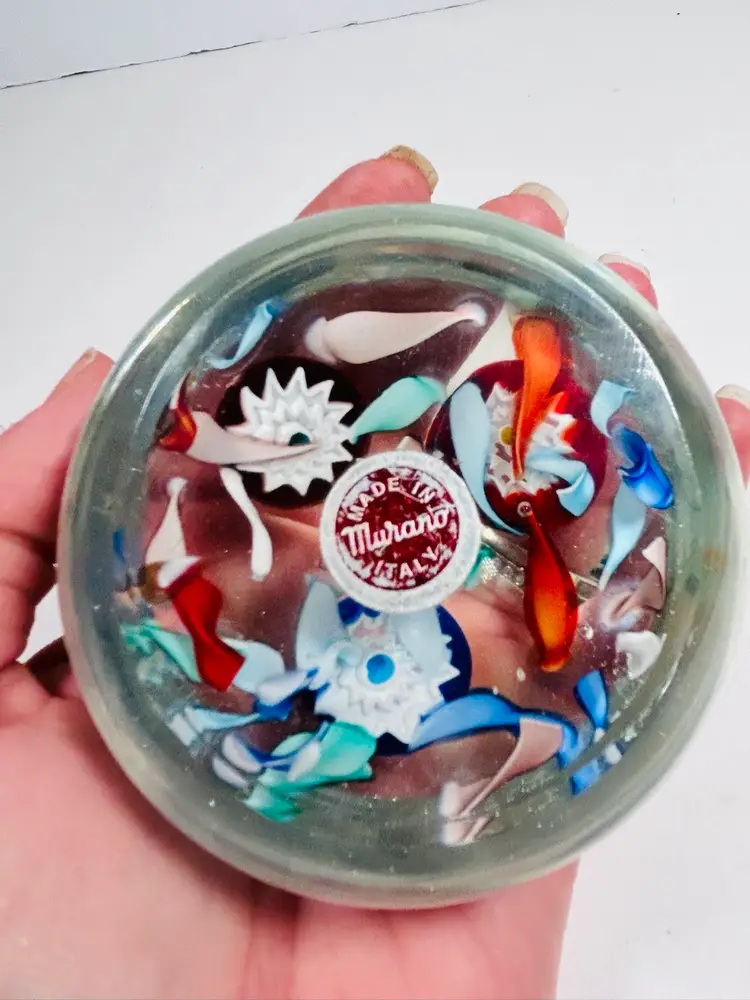 This vintage Murano paperweight features a colorful Millefiori ribbon scramble design. Hand-blown in Italy, it showcases the intricate Latticino glassmaking technique. With origins in Murano, this original art glass piece embodies the classic style of Murano glassmaking. No chips bruises or cracks