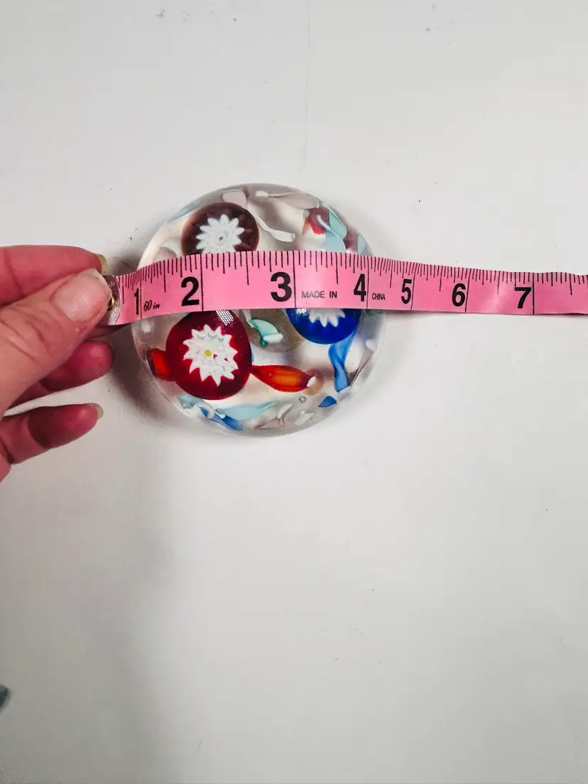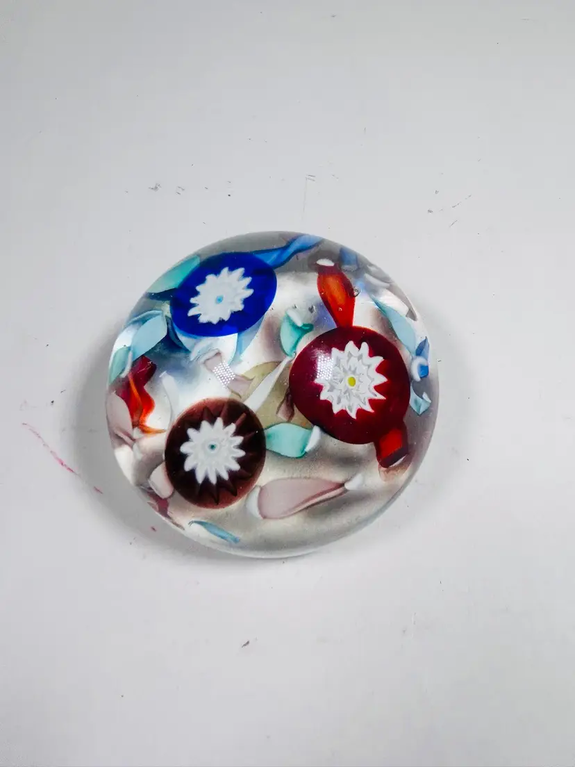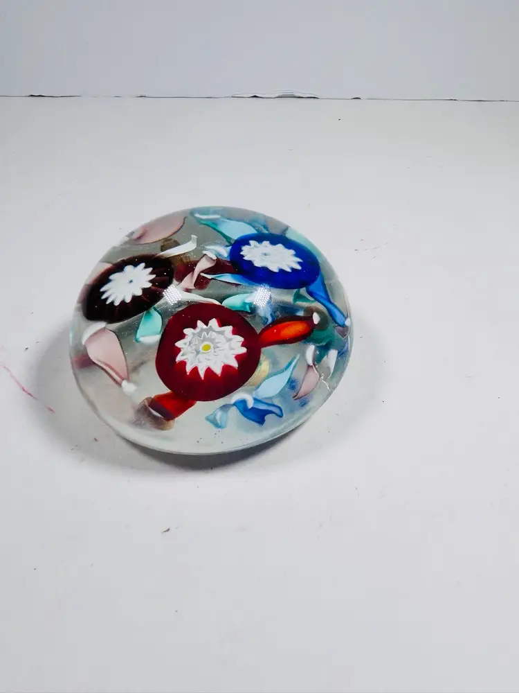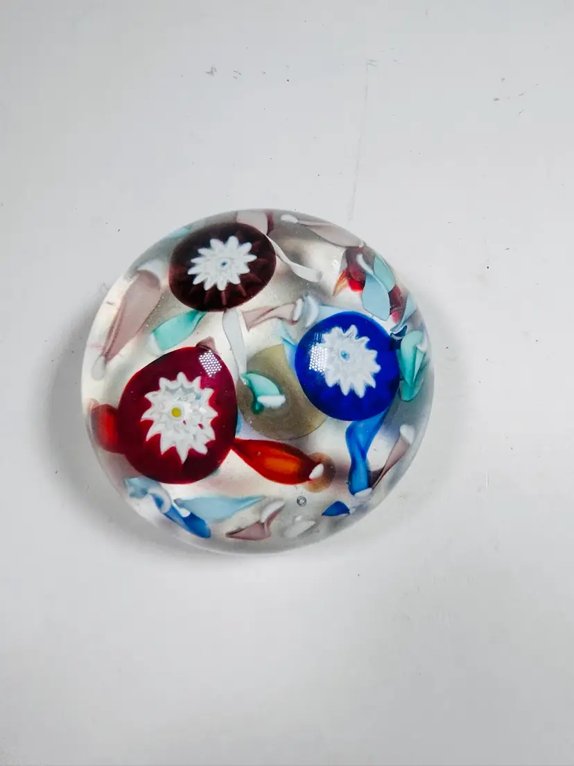 This vintage Murano paperweight features a colorful Millefiori ribbon scramble design. Hand-blown in Italy, it showcases the intricate Latticino glassmaking technique. With origins in Murano, this original art glass piece embodies the classic style of Murano glassmaking. No chips bruises or cracks