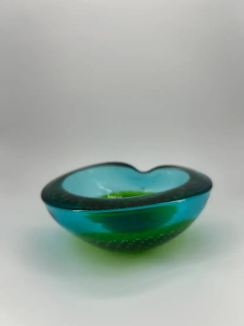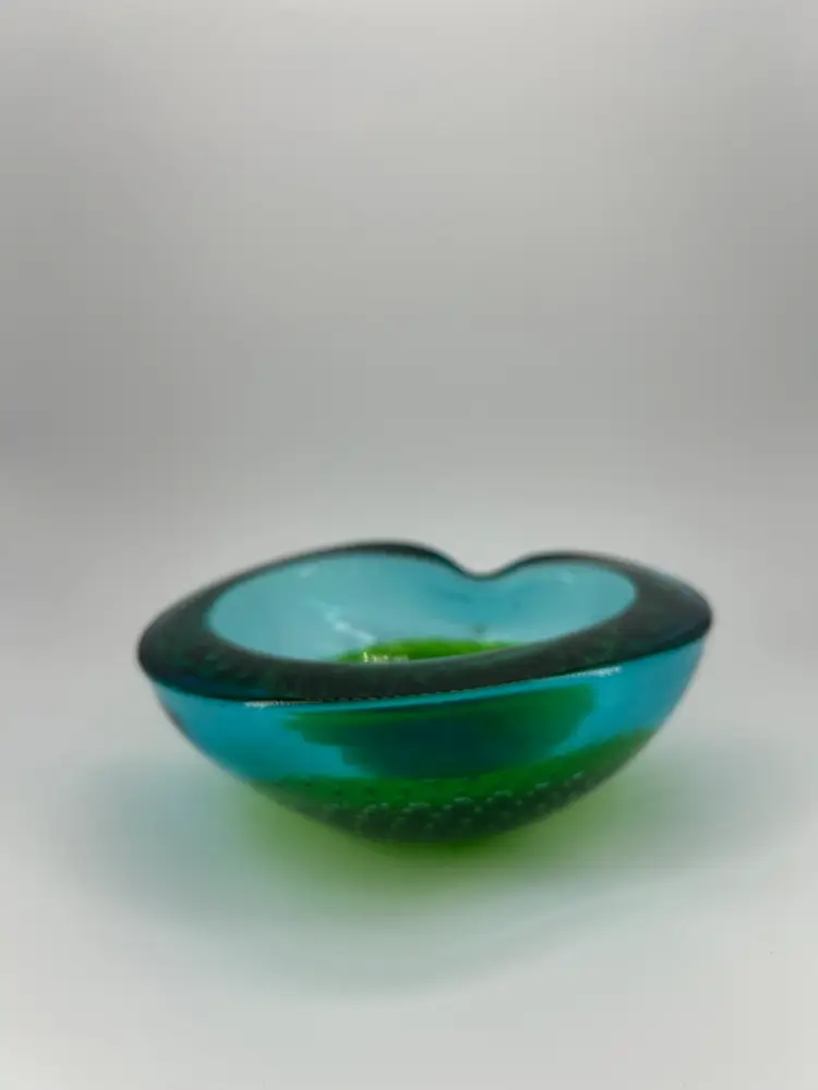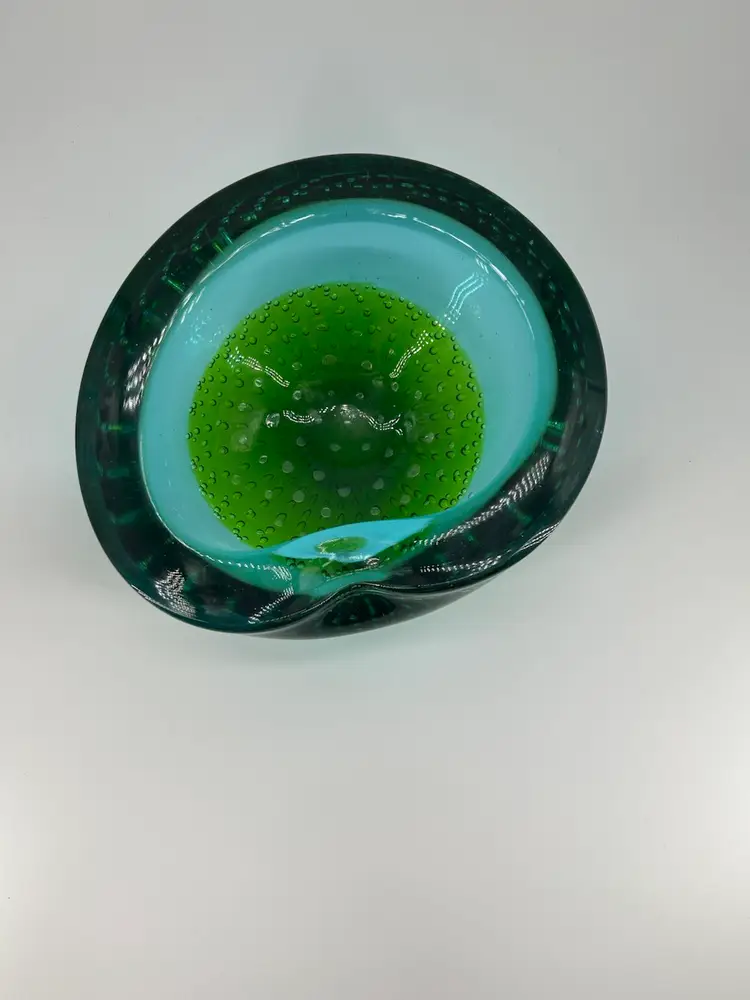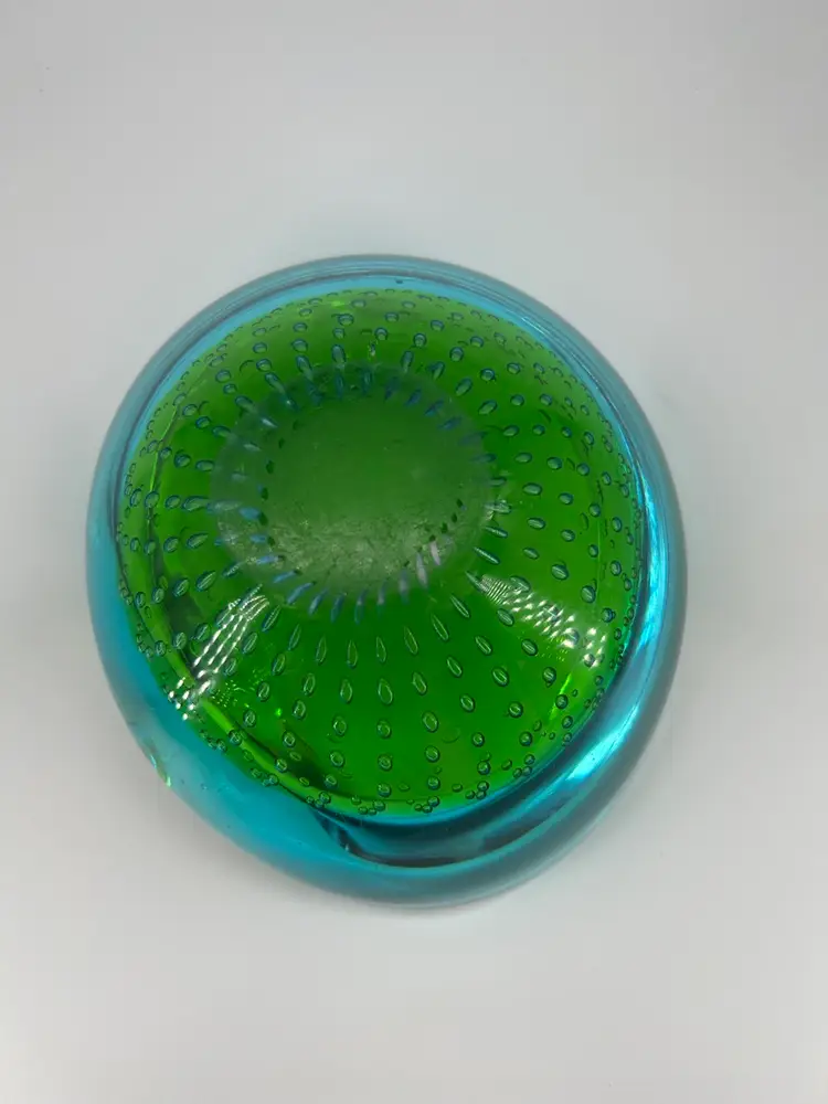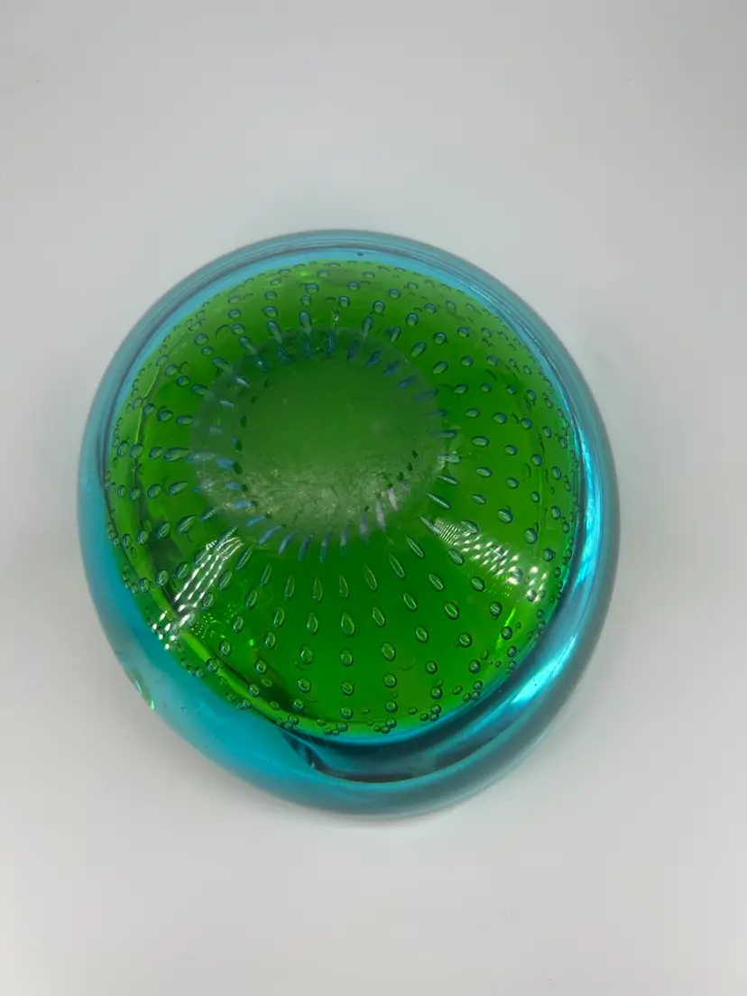 This piece is A MURANO bullicante art glass dish. It stands 2.5 inches tall and 6.5 inches across the top. There are no chips or cracks.