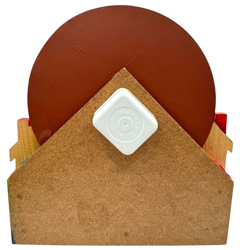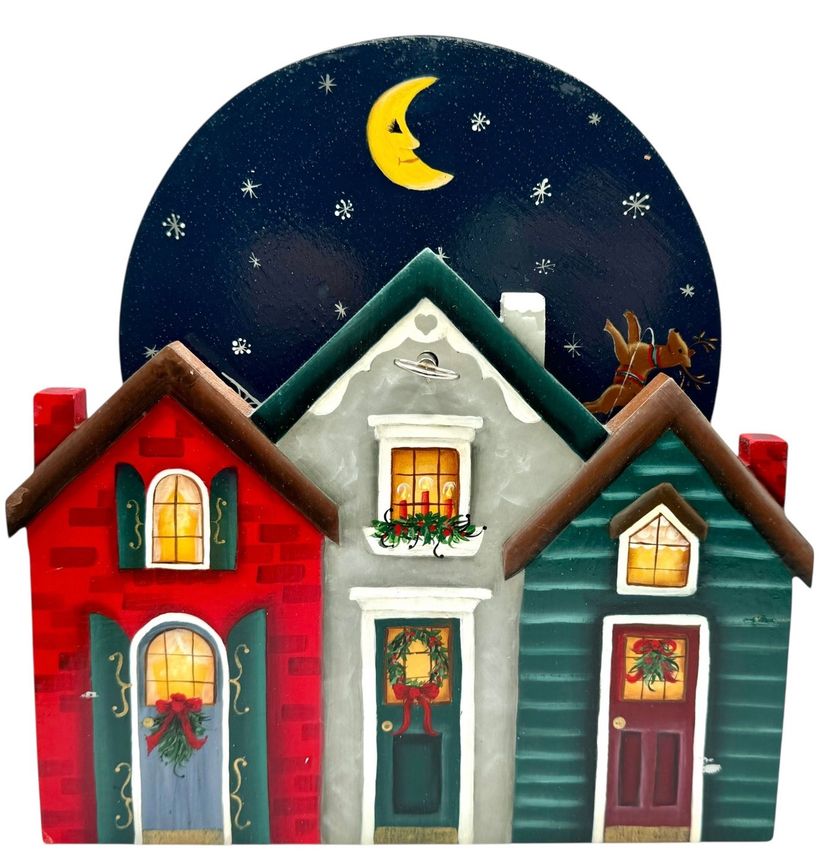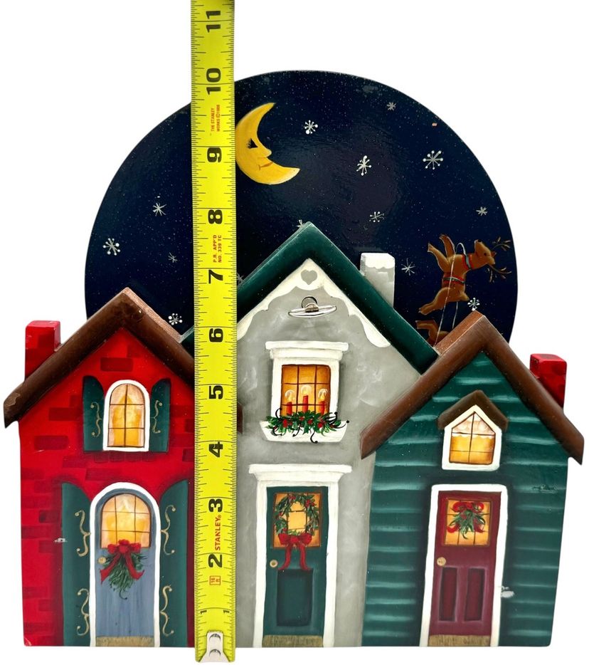 Hand painted wooden street scene with a rotating night sky; Santa and his reindeer flying through the stars. It plays the song ‘Here Comes Santa Claus’.