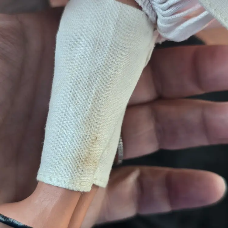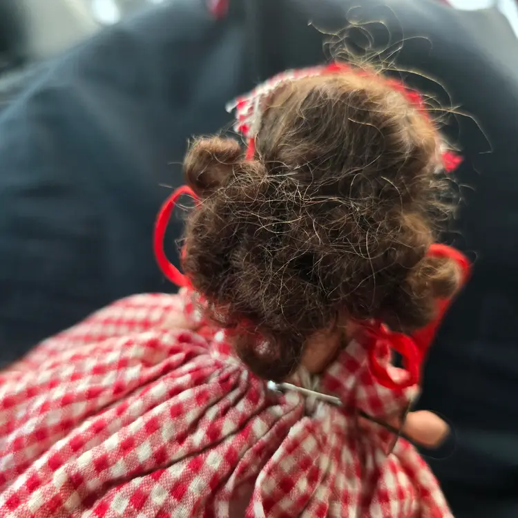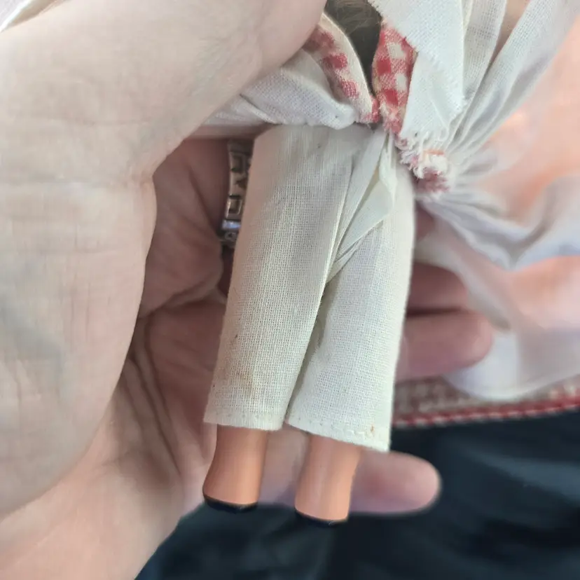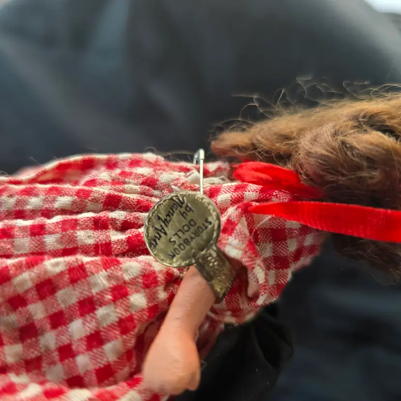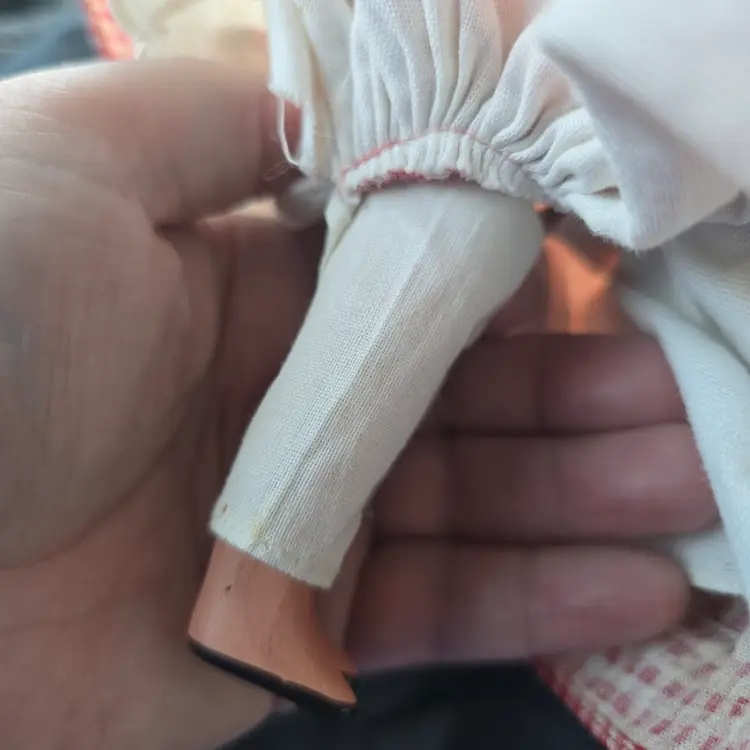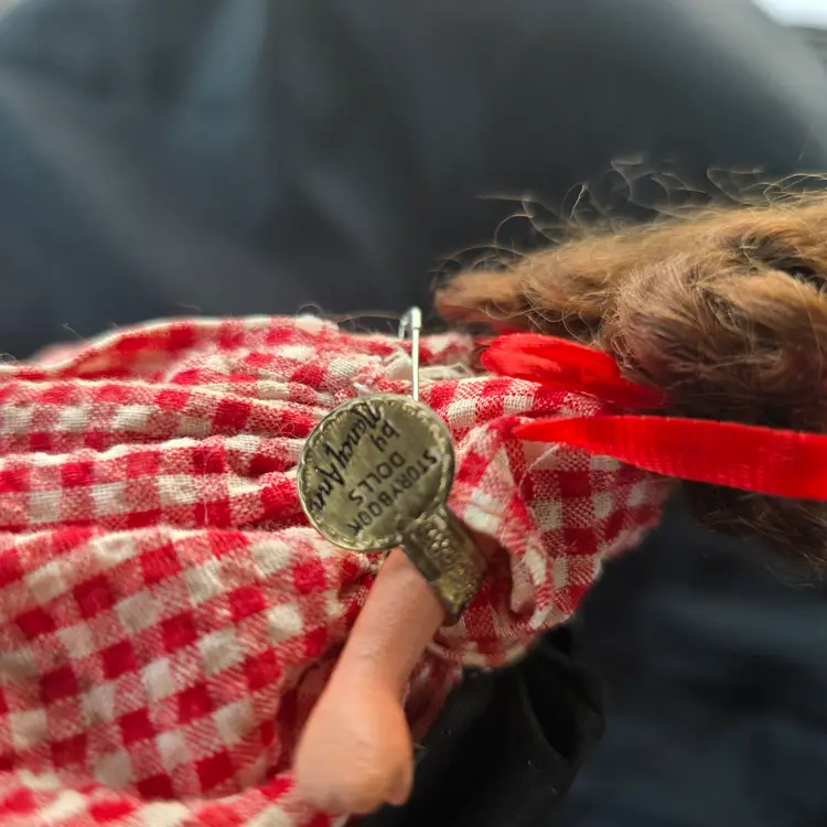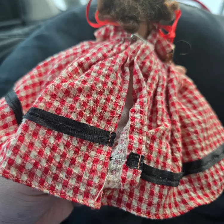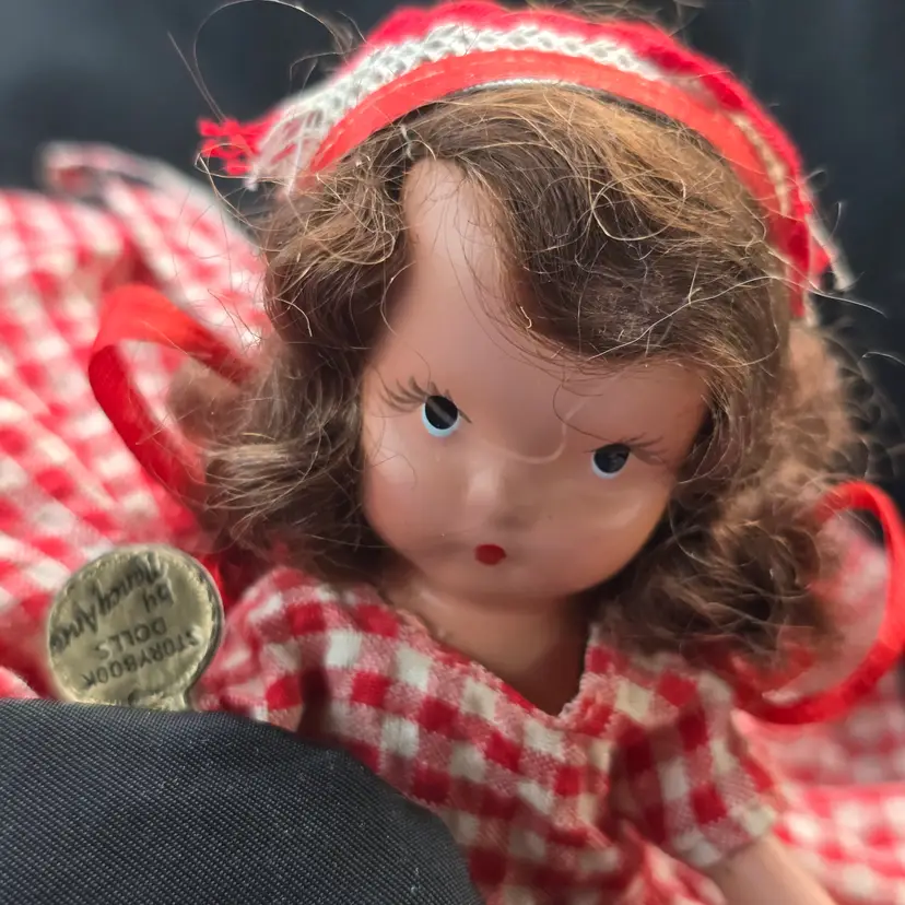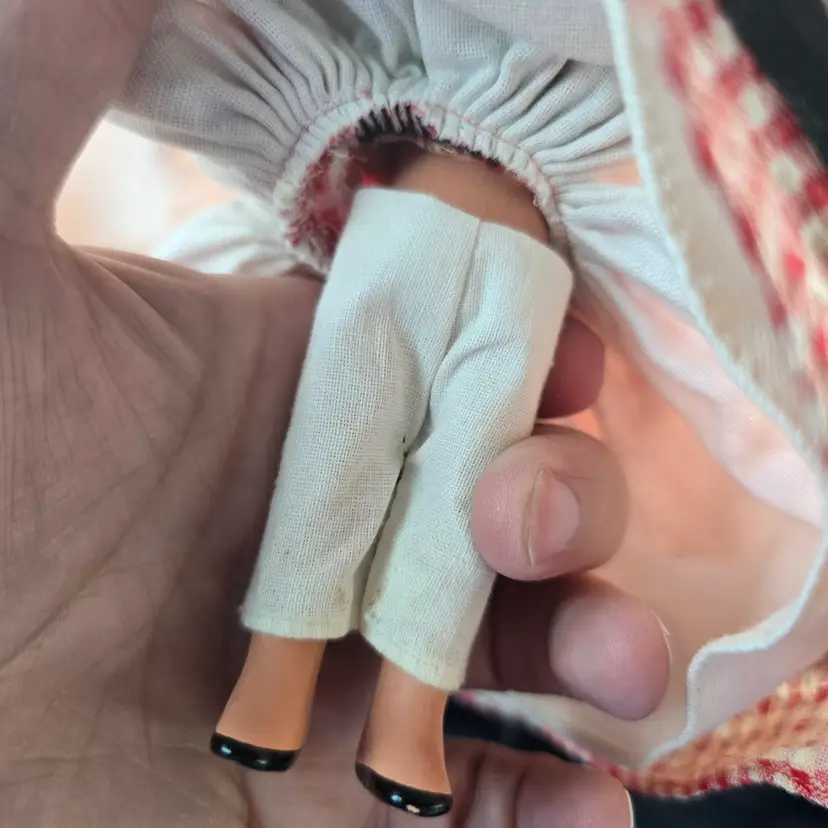 Vintage Nancy Ann Storybook Doll.  Bisque. **MISSING BROOM. Checkered Gingham Dress. Pantaloons have some discoloration. Please see all pictures. Otherwise in nice pre-owned condition for it's age. Smoke free dog friendly hom