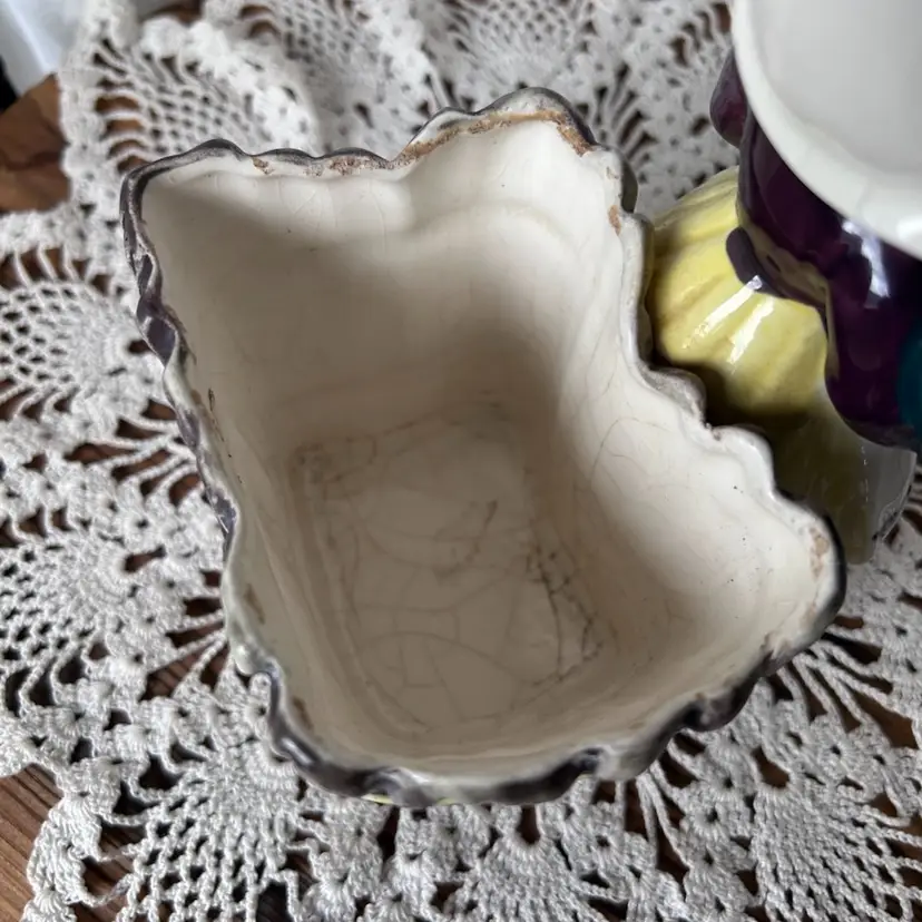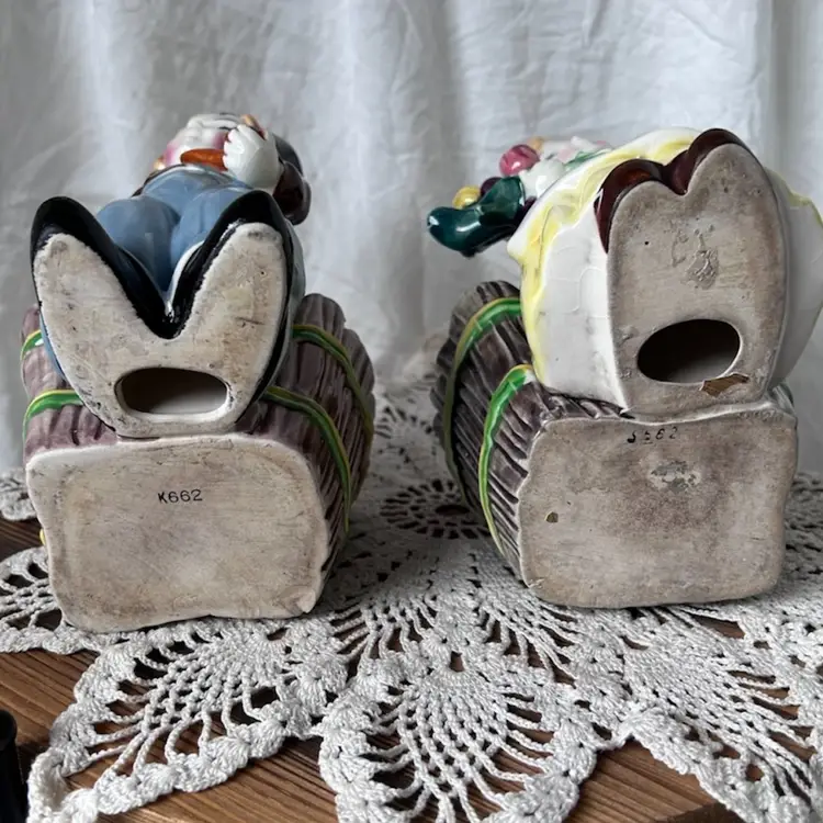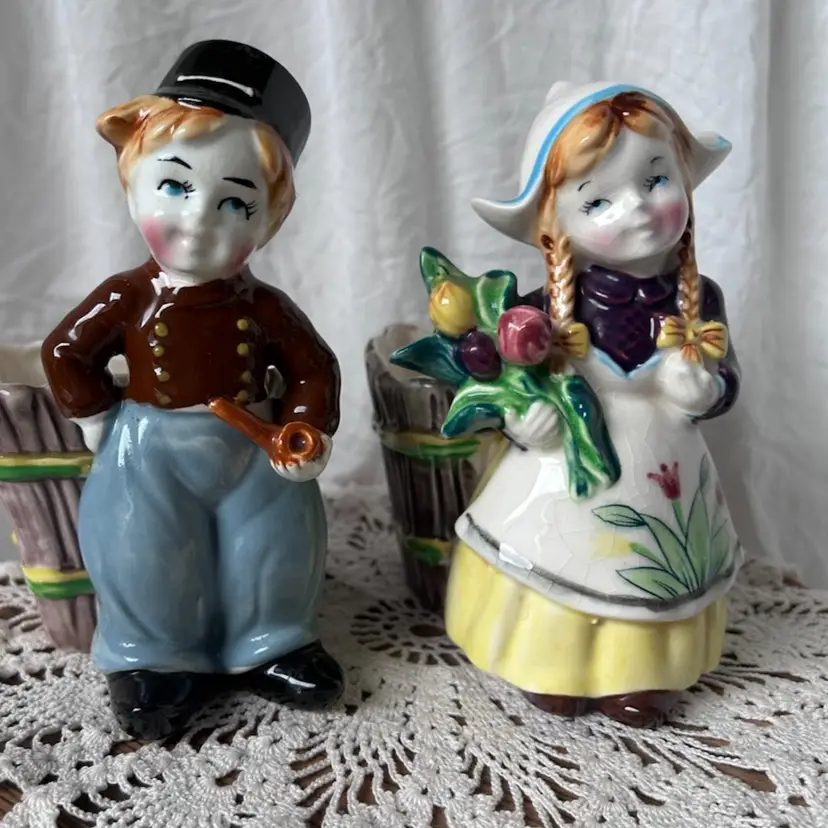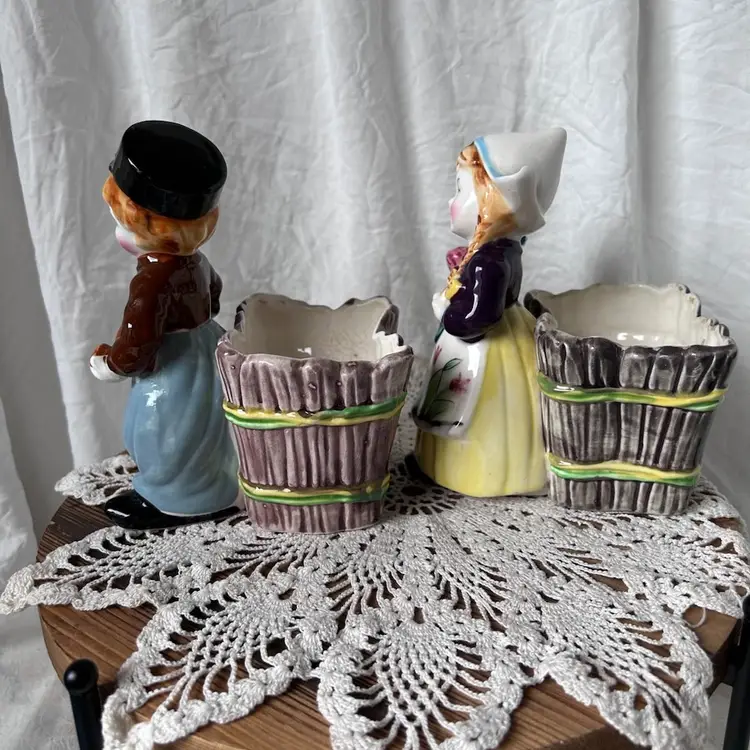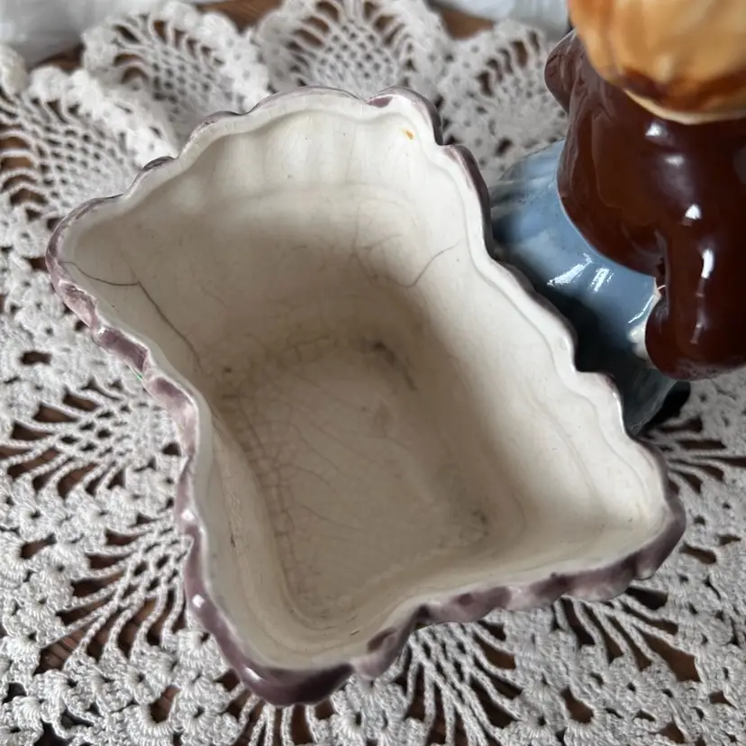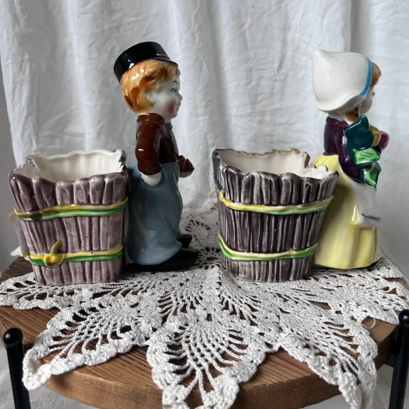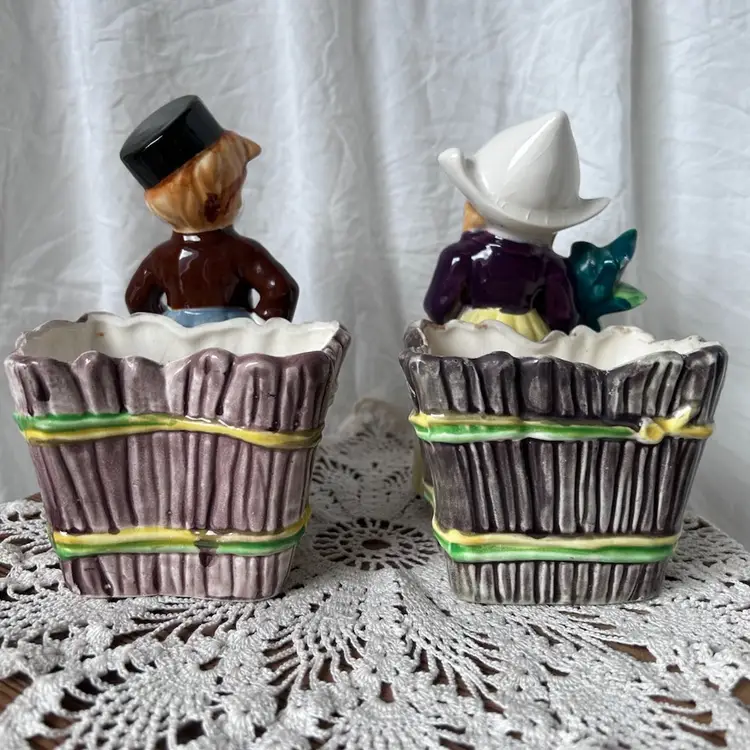 Adorable ceramic planters from the 1950s. Both have age related crazing and the boy has a crack along the back inside of the planter. Paint is still great. They measure 6.5” tall, 4.5” long, and 4” wide and from Japan