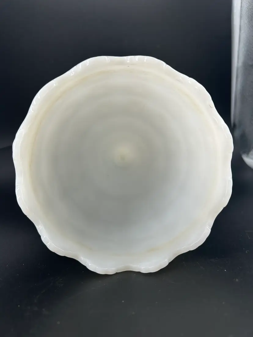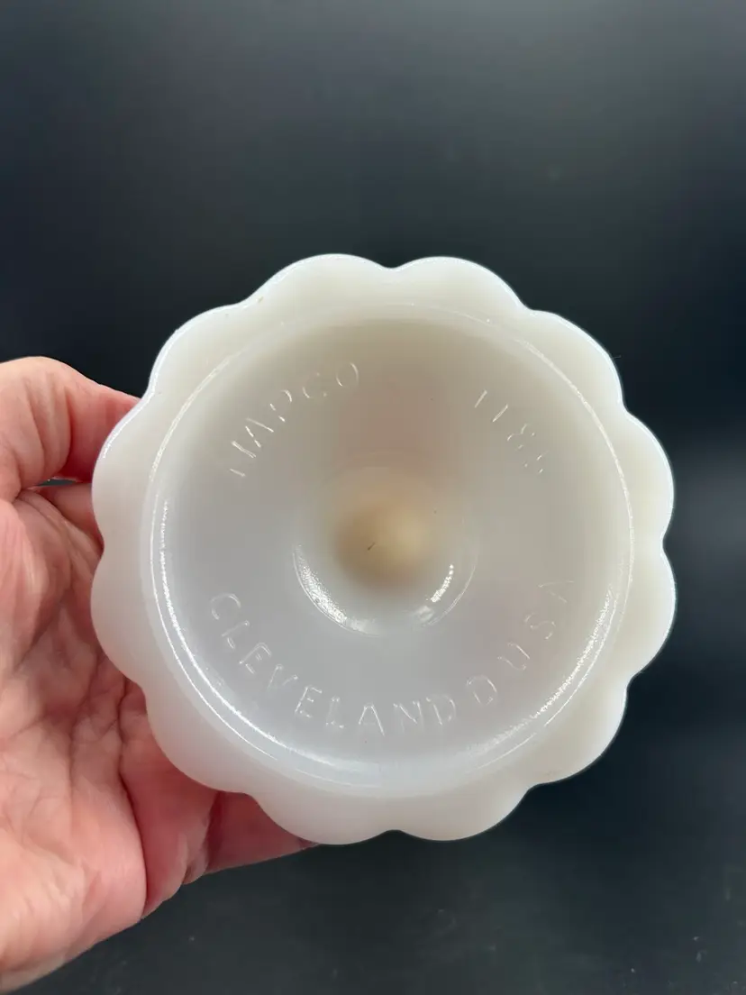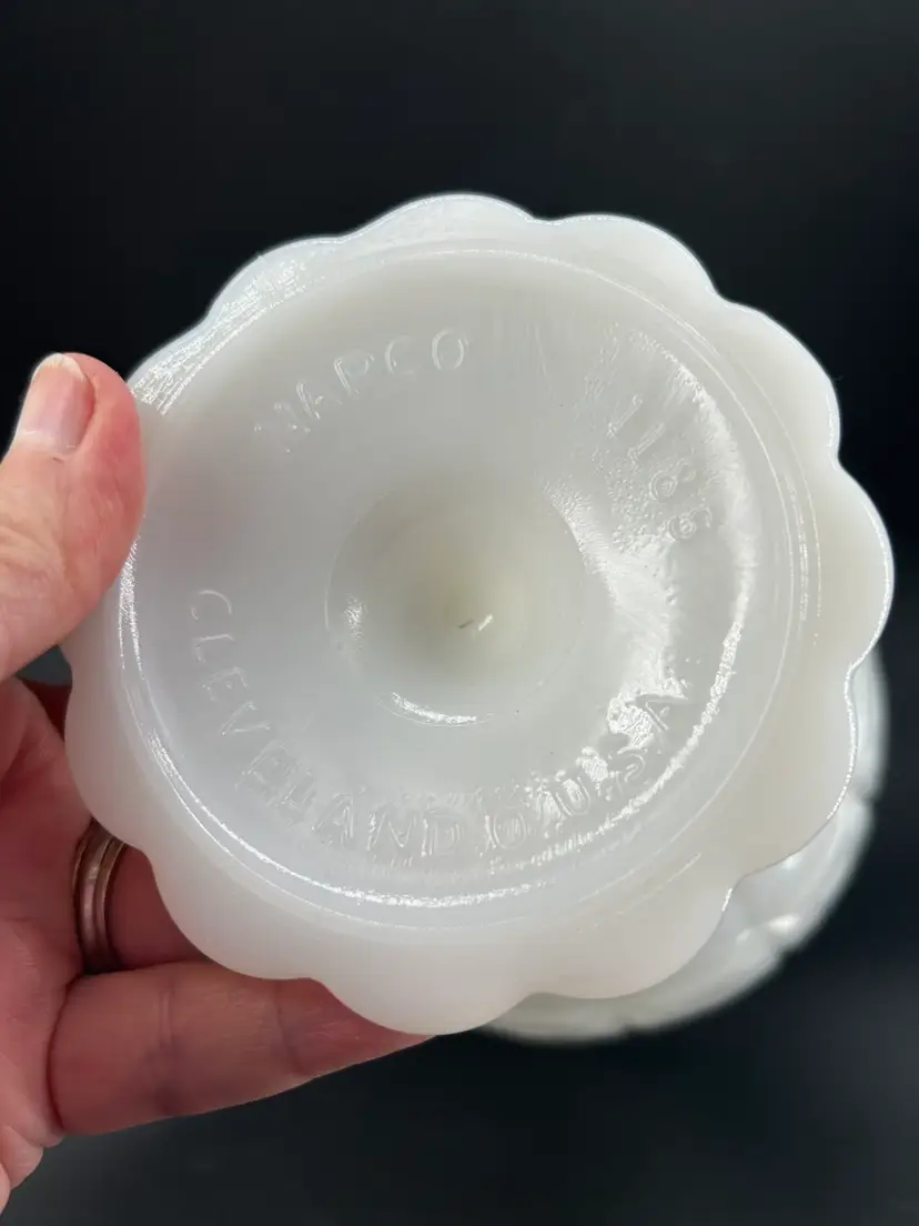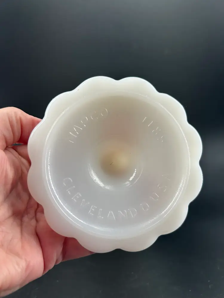 This is a Napco Compote made of milk glass with a quilted pattern. It stands 6.5 inches tall and 5.5 across the top. There are no chips or cracks.