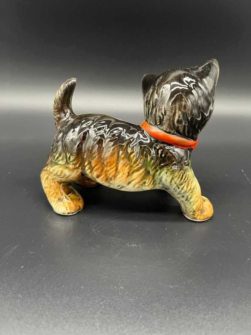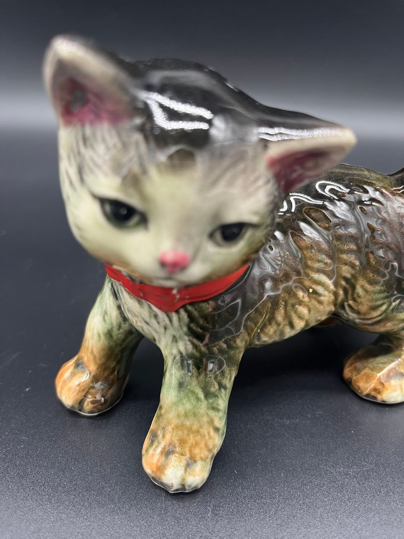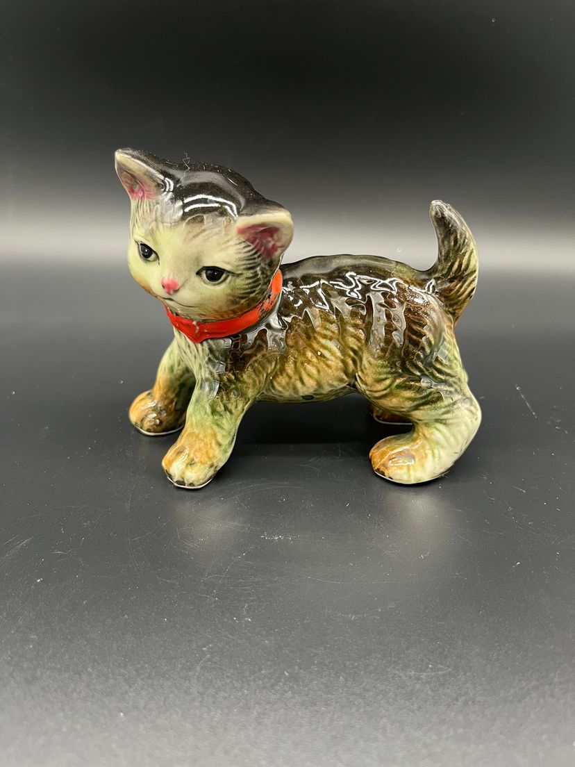 Vintage tabby kitten figurine, likely 1950s. Perfect for figurine collectors, cat lovers and 1950s style decor, this darling kitten with her bright red collar is looking for her forever home.