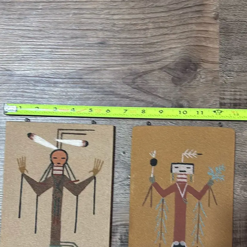 This is an example of vintage Native American Navajo sand paintings or dry painting, which are usually created for healing ceremonies. Male and female figures.