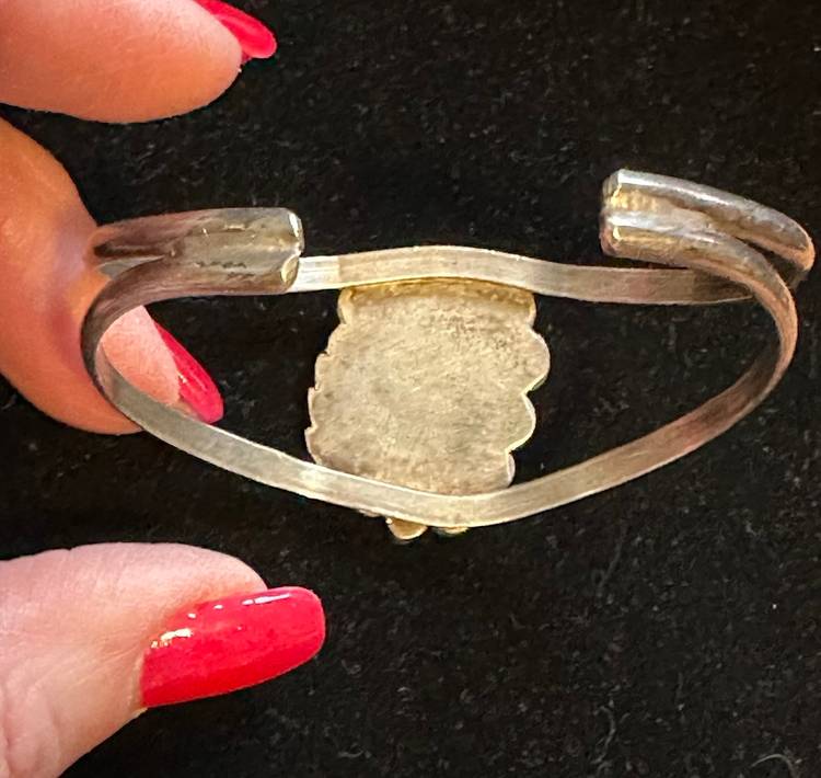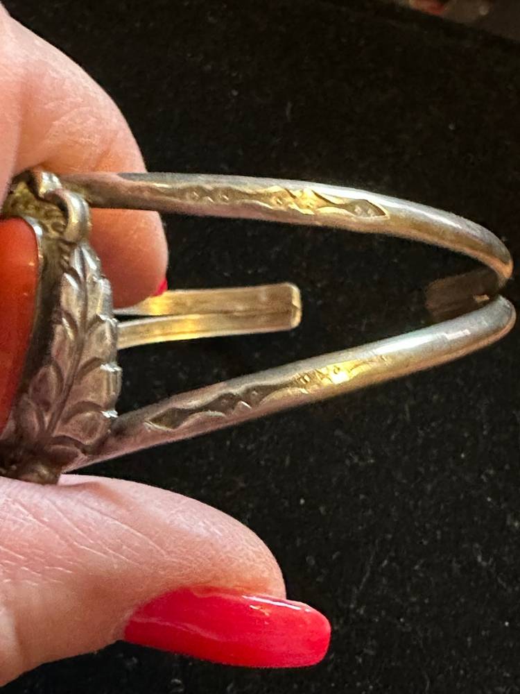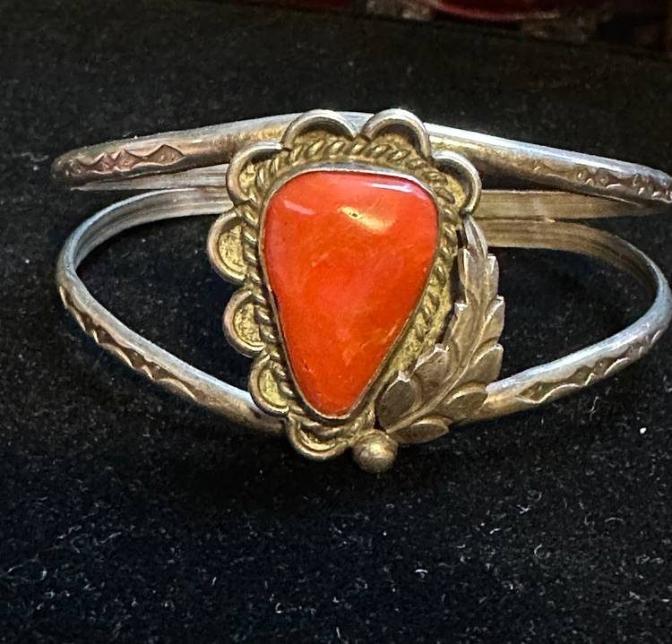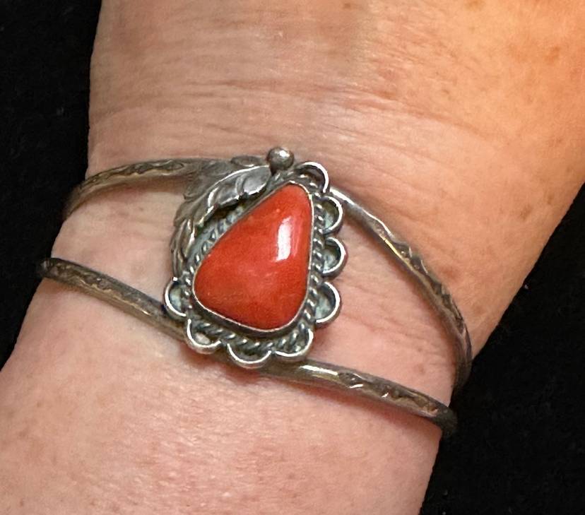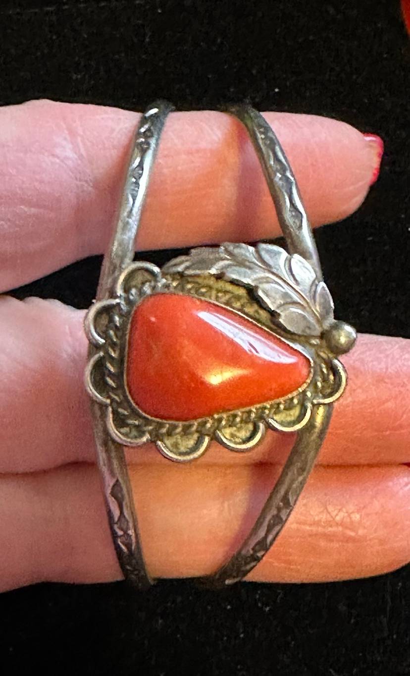 Native American Navajo cuff bracelet is sterling silver with Orange coral. It is 1 1/8” at widest point. Inside round is 5.75” with additional 1” gap. No marking found. Very good condition.